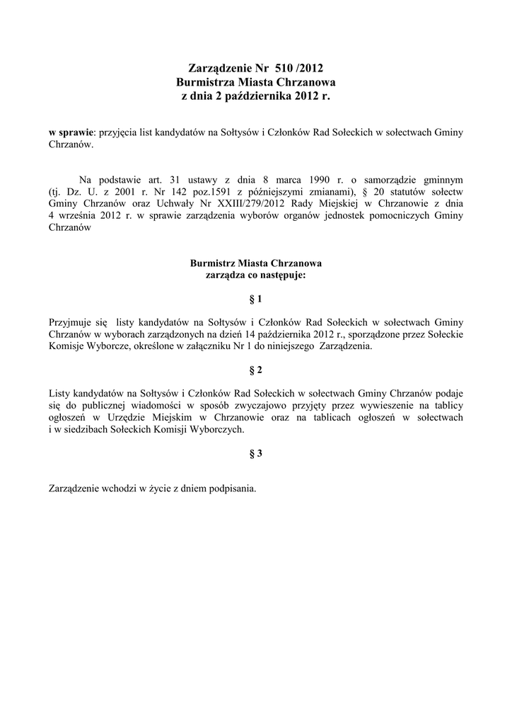 Zarządzenie Nr 510 /2012 Burmistrza Miasta Chrzanowa z dnia 2 października 2012 r. w sprawie: przyjęcia list kandydatów na Sołtysów i Członków Rad Sołeckich w sołectwach Gminy Chrzanów. Na podstawie art. 31 ustawy z dnia 8 marca 1990 r. o samorządzie gminnym (tj. Dz. U. z 2001 r. Nr 142 poz.1591 z późniejszymi zmianami), § 20 statutów sołectw Gminy Chrzanów oraz Uchwały Nr XXIII/279/2012 Rady Miejskiej w Chrzanowie z dnia 4 września 2012 r. w sprawie zarządzenia wyborów organów jednostek pomocniczych Gminy Chrzanów Burmistrz Miasta Chrzanowa zarządza co następuje: §1 Przyjmuje się listy kandydatów na Sołtysów i Członków Rad Sołeckich w sołectwach Gminy Chrzanów w wyborach zarządzonych na dzień 14 października 2012 r., sporządzone przez Sołeckie Komisje Wyborcze, określone w załączniku Nr 1 do niniejszego Zarządzenia. §2 Listy kandydatów na Sołtysów i Członków Rad Sołeckich w sołectwach Gminy Chrzanów podaje się do publicznej wiadomości w sposób zwyczajowo przyjęty przez wywieszenie na tablicy ogłoszeń w Urzędzie Miejskim w Chrzanowie oraz na tablicach ogłoszeń w sołectwach i w siedzibach Sołeckich Komisji Wyborczych. §3 Zarządzenie wchodzi w życie z dniem podpisania. Załącznik nr 1 do Zarządzenia Nr 510 /2012 Burmistrza Miasta Chrzanowa z dnia 2 października 2012 r. WYKAZ KANDYDATÓW NA SOŁTYSÓW I CZŁONKÓW RAD SOŁECKICH W SOŁECTWACH GMINY CHRZANÓW ZGŁOSZONYCH DO WYBORÓW OGŁOSZONYCH NA DZIEŃ 14 PAŹDZIERNIKA 2012 R. Lista kandydatów na Sołtysa w sołectwie zarządzonych na dzień 14 października 2012 r.: Balin w wyborach 1. Cupiał Marek, wiek 49, miejsce zamieszkania Balin, 2. Dusza Stanisław, wiek 57, miejsce zamieszkania Balin, 3. Mikłas Tadeusz, wiek 62, miejsce zamieszkania Balin. Lista kandydatów na Członków Rady Sołeckiej w sołectwie Balin w wyborach zarządzonych na dzień 14 października 2012 r.: 1. Bartosik Mieczysława, wiek 58, miejsce zamieszkania Balin, 2. Chechelski Grzegorz, wiek 40, miejsce zamieszkania Balin, 3. Czerwonka Henryk, wiek 49, miejsce zamieszkania Balin, 4. Dębski Mariusz, wiek 35, miejsce zamieszkania Balin, 5. Dudek Jadwiga, wiek 62, miejsce zamieszkania Balin, 6. Dudek Leszek, wiek 57, miejsce zamieszkania Balin, 7. Fudała Antoni, wiek 56, miejsce zamieszkania Balin, 8. Fudała Zbigniew, wiek 55, miejsce zamieszkania Balin, 9. Knapik Wanda, wiek 58, miejsce zamieszkania Balin, 10.Korlacki Władysław, wiek 62, miejsce zamieszkania Balin, 11.Krauz Marcin, wiek 25, miejsce zamieszkania Balin, 12.Mamica Andrzej, wiek 56, miejsce zamieszkania Balin, 13.Mamica Tadeusz, wiek 57, miejsce zamieszkania Balin, 14.Rajski Adrian, wiek 32, miejsce zamieszkania Balin, 15.Romański Artur, wiek 42, miejsce zamieszkania Balin, 16.Siewniak Grzegorz, wiek 38, miejsce zamieszkania Balin, 17.Skwarek Daniel, wiek 39, miejsce zamieszkania Balin, 18.Warchoł Józefa, wiek 65, miejsce zamieszkania Balin, 19.Zduń Aneta, wiek 37, miejsce zamieszkania Balin. Lista kandydatów na Sołtysa w sołectwie zarządzonych na dzień 14 października 2012 r.: Luszowice w wyborach 1. Hudzik Józef, wiek 53, miejsce zamieszkania Luszowice, 2. Pietrzyk Jadwiga, wiek 60, miejsce zamieszkania Luszowice. Lista kandydatów na Członków Rady Sołeckiej w sołectwie Luszowice w wyborach zarządzonych na dzień 14 października 2012 r.: 1. Baran Ewa, wiek 51, miejsce zamieszkania Luszowice, 2. Cudak Stanisław, wiek 75, miejsce zamieszkania Luszowice, 3. Drąg Robert, wiek 41, miejsce zamieszkania Luszowice, 4. Dudek Henryk, wiek 64, miejsce zamieszkania Luszowice, 5. Kania Małgorzata, wiek 44, miejsce zamieszkania Luszowice, 6. Kasprzyk Anna Maria, wiek 36, miejsce zamieszkania Luszowice, 7. Krupa Stanisław, wiek 60, miejsce zamieszkania Luszowice, 8. Kubik Jolanta, wiek 48, miejsce zamieszkania Luszowice, 9. Obrok Adam, wiek 52, miejsce zamieszkania Luszowice, 10.Szyguła Zygfryd, wiek 48, miejsce zamieszkania Luszowice, 11.Śledziński Ryszard, wiek 62, miejsce zamieszkania Luszowice. Lista kandydatów na Sołtysa w sołectwie Okradziejówka w wyborach zarządzonych na dzień 14 października 2012 r.: 1. Grzyb Małgorzata, wiek 55, miejsce zamieszkania Balin – Okradziejówka. Lista kandydatów na Członków Rady Sołeckiej w sołectwie Okradziejówka w wyborach zarządzonych na dzień 14 października 2012 r.: 1. 2. 3. 4. 5. Kania Zbigniew, wiek 73, miejsce zamieszkania Balin - Okradziejówka, Karbownik Krzysztof, wiek 51, miejsce zamieszkania Balin - Okradziejówka, Michalik Justyna, wiek 27, miejsce zamieszkania Balin - Okradziejówka, Orlaś Stanisław, wiek 62, miejsce zamieszkania Balin - Okradziejówka, Rejman Zofia, wiek 62, miejsce zamieszkania Balin - Okradziejówka, Lista kandydatów na Sołtysa w sołectwie zarządzonych na dzień 14 października 2012 r.: Płaza w wyborach 1. Kowalski Leszek, wiek, 44, miejsce zamieszkania Płaza. Lista kandydatów na Członków Rady Sołeckiej w sołectwie Płaza w wyborach zarządzonych na dzień 14 października 2012 r.: 1. Bąk Józef, wiek 82, miejsce zamieszkania Płaza. 2. Chrząścik Jacek, wiek 43, miejsce zamieszkania Płaza, 3. Dudek Zbigniew, wiek 57, miejsce zamieszkania Płaza, 4. Dusza Andrzej, wiek 30, miejsce zamieszkania Płaza, 5. Gaweł Bronisław, wiek 78, miejsce zamieszkania Płaza, 6. Kopacz Stanisław, wiek 76, miejsce zamieszkania Płaza, 7. Kosowska Maria, wiek 64, miejsce zamieszkania Płaza, 8. Maszewski Mieczysław, wiek 60, miejsce zamieszkania Płaza, 9. Pater Józef, wiek 62, miejsce zamieszkania Płaza, 10.Tekielak Maria, wiek 55, miejsce zamieszkania Płaza. Lista kandydatów na Sołtysa w sołectwie zarządzonych na dzień 14 października 2012 r.: Pogorzyce w wyborach 1. Musiał Zdzisława, wiek 59, miejsce zamieszkania Pogorzyce, 2. Rzepka Marian, wiek 58, miejsce zamieszkania Pogorzyce, 3. Strumiński Piotr , wiek 27, miejsce zamieszkania Pogorzyce. Lista kandydatów na Członków Rady Sołeckiej w sołectwie Pogorzy