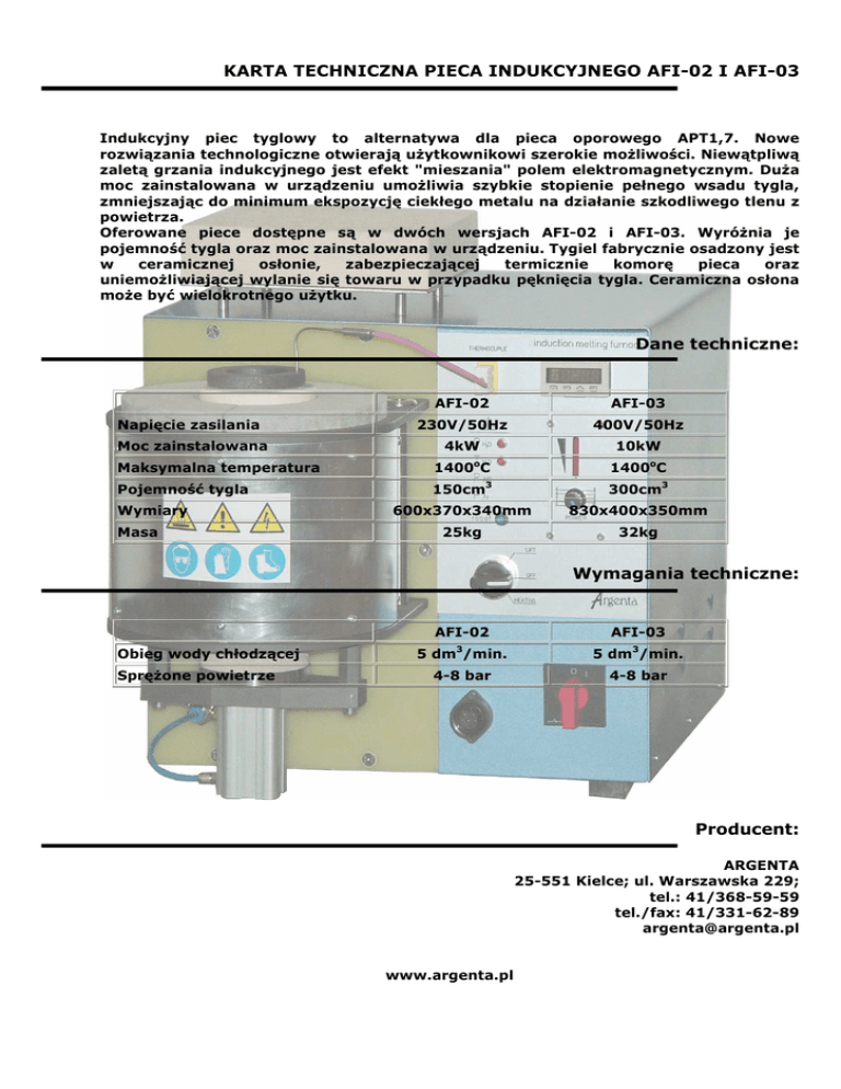 KARTA TECHNICZNA PIECA INDUKCYJNEGO AFI-02 I AFI-03 Indukcyjny piec tyglowy to alternatywa dla pieca oporowego APT1,7. Nowe rozwiązania technologiczne otwierają uŜytkownikowi szerokie moŜliwości. Niewątpliwą zaletą grzania indukcyjnego jest efekt "mieszania" polem elektromagnetycznym. DuŜa moc zainstalowana w urządzeniu umoŜliwia szybkie stopienie pełnego wsadu tygla, zmniejszając do minimum ekspozycję ciekłego metalu na działanie szkodliwego tlenu z powietrza. Oferowane piece dostępne są w dwóch wersjach AFI-02 i AFI-03. WyróŜnia je pojemność tygla oraz moc zainstalowana w urządzeniu. Tygiel fabrycznie osadzony jest w ceramicznej osłonie, zabezpieczającej termicznie komorę pieca oraz uniemoŜliwiającej wylanie się towaru w przypadku pęknięcia tygla. Ceramiczna osłona moŜe być wielokrotnego uŜytku. Dane techniczne: AFI-02 AFI-03 Napięcie zasilania 230V/50Hz 400V/50Hz Moc zainstalowana 4kW 10kW Maksymalna temperatura 1400 C 1400oC Pojemność tygla 150cm3 300cm3 600x370x340mm 830x400x350mm 25kg 32kg Wymiary Masa o Wymagania techniczne: Obieg wody chłodzącej SpręŜone powietrze AFI-02 AFI-03 3 5 dm /min. 5 dm3/min. 4-8 bar 4-8 bar Producent: ARGENTA 25-551 Kielce; ul. Warszawska 229; tel.: 41/368-59-59 tel./fax: 41/331-62-89 [email protected] www.argenta.pl