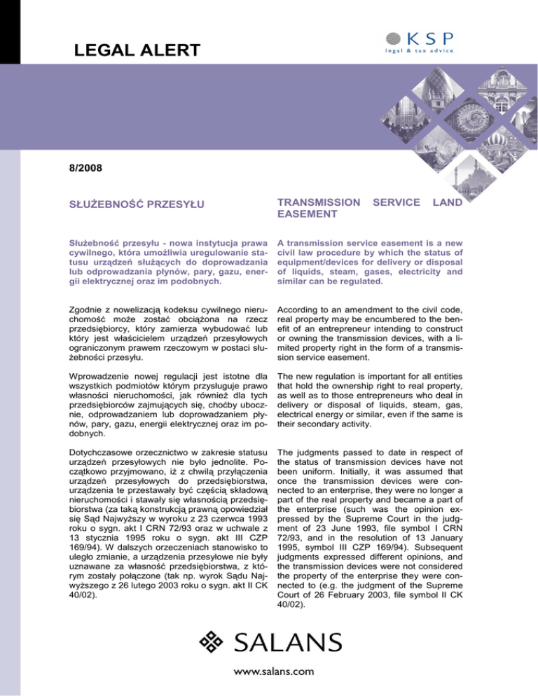 LEGAL ALERT 8/2008 SŁUśEBNOŚĆ PRZESYŁU TRANSMISSION EASEMENT SERVICE LAND SłuŜebność przesyłu - nowa instytucja prawa cywilnego, która umoŜliwia uregulowanie statusu urządzeń słuŜących do doprowadzania lub odprowadzania płynów, pary, gazu, energii elektrycznej oraz im podobnych. A transmission service easement is a new civil law procedure by which the status of equipment/devices for delivery or disposal of liquids, steam, gases, electricity and similar can be regulated. Zgodnie z nowelizacją kodeksu cywilnego nieruchomość moŜe zostać obciąŜona na rzecz przedsiębiorcy, który zamierza wybudować lub który jest właścicielem urządzeń przesyłowych ograniczonym prawem rzeczowym w postaci słuŜebności przesyłu. According to an amendment to the civil code, real property may be encumbered to the benefit of an entrepreneur intending to construct or owning the transmission devices, with a limited property right in the form of a transmission service easement. Wprowadzenie nowej regulacji jest istotne dla wszystkich podmiotów którym przysługuje prawo własności nieruchomości, jak równieŜ dla tych przedsiębiorców zajmujących się, choćby ubocznie, odprowadzaniem lub doprowadzaniem płynów, pary, gazu, energii elektrycznej oraz im podobnych. The new regulation is important for all entities that hold the ownership right to real property, as well as to those entrepreneurs who deal in delivery or disposal of liquids, steam, gas, electrical energy or similar, even if the same is their secondary activity. Dotychczasowe orzecznictwo w zakresie statusu urządzeń przesyłowych nie było jednolite. Początkowo przyjmowano, iŜ z chwilą przyłączenia urządzeń przesyłowych do przedsiębiorstwa, urządzenia te przestawały być częścią składową nieruchomości i stawały się własnością przedsiębiorstwa (za taką konstrukcją prawną opowiedział się Sąd NajwyŜszy w wyroku z 23 czerwca 1993 roku o sygn. akt I CRN 72/93 oraz w uchwale z 13 stycznia 1995 roku o sygn. akt III CZP 169/94). W dalszych orzeczeniach stanowisko to uległo zmianie, a urządzenia przesyłowe nie były uznawane za własność przedsiębiorstwa, z którym zostały połączone (tak np. wyrok Sądu NajwyŜszego z 26 lutego 2003 roku o sygn. akt II CK 40/02). The judgments passed to date in respect of the status of transmission devices have not been uniform. Initially, it was assumed that once the transmission devices were connected to an enterprise, they were no longer a part of the real property and became a part of the enterprise (such was the opinion expressed by the Supreme Court in the judgment of 23 June 1993, file symbol I CRN 72/93, and in the resolution of 13 January 1995, symbol III CZP 169/94). Subsequent judgments expressed different opinions, and the transmission devices were not considered the property of the enterprise they were connected to (e.g. the judgment of the Supreme Court of 26 February 2003, file symbol II CK 40/02). Nowa treść art. 49 § 2 Kodeksu Cywilnego utwierdza w przekonaniu, Ŝe samo podłączenie urządzeń przesyłowych do przedsiębiorstwa nie skutkuje nabyciem przez to przedsiębiorstwo prawa własności takich urządzeń. JednakŜe zarówno przedsiębiorca, jak i osoba która poniosła koszty budowy urządzeń przesyłowych i jest ich właścicielem, moŜe Ŝądać przejęcia przez przedsiębiorstwo tych urządzeń za odpowiednim wynagrodzeniem. W pierwszej kolejności strony mogą uregulować tą kwestię w umowie. Natomiast w przypadku odmowy zawarcia takiej umowy przez którąkolwiek ze stron, moŜliwe jest wystąpienie z odpowiednim Ŝądaniem do sądu. The new wording of article 49 § 2 of the Civil Code acknowledges that the very fact of connecting the transmission devices to an enterprise does not result in acquisition by that enterprise of the property right to such devices. However, both the entrepreneur and the person who has incurred the costs of construction of the transmission equipment and is their owner can request that the enterprise take over the equipment subject to adequate consideration. In the first place, the parties may agree this issue in a contract. In case any party refuses to conclude said contract, a relevant request can be filed with the court. Zgodnie z nowelizacją kodeksu cywilnego nieruchomość moŜe zostać obciąŜona na rzecz przedsiębiorcy, który zamierza wybudować lub który jest właścicielem urządzeń przesyłowych ograniczonym prawem rzeczowym w postaci słuŜebności przesyłu. Po wygaśnięciu słuŜebności przesyłu, przedsiębiorca będzie zobowiązany do usunięcia przedmiotowych urządzeń. Stąd zalecane jest uregulowanie sposobu korzystania z urządzeń przesyłowych bez zbędnej zwłoki. Jedna z moŜliwych interpretacji nowych przepisów moŜe bowiem prowadzić do wniosku, iŜ w związku z brakiem ustanowienia słuŜebności, właściciel nieruchomości będzie uprawniony do wystąpienia z Ŝądaniem usunięcia urządzeń przesyłowych, co dla przedsiębiorcy moŜe stanowić zagroŜenie dla prowadzonej działalności gospodarczej. Z pewnością kwestia ta stanie się przedmiotem orzecznictwa w niedalekiej przyszłości. Upon termination of the transmission service easement, the entrepreneur shall remove said devices. Therefore, it is recommended that the manner of use of transmission devices be regulated with no undue delay. A possible interpretation of the new regulations may lead to a conclusion that if no easement has been established, the real property owner will be entitled to request that the transmission devices are removed, which may be a threat to the entrepreneur’s business activity. This issue will certainly be the subject matter of judgments passed in the near future. * * * Mamy nadzieję, Ŝe powyŜsza informacja będzie dla Państwa pomocna. Informacje te nie stanowią opinii prawnej ani porady. W celu uzyskania pełnych informacji lub porady prawnej prosimy o kontakt.