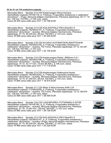 32 do 41 od 134 znaleziono pojazdy Mercedes-Benz Sprinter 214 CDI Kastenwagen Klima Kamera Identyfikator pojazdu FR-KE178_A, Freiburg, Furgonetka dostawcza z nadbudow¹ skrzynkow¹ - d³uga, Skrzynia biegów mechaniczna, Pierwsza rejestracja: 02.17, 10 km, 105 kw( 143 KM ), 2.148 ccm, weiss Cena 28 400 cena netto plus VAT = 33 796 EUR Mercedes-Benz Sprinter 213 CDI KA/L2H2/HOLZ FB/3 Sitze/EU 5 Identyfikator pojazdu 76236G2147_A, Freiburg, Furgonetka dostawcza z nadbudow¹ skrzynkow¹ - wysoka, Skrzynia biegów mechaniczna, Pierwsza rejestracja: 07.14, 80.530 km, 95 kw( 129 KM ), 2.143 ccm, weiss Cena 16 999 cena netto plus VAT = 20 229 EUR Mercedes-Benz Sprinter 216 CDI KA NAVI AUTOMATIK/KLIMA/PTS/AHK Identyfikator pojazdu 76236G2150_A, Freiburg, Furgonetka dostawcza z nadbudow¹ skrzynkow¹ - wysoka, 7G-Tronic, Pierwsza rejestracja: 07.12, 82.291 km, 120 kw( 163 KM ), 2.143 ccm Cena 16 895 cena netto plus VAT = 20 105 EUR Mercedes-Benz Sprinter 310 CDI-Kastenwagen-Radst.-3665mm-3,5 t Identyfikator pojazdu 76236G2196_A, Freiburg, Furgonetka dostawcza z nadbudow¹ skrzynkow¹ - wysoka, Skrzynia biegów mechaniczna, Pierwsza rejestracja: 10.12, 32.171 km, 70 kw( 95 KM ), 2.148 ccm, weiss Cena 14 890 cena netto plus VAT = 17 719 EUR Mercedes-Benz Sprinter 213 CDI-Kastenwagen Seitenwind-Assist. Identyfikator pojazdu 76236G2242_A, Freiburg, Furgonetka dostawcza z nadbudow¹ skrzynkow¹ - wysoka, Skrzynia biegów mechaniczna, Pierwsza rejestracja: 10.14, 81.250 km, 95 kw( 129 KM ), 2.143 ccm, weiss Cena 15 895 cena netto plus VAT = 18 915 EUR Mercedes-Benz Sprinter 311 CDI Mixto 5-Sitze Kamera AHK-3,5t Identyfikator pojazdu 77236G2009_A, Freiburg, Furgonetka dostawcza z nadbudow¹ skrzynkow¹ - wysoka, 7G-Tronic, Pierwsza rejestracja: 12.12, 99.879 km, 120 kw( 163 KM ), 2.143 ccm, silber Cena 23 999 cena netto plus VAT = 28 559 EUR Mercedes-Benz Sprinter 316 CDI L2H2/SPURPA./TOTWINKEL/3-SITZE Identyfikator pojazdu FR-KE790_A_A, Freiburg, Furgonetka dostawcza z nadbudow¹ skrzynkow¹ - wysoka, Skrzynia biegów mechaniczna, Pierwsza rejestracja: 01.16, 10.481 km, 120 kw( 163 KM ), 2.143 ccm, weiss Cena 24 980 cena netto plus VAT = 29 726 EUR Mercedes-Benz Sprinter 213 CDI KA/L2H2/HOLZ FB/3 Sitze/EU 5 Identyfikator pojazdu 76236G2147_A_A, Freiburg, Furgonetka dostawcza z nadbudow¹ skrzynkow¹ - wysoka i d³uga, Skrzynia biegów mechaniczna, Pierwsza rejestracja: 07.14, 80.530 km, 95 kw( 129 KM ), 2.143 ccm, weiss Cena 16 999 cena netto plus VAT = 20 229 EUR Mercedes-Benz Sprinter 310 CDI-Kastenwagen-Radst.-3665mm-3,5 t Identyfikator pojazdu 76236G2196_A_A, Freiburg, Furgonetka dostawcza z nadbudow¹ skrzynkow¹ - wysoka i d³uga, Skrzynia biegów mechaniczna, Pierwsza rejestracja: 10.12, 32.171 km, 70 kw( 95 KM ), 2.148 ccm, weiss Cena 14 890 cena netto plus VAT = 17 719 EUR Mercedes-Benz Sprinter 213 CDI-Kastenwagen Seitenwind-Assist. Identyfikator pojazdu 76236G2242_A_A, Freiburg, Furgonetka dostawcza z nadbudow¹ skrzynkow¹ - wysoka i d³uga, Skrzynia biegów mechaniczna, Pierwsza rejestracja: 10.14, 81.250 km, 95 kw( 129 KM ), 2.143 ccm, weiss Cena 15 895 cena netto plus VAT = 18 915 EUR