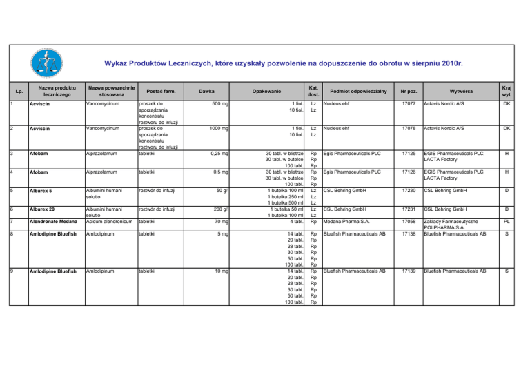 ÓJ YCH CZ URZĄ DR EJ Lp. Wykaz Produktów Leczniczych, które uzyskały pozwolenie na dopuszczenie do obrotu w sierpniu 2010r. OB ODUKTÓ JI PR W AC LE TR C ES I PRODUKTÓ CH W NY BI CZ Y YR CH W OBÓW M ZY ED IC ZN Nazwa produktu leczniczego Nazwa powszechnie stosowana Postać farm. Dawka Kat. dost. Opakowanie Podmiot odpowiedzialny Nr poz. Wytwórca Kraj wyt. 500 mg 1 fiol. 10 fiol. Lz Lz Nucleus ehf 17077 Actavis Nordic A/S DK 1000 mg 1 fiol. 10 fiol. Lz Lz Nucleus ehf 17078 Actavis Nordic A/S DK 0,25 mg 30 tabl. w blistrze 30 tabl. w butelce 100 tabl. 30 tabl. w blistrze 30 tabl. w butelce 100 tabl. 1 butelka 100 ml 1 butelka 250 ml 1 butelka 500 ml 1 butelka 50 ml 1 butelka 100 ml 4 tabl. Rp Rp Rp Rp Rp Rp Lz Lz Lz Lz Lz Rp Egis Pharmaceuticals PLC 17125 EGIS Pharmaceuticals PLC, LACTA Factory H Egis Pharmaceuticals PLC 17126 EGIS Pharmaceuticals PLC, LACTA Factory H CSL Behring GmbH 17230 CSL Behring GmbH D CSL Behring GmbH 17231 CSL Behring GmbH D Medana Pharma S.A. 17058 PL 14 tabl. 20 tabl. 28 tabl. 30 tabl. 50 tabl. 100 tabl. 14 tabl. 20 tabl. 28 tabl. 30 tabl. 50 tabl. 100 tabl. Rp Rp Rp Rp Rp Rp Rp Rp Rp Rp Rp Rp Bluefish Pharmaceuticals AB 17138 Zakłady Farmaceutyczne POLPHARMA S.A. Bluefish Pharmaceuticals AB Bluefish Pharmaceuticals AB 17139 Bluefish Pharmaceuticals AB S 1 Acviscin Vancomycinum 2 Acviscin Vancomycinum 3 Afobam Alprazolamum proszek do sporządzania koncentratu roztworu do infuzji proszek do sporządzania koncentratu roztworu do infuzji tabletki 4 Afobam Alprazolamum tabletki 5 Alburex 5 Albumini humani solutio roztwór do infuzji 50 g/l 6 Alburex 20 roztwór do infuzji 200 g/l 7 Alendronate Medana Albumini humani solutio Acidum alendronicum tabletki 70 mg 8 Amlodipine Bluefish Amlodipinum tabletki 5 mg 9 Amlodipine Bluefish Amlodipinum tabletki 10 mg 0,5 mg S Bluefish Pharmaceuticals AB 17141 Bluefish Pharmaceuticals AB Orion Corporation 17151 Orion Corporation FIN Orion Corporation 17152 Orion Corporation FIN Orion Corporation 17153 Orion Corporation FIN Orion Corporation 17154 Orion Corporation FIN Apotex Europe B.V. 17079 QUISISANA Pharma Deutschland GmbH 17091 Genepharm S.A. Doppel Farmaceutici S.r.l. Pharmaten S.A. GR I GR Rp Rp QUISISANA Pharma Deutschland GmbH 17092 Pharmaten S.A. GR 28 tabl. 30 tabl. Rp Rp QUISISANA Pharma Deutschland GmbH 17093 Pharmaten S.A. GR 28 tabl. 30 tabl. Rp Rp QUISISANA Pharma Deutschland GmbH 17094 Pharmaten S.A. GR 1 mg 28 tabl. Rp Regiomedica GmbH 17143 Regiomedica GmbH 2,5 mg/ml Lz Lz Lz Lz Rp Claris Lifesciences (UK) Ltd. 17192 Claris Lifesciences (UK) Ltd. 17193 3,125 mg 1 fiol. 20 ml 5 fiol. 10 ml 1 fiol. 20 ml 5 fiol. 10 ml 30 tabl. Pfizer Europe MA EEIG 17255 6,25 mg 30 tabl. Rp Pfizer Europe MA EEIG 17256 Pharmasolutions BV Hand Prod Sp. z o.o. Pharmasolutions BV Hand Prod Sp. z o.o. Pfizer Service Company BVBA Pfizer PGM Milpharm Limited Pfizer Service Company BVBA Pfizer PGM Milpharm Limited 28 tabl. 30 tabl. 98 tabl. 100 tabl. 28 tabl. 30 tabl. 56 tabl. 98 tabl. 28 tabl. 30 tabl. 56 tabl. 98 tabl. 28 tabl. 30 tabl. 56 tabl. 98 tabl. 28 tabl. 30 tabl. 56 tabl. 98 tabl. 28 tabl. 30 tabl. 28 tabl. 30 tabl. Rp Rp Rp Rp Rp Rp Rp Rp Rp Rp Rp Rp Rp Rp Rp Rp Rp Rp Rp Rp Rp Rp Rp Rp 10 mg 28 tabl. 30 tabl. 15 mg 20 mg 10 Anastrozol Bluefish Anastrozolum tabletki powlekane 1 mg 11 Anzorin Olanzapinum tabletka ulegająca rozpadowi w jamie ustnej 5 mg 12 Anzorin Olanzapinum tabletki ulegające rozpadowi w jamie ustnej 10 mg 13 Anzorin Olanzapinum tabletki ulegające rozpadowi w jamie ustnej 15 mg 14 Anzorin Olanzapinum 15 Apo-Nastrol Anastrozolum 16 Asterilon Olanzapinum 17 Asterilon Olanzapinum 18 Asterilon Olanzapinum 19 Asterilon Olanzapinum 20 Brestazol Anastrozolum tabletki ulegające rozpadowi w jamie ustnej tabletka ulegająca rozpadowi w jamie ustnej tabletka ulegająca rozpadowi w jamie ustnej tabletka ulegająca rozpadowi w jamie ustnej tabletki powlekane 21 Bupivacaine Claris 22 Bupivacaine Claris 23 Carvedilol Pfizer Bupivacaini hydrochloridum Bupivacaini hydrochloridum Carvedilolum roztwór do wstrzykiwań roztwór do wstrzykiwań tabletki powlekane 24 Carvedilol Pfizer Carvedilolum tabletki powlekane 20 mg tabletki ulegające rozpadowi w jamie ustnej tabletki powlekane 1 mg 5 mg 5 mg/ml S D NL PL NL PL B F GB B F GB Pfizer Service Company BVBA Pfizer PGM Milpharm Limited Pfizer Service Company BVBA Pfizer PGM Milpharm Limited Peckforton Pharmaceuticals Ltd. Hand-Prod Sp. z o.o. B F GB B F GB GB PL 17198 S.C. Sindan-Pharma S.R.L. RO ratiopharm GmbH 17074 Merckle GmbH Zakłady Farmaceutyczne POLPHARMA S.A. Mepha Lda. 16997 Dr. Reddy's Laboratories (UK) Ltd 17164 Biogened S.A 17200 Sofarimex Industria Quimica e Farmaceutica, Lda Medis, d.o.o. Actavis Ltd. SLO MT Biogened S.A 17201 Actavis Ltd. MT 25 Carvedilol Pfizer Carvedilolum tabletki powlekane 12,5 mg 30 tabl. Rp Pfizer Europe MA EEIG 17257 26 Carvedilol Pfizer Carvedilolum tabletki powlekane 25 mg 30 tabl. Rp Pfizer Europe MA EEIG 17258 27 Ciproquin Ciprofloxacinum roztwór do infuzji 2 mg/ml 5 worków po 100 ml 5 worków po 200 ml Rp Rp Claris Lifesciences (UK) Ltd. 17194 28 Clarzole Letrozolum tabletki powlekane 2,5 mg Claviratio tabletki powlekane 875 mg + 125 mg 30 Clogrel Amoxicillinum + Acidum clavulanicum Clopidogrelum tabletki powlekane 75 mg Rp Rp Rp Rp Rp Actavis Group PTC ehf. 29 30 tabl. 60 tabl. 14 tabl. 30 tabl. 28 tabl. 31 Densidron Acidum alendronicum tabletki powlekane 70 mg 2 tabl. 4 tabl. Rp Rp 32 Deprigen Escitalopramum tabletki powlekane 5 mg 33 Deprigen Escitalopramum tabletki powlekane 10 mg 14 tabl. 20 tabl. 28 tabl. 30 tabl. 50 tabl. 56 tabl. 60 tabl. 100 tabl. w blistrze 100 tabl. w pojemniku 200 tabl. 14 tabl. 20 tabl. 28 tabl. 30 tabl. 50 tabl. 56 tabl. 60 tabl. 100 tabl. w blistrze 100 tabl. w pojemniku 200 tabl. Rp Rp Rp Rp Rp Rp Rp Rp Rp Rp Rp Rp Rp Rp Rp Rp Rp Rp Rp Rp D GB P 34 Deprigen Escitalopramum tabletki powlekane 15 mg 35 Deprigen Escitalopramum tabletki powlekane 20 mg 36 Donecleus Donepezili hydrochloridum tabl