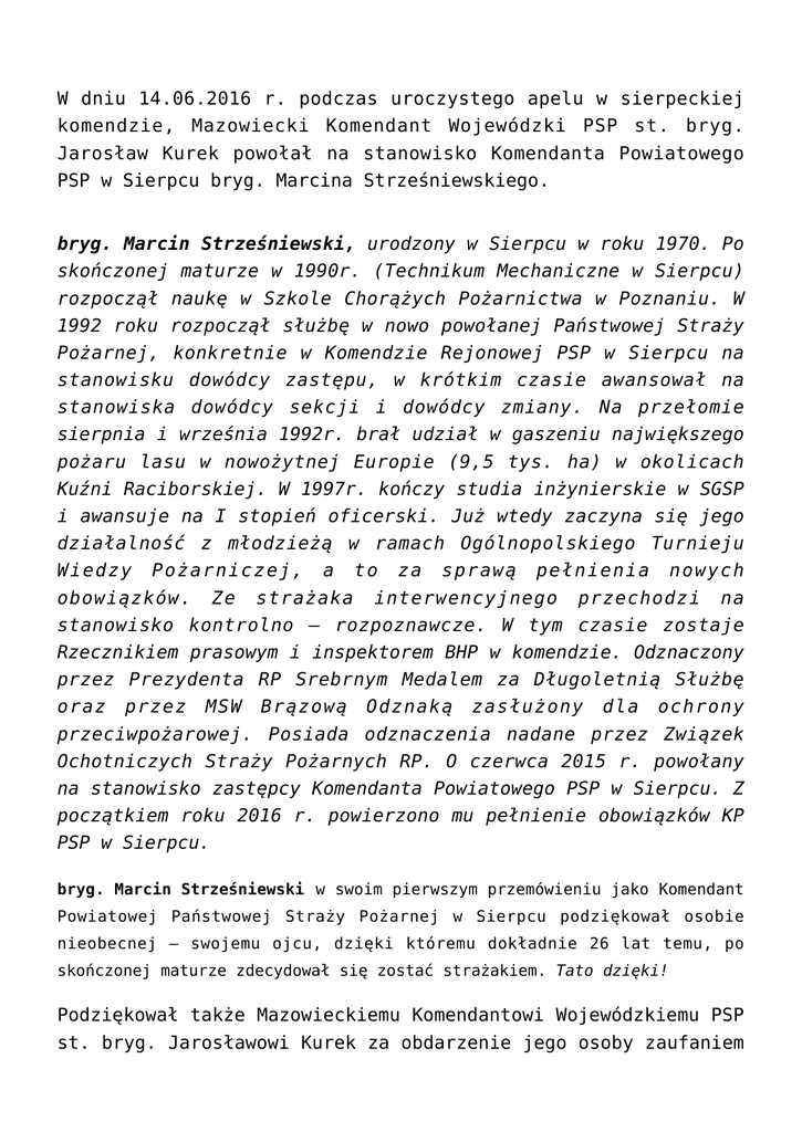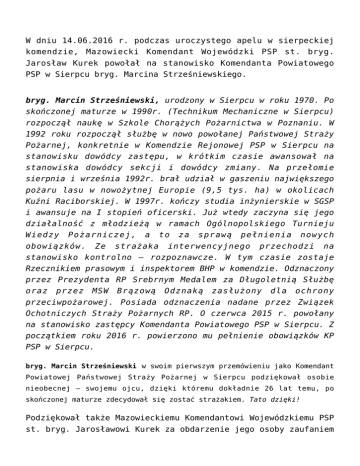 W dniu 14.06.2016 r. podczas uroczystego apelu w sierpeckiej komendzie, Mazowiecki Komendant Wojewódzki PSP st. bryg. Jarosław Kurek powołał na stanowisko Komendanta Powiatowego PSP w Sierpcu bryg. Marcina Strześniewskiego. bryg. Marcin Strześniewski, urodzony w Sierpcu w roku 1970. Po skończonej maturze w 1990r. (Technikum Mechaniczne w Sierpcu) rozpoczął naukę w Szkole Chorążych Pożarnictwa w Poznaniu. W 1992 roku rozpoczął służbę w nowo powołanej Państwowej Straży Pożarnej, konkretnie w Komendzie Rejonowej PSP w Sierpcu na stanowisku dowódcy zastępu, w krótkim czasie awansował na stanowiska dowódcy sekcji i dowódcy zmiany. Na przełomie sierpnia i września 1992r. brał udział w gaszeniu największego pożaru lasu w nowożytnej Europie (9,5 tys. ha) w okolicach Kuźni Raciborskiej. W 1997r. kończy studia inżynierskie w SGSP i awansuje na I stopień oficerski. Już wtedy zaczyna się jego działalność z młodzieżą w ramach Ogólnopolskiego Turnieju Wiedzy Pożarniczej, a to za sprawą pełnienia nowych obowiązków. Ze strażaka interwencyjnego przechodzi na stanowisko kontrolno – rozpoznawcze. W tym czasie zostaje Rzecznikiem prasowym i inspektorem BHP w komendzie. Odznaczony przez Prezydenta RP Srebrnym Medalem za Długoletnią Służbę oraz przez MSW Brązową Odznaką zasłużony dla ochrony przeciwpożarowej. Posiada odznaczenia nadane przez Związek Ochotniczych Straży Pożarnych RP. O czerwca 2015 r. powołany na stanowisko zastępcy Komendanta Powiatowego PSP w Sierpcu. Z początkiem roku 2016 r. powierzono mu pełnienie obowiązków KP PSP w Sierpcu. bryg. Marcin Strześniewski w swoim pierwszym przemówieniu jako Komendant Powiatowej Państwowej Straży Pożarnej w Sierpcu podziękował osobie nieobecnej – swojemu ojcu, dzięki któremu dokładnie 26 lat temu, po skończonej maturze zdecydował się zostać strażakiem. Tato dzięki! Podziękował także Mazowieckiemu Komendantowi Wojewódzkiemu PSP st. bryg. Jarosławowi Kurek za obdarzenie jego osoby zaufaniem i powołaniem na stanowisko Komendanta Powiatowego Państwowej Straży Pożarnej w Sierpcu. Słowa podziękowania skierował również do Pan Posła Waldemara Olejniczaka, Starosty Sierpeckiego Jana Laskowskiego, Radnych, samorządowców za poparcie jego osoby na stanowisko komendanta – za poparcie Komendanta rodem z naszego terenu – dodał. Szczególne słowa podziękowań skierował do swojej Rodziny – za wsparcie, za bycie przy mnie, ale i za kubeł zimnej wody w momentach gdy moja głowa za bardzo się grzeje. Nie zapomniał podziękować swojej załodze, której poparcie wciąż odczuwa. Nowy Komendant Powiatowej Państwowej Straży Pożarnej w Sierpcu