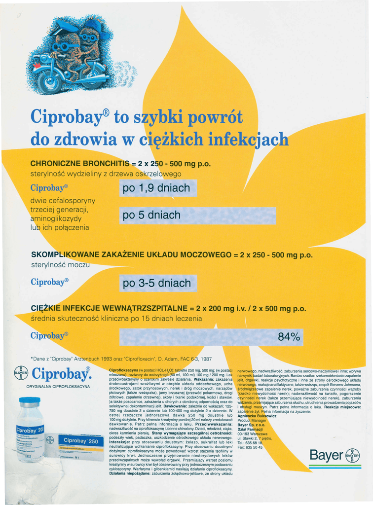 Ciprobay® to szybki powrót do zdrowia w ciężkich infekcjac CHRONICZNE BRONCHITIS = 2 x 250 . 500 mg p.o. sterylność wydzieliny z drzewa oskrzelowego Ciprobay® po 1,9 dniach dwie cefalosporyny trzeciej generacji, aminoglikozydy lub ich połączenia po 5 dniach SKOMPLIKOWANE sterylność moczu Ciprobay® ZAKAŻENIE UKŁADU MOCZOWEGO = 2 x 250·500 mg p.o. po 3-5 dniach = CIĘŻKIE INFEKCJE WEWNĄTRZSZPITALNE 2 x 200 mg Lv./2 x 500 mg p.o. średnia skuteczność kliniczna po 15 dniach leczenia Ciprobay® EB CiprobaY. Ciprobay 250 Ciprofloksacyna (w postaci Hel-H,O): tabletki 250 mg, 500 mg; (w postaci mleczanu): roztwory do wstrzyknięć (50 mi, 100 mi) 100 mg 1200 mg. lek przeciwbakteryjny o szerokim zakresie działania. Wskazania: zakażenia drobnoustrojami wrażliwymi w obrębie układu oddechowego, ucha środkowego, zatok przynosowych, nerek i dróg moczowych, narządów płciowych (także rzeżączka), jamy brzusznej (przewód pokarmowy, drogi żółciowe, zapalenie otrzewnej), skóry i tkanki podskórnej, kości i stawów, ja także posocznice, zakażenia u chorych z obniżoną odpornością oraz do selektywnej dekontaminacji jelit. Dawkowanie: zależnie od wskazań; 125750 mg doustnie 2 x dziennie lub 100-400 mg dożylnie 2 x dziennie. W ostrej rzeżączce jednorazowa dawka 250 mg doustnie lub 100 mg dożylnie. Przy klirensie kreatyniny poniżej 20 mi należy zredukować dawkowanie. Patrz pełna informacja o leku. Przeciwwskazania: nadwrażliwośćna ciprotloksacynę lub inne chinolony.Dzieci, młodzież,ciąża, okres karmienia piersią. Stany wymagające szczególnej ostrożności: podeszły wiek, padaczka, uszkodzenie ośrodkowego układu nerwowego. Interakcje: przy stosowaniu doustnym: żelazo, sukraltat lub leki neutralizujące wchłanianie ciprofloksacyny. Przy stosowaniu doustnymi dożylnym: ciprofloksacyna może powodować wzrost stężenia teofiliny w surowicy krwi. Jednoczesne przyjmowanie niesterydowych leków przeciwzapalnych może wywołać drgawki. Przemijający wzrost poziomu kreatyniny w surowicy krwi był obserwowany przy jednoczesnym podawaniu cyklosporyny. Wartaryna i glibenklamid nasilają działanie ciprofloksacyny. Działania niepożądane: zaburzenia żołądkowo-jelitowe, ze strony układu nerwowego, nadwrażliwość, zaburzenia sercowoMnaczyniowe i inne; wpływa na wyniki badań laboratoryjnych.Bardzo rzadko: rzekomobloniastezapalenie jelit, drgawki, reakcje psychotyczne i inne ze strony ośrodkowego ukfadu nerwowego,reakcjeanafilaktyczne,także wstrząs, zespół Stevens-Johnsona, śródmiąższowe zapalenie nerek, poważne zaburzenia czynności wątroby (rzadko niewydolność nerek); nadwrażliwość na światło, pogorszenie czynności nerek (także przemijająca niewydolność nerek), zaburzenia widzenia, przemijające zaburzenia słuchu. utrudnienia prowadzenia pojazdów i obsługi maszyn. Patrz pełna informacja o leku. Reakcje miejscowe: zapalenie żył. Pełna informacja na życzenie: Agnieszka Buksowicz Produet Manager Bayer Sp. z 0.0. Dział Farmacji 00-193 Warszawa ul. Stawki 2, 7 piętro, Tel.: 635 68 18, Fax: 635 50 45 Bayer B A BA~ER R