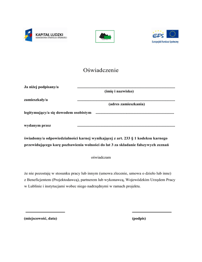 Oświadczenie Ja niŜej podpisany/a ................................................................................................ (imię i nazwisko) zamieszkały/a ................................................................................................ (adres zamieszkania) legitymujący/a się dowodem osobistym wydanym przez ............................................................................. ................................................................................................ świadomy/a odpowiedzialności karnej wynikającej z art. 233 § 1 kodeksu karnego przewidującego karę pozbawienia wolności do lat 3 za składanie fałszywych zeznań oświadczam Ŝe nie pozostaję w stosunku pracy lub innym (umowa zlecenie, umowa o dzieło lub inne) z Beneficjentem (Projektodawcą), partnerem lub wykonawcą, Wojewódzkim Urzędem Pracy w Lublinie i instytucjami wobec niego nadrzędnymi w ramach projektu. (miejscowość, data) (podpis)