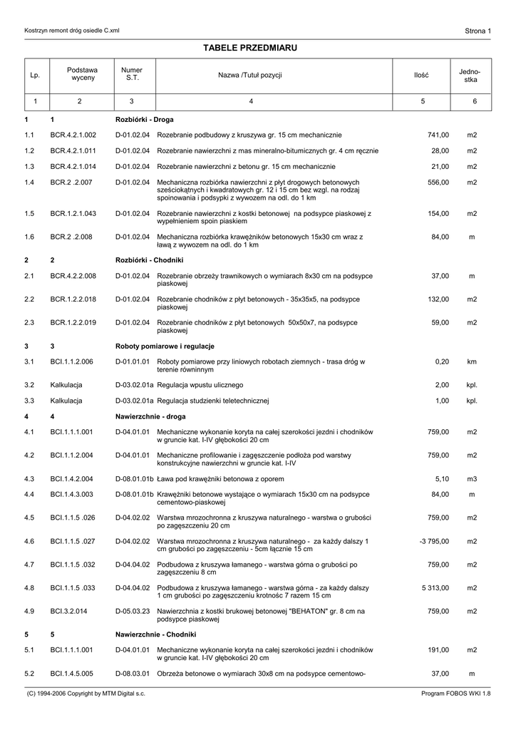 Kostrzyn remont dróg osiedle C.xml Strona 1 TABELE PRZEDMIARU Podstawa wyceny Lp. 1 2 Numer S.T. Nazwa /Tutuł pozycji Ilość 3 4 5 1 1 Rozbiórki - Droga 1.1 BCR.4.2.1.002 D-01.02.04 Rozebranie podbudowy z kruszywa gr. 15 cm mechanicznie 1.2 BCR.4.2.1.011 D-01.02.04 1.3 BCR.4.2.1.014 1.4 Jednostka 6 741,00 m2 Rozebranie nawierzchni z mas mineralno-bitumicznych gr. 4 cm ręcznie 28,00 m2 D-01.02.04 Rozebranie nawierzchni z betonu gr. 15 cm mechanicznie 21,00 m2 BCR.2 .2.007 D-01.02.04 Mechaniczna rozbiórka nawierzchni z płyt drogowych betonowych sześciokątnych i kwadratowych gr. 12 i 15 cm bez wzgl. na rodzaj spoinowania i podsypki z wywozem na odl. do 1 km 556,00 m2 1.5 BCR.1.2.1.043 D-01.02.04 Rozebranie nawierzchni z kostki betonowej na podsypce piaskowej z wypełnieniem spoin piaskiem 154,00 m2 1.6 BCR.2 .2.008 D-01.02.04 Mechaniczna rozbiórka krawęŜników betonowych 15x30 cm wraz z ławą z wywozem na odl. do 1 km 84,00 m 2 2 Rozbiórki - Chodniki 2.1 BCR.4.2.2.008 D-01.02.04 Rozebranie obrzeŜy trawnikowych o wymiarach 8x30 cm na podsypce piaskowej 37,00 m 2.2 BCR.1.2.2.018 D-01.02.04 Rozebranie chodników z płyt betonowych - 35x35x5, na podsypce piaskowej 132,00 m2 2.3 BCR.1.2.2.019 D-01.02.04 Rozebranie chodników z płyt betonowych 50x50x7, na podsypce piaskowej 59,00 m2 3 3 Roboty pomiarowe i regulacje 3.1 BCI.1.1.2.006 D-01.01.01 0,20 km 3.2 Kalkulacja D-03.02.01a Regulacja wpustu ulicznego 2,00 kpl. 3.3 Kalkulacja D-03.02.01a Regulacja studzienki teletechnicznej 1,00 kpl. 4 4 Nawierzchnie - droga 4.1 BCI.1.1.1.001 D-04.01.01 Mechaniczne wykonanie koryta na całej szerokości jezdni i chodników w gruncie kat. I-IV głębokości 20 cm 759,00 m2 4.2 BCI.1.1.2.004 D-04.01.01 Mechaniczne profilowanie i zagęszczenie podłoŜa pod warstwy konstrukcyjne nawierzchni w gruncie kat. I-IV 759,00 m2 4.3 BCI.1.4.2.004 D-08.01.01b Ława pod krawęŜniki betonowa z oporem 5,10 m3 4.4 BCI.1.4.3.003 D-08.01.01b KrawęŜniki betonowe wystające o wymiarach 15x30 cm na podsypce cementowo-piaskowej 84,00 m 4.5 BCI.1.1.5 .026 D-04.02.02 Warstwa mrozochronna z kruszywa naturalnego - warstwa o grubości po zagęszczeniu 20 cm 759,00 m2 4.6 BCI.1.1.5 .027 D-04.02.02 Warstwa mrozochronna z kruszywa naturalnego - za kaŜdy dalszy 1 cm grubości po zagęszczeniu - 5cm łącznie 15 cm -3 795,00 m2 4.7 BCI.1.1.5 .032 D-04.04.02 Podbudowa z kruszywa łamanego - warstwa górna o grubości po zagęszczeniu 8 cm 759,00 m2 4.8 BCI.1.1.5 .033 D-04.04.02 Podbudowa z kruszywa łamanego - warstwa górna - za kaŜdy dalszy 1 cm grubości po zagęszczeniu krotnośc 7 razem 15 cm 5 313,00 m2 4.9 BCI.3.2.014 D-05.03.23 Nawierzchnia z kostki brukowej betonowej "BEHATON" gr. 8 cm na podsypce piaskowej 759,00 m2 5 5 Nawierzchnie - Chodniki 5.1 BCI.1.1.1.001 D-04.01.01 Mechaniczne wykonanie koryta na całej szerokości jezdni i chodników w gruncie kat. I-IV głębokości 20 cm 191,00 m2 5.2 BCI.1.4.5.005 D-08.03.01 ObrzeŜa betonowe o wymiarach 30x8 cm na podsypce cementowo- 37,00 m (C) 1994-2006 Copyright by MTM Digital s.c. Roboty pomiarowe przy liniowych robotach ziemnych - trasa dróg w terenie równinnym Program FOBOS WKI 1.8 Kostrzyn remont dróg osiedle C.xml 1 2 3 Strona 2 4 5 6 piaskowej z wypełnieniem spoin zaprawą cementową 5.3 BCI.1.1.5 .026 D-04.02.02 Warstwa mrozochronna z kruszywa naturalnego - warstwa o grubości po zagęszczeniu 20 cm 5.4 BCI.1.1.5 .027 D-04.02.02 Warstwa mrozochronna z kruszywa naturalnego - za kaŜdy dalszy 1 cm grubości po zagęszczeniu - 10 cm łącznie 10 cm 5.5 BCI.1.1.5 .026 D-04.04.01 Podbudowa z kruszywa naturalnego - warstwa dolna o grubości po zagęszczeniu 20 cm 5.6 BCI.1.1.5 .027 D-04.04.01 Podbudowa z kruszywa naturalnego - warstwa dolna - za kaŜdy dalszy 1 cm grubości po zagęszczeniu, razem grubość warstwy 10 cm 5.7 BCI.2.1.006 D-05.03.23 Układanie nawierzchni chodników i placów z betonowej kostki brukowej gr. 8 cm (C) 1994-2006 Copyright by MTM Digital s.c. 191,00 m2 -1 910,00 m2 191,00 m2 -1 910,00 m2 191,00 m2 Program FOBOS WKI 1.8 Kostrzyn remont dróg osiedle C.xml Strona 1 TABELE PRZEDMIARU Podstawa wyceny Lp. 1 2 Numer S.T. Nazwa /Tutuł pozycji Ilość 3 4 5 1 1 Rozbiórki - Droga 1.1 BCR.4.2.1.002 D-01.02.04 Rozebranie podbudowy z kruszywa gr. 15 cm mechanicznie 1.2 BCR.4.2.1.011 D-01.02.04 1.3 BCR.4.2.1.014 1.4 Jednostka 6 741,00 m2 Rozebranie nawierzchni z mas mineralno-bitumicznych gr. 4 cm ręcznie 28,00 m2 D-01.02.04 Rozebranie nawierzchni z betonu gr. 15 cm mechanicznie 21,00 m2 BCR.2 .2.007 D-01.02.04 Mechaniczna rozbiórka nawierzchni z płyt drogowych betonowych sześciokątnych i kwadratowych gr. 12 i 15 cm bez wzgl. na rodzaj spoinowania i podsypki z wywozem na odl. do 1 km 556,00 m2 1.5 BCR.1.2.1.043 D-01.02.04 Rozebranie nawierzchni z kostki betonowej na podsypce piaskowej z wypełnieniem spoin piaskiem 154,00 m2 1.6 BCR.2 .2.008 D-01.02.04 Mechaniczna rozbiórka krawęŜników betonowych 15x30 cm wraz z ławą z wywozem na odl. do 1 km 84,00 m 2 2 Rozbiórki - Chodniki 2.1 BCR.4.2.2.008 D-01.02.04 Rozebranie obrzeŜy trawnikowych o wymiarach 8x30 cm na podsypce piaskowej 37,00 m 2.2 BCR.1.2.2.018 D-01.02.04 Rozebranie chodników z płyt betonowych - 35x35x5, na podsypce piaskowej 132,00 m2 2.3 BCR.1.2.2.019 D-01.02.04 Rozebranie chodników z płyt betonowych 50x50x7, na podsypce piaskowej 59,00 m2 3 3 Roboty pomiarowe i regulacje 3.1 BCI.1.1.2.006 D-01.01.01 0,20 km 3.2 Kalkulacja D-03.02.01a Regulacja wpustu ulicznego 2,00 kpl. 3.3 Kalkulacja D-03.02.01a Regulacja studzienki teletechnicznej 1,00 kpl. 4 4 Nawierzchnie - droga 4.1 BCI.1.1.1.001 D-04.01.01 Mechaniczne wykonanie koryta na całej szerokości jezdni i chodników w gruncie kat. I-IV głębokości 20 cm 759,00 m2 4.2 BCI.1.1.2.004 D-04.01.01 Mechaniczne profilowanie i zagęszczenie podłoŜa pod warstwy konstrukcyjne nawierzchni w gruncie kat. I-IV 759,00 m2 4.3 BCI.1.4.2.004 D-08.01.01b Ława pod krawęŜniki betonowa z oporem 5,10 m3 4.4 BCI.1.4.3.003 D-08.01.01b 