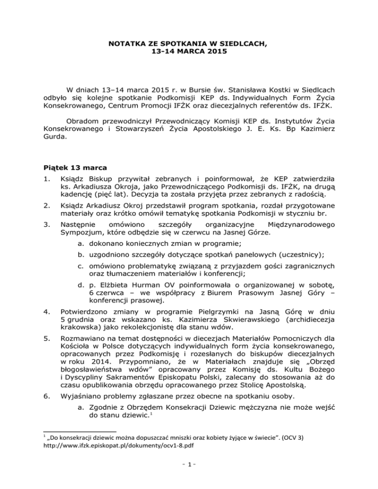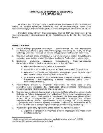 NOTATKA ZE SPOTKANIA W SIEDLCACH, 13-14 MARCA 2015 W dniach 13–14 marca 2015 r. w Bursie św. Stanisława Kostki w Siedlcach odbyło się kolejne spotkanie Podkomisji KEP ds. Indywidualnych Form Życia Konsekrowanego, Centrum Promocji IFŻK oraz diecezjalnych referentów ds. IFŻK. Obradom przewodniczył Przewodniczący Komisji KEP ds. Instytutów Życia Konsekrowanego i Stowarzyszeń Życia Apostolskiego J. E. Ks. Bp Kazimierz Gurda. Piątek 13 marca 1. Ksiądz Biskup przywitał zebranych i poinformował, że KEP zatwierdziła ks. Arkadiusza Okroja, jako Przewodniczącego Podkomisji ds. IFŻK, na drugą kadencję (pięć lat). Decyzja ta została przyjęta przez zebranych z radością. 2. Ksiądz Arkadiusz Okroj przedstawił program spotkania, rozdał przygotowane materiały oraz krótko omówił tematykę spotkania Podkomisji w styczniu br. 3. Następnie omówiono szczegóły organizacyjne Międzynarodowego Sympozjum, które odbędzie się w czerwcu na Jasnej Górze. a. dokonano koniecznych zmian w programie; b. uzgodniono szczegóły dotyczące spotkań panelowych (uczestnicy); c. omówiono problematykę związaną z przyjazdem gości zagranicznych oraz tłumaczeniem materiałów i konferencji; d. p. Elżbieta Hurman OV poinformowała o organizowanej w sobotę, 6 czerwca – we współpracy z Biurem Prasowym Jasnej Góry – konferencji prasowej. 4. Potwierdzono zmiany w programie Pielgrzymki na Jasną Górę w dniu 5 grudnia oraz wskazano ks. Kazimierza Skwierawskiego (archidiecezja krakowska) jako rekolekcjonistę dla stanu wdów. 5. Rozmawiano na temat dostępności w diecezjach Materiałów Pomocniczych dla Kościoła w Polsce dotyczących indywidualnych form życia konsekrowanego, opracowanych przez Podkomisję i rozesłanych do biskupów diecezjalnych w roku 2014. Przypomniano, że w Materiałach znajduje się „Obrzęd błogosławieństwa wdów” opracowany przez Komisję ds. Kultu Bożego i Dyscypliny Sakramentów Episkopatu Polski, zalecany do stosowania aż do czasu opublikowania obrzędu opracowanego przez Stolicę Apostolską. 6. Wyjaśniano problemy zgłaszane przez obecne na spotkaniu osoby. a. Zgodnie z Obrzędem Konsekracji Dziewic mężczyzna nie może wejść do stanu dziewic.1 1 „Do konsekracji dziewic można dopuszczać mniszki oraz kobiety żyjące w świecie”. (OCV 3) http://www.ifzk.episkopat.pl/dokumenty/ocv1-8.pdf – 1– b. Osoby związane z fraternią dominikańską oraz z tzw. trzecimi zakonami mogą podjąć życie w indywidualnych formach życia konsekrowanego, o ile otrzymają na to zgodę ze strony stowarzyszenia, do którego należą i zostaną dopuszczone do formacji początkowej przez biskupa diecezjalnego. c. Osoba pragnąca podjąć życie pustelnicze jest „zobowiązana zapewnić sobie pustelnię, środki utrzymania poprzez własną pracę oraz świadczenia społeczne”.2 d. Byłoby wskazane, aby opracowywane w diecezjach regulaminy lub statuty dotyczące indywidualnych form życia konsekrowanego zostały przekazane Podkomisji do konsultacji przed ich zatwierdzeniem. Takie regulaminy i statuty należałoby opracowywać w porozumieniu z dziewicami i wdowami konsekrowanymi danej diecezji. e. Rozmawiano na temat tego, czy dziewica konsekrowana może stanowić rodzinę zastępczą. Uznano, że każda sytuacja powinna być rozpatrywana indywidualnie. Ważne jest jednak, aby nie został zatarty znak, jaki stanowi dziewica jako oblubienica Jezusa Chrystusa. f. Ks. Stanisław Szczepaniec zaprosił księży do dyskusji i dzielenia się praktyką formacji początkowej. Przedstawił też swoje opracowania książkowe dotyczące tej tematyki. g. Pani Ewa Plewińska OVd przedstawiła list bliżej nieokreślonej grupy wdów konsekrowanych, w którym panie zwracają się z prośbą o zmianę nazwy „Obrzędu błogosławieństwa wdów” oraz uznanie ich za osoby konsekrowane. Ksiądz Biskup K. Gurda odpowiedział, że dopóki Kongregacja nie opracuje i nie zatwierdzi obrzędu dla całego Kościoła, w Polsce będzie obowiązywał obrzęd opracowany przez Komisję ds. Kultu Bożego i Dyscypliny Sakramentów Episkopatu Polski. Uprzedził też, że prace nad obrzędem będą jeszcze trwały w Rzymie dość długo, ponieważ konieczne jest rozpatrzenie go w szerokim aspekcie – teologicznym, prawnym i duchowym. Należy się uzbroić w cierpliwość i przyjąć do wiadomości, że „wdowy i wdowcy poprzez Obrzęd błogosławieństwa wdów 3, stają się osobami konsekrowanymi”.4 h. Odnosząc się do przedstawionego listu podkreślono, że nie należy porównywać stanu wdów i stanu dziewic – są to inne powołania, różniące się zarówno pod względem sposobu życia jak i charyzmatu. 2 Stan Pustelnic i Pustelników. Materiały Pomocnicze dla Kościoła w Polsce. (Rozdział VII pkt. 5) http://www.ifzk.episkopat.pl/dokumenty/2.3-ove-materialy_pomocnicze.pdf 3 „W Polsce, do czasu opracowania Obrzędu przez Stolicę Apostolską, stosuje się Obrzęd błogosławieństwa wdów opracowany w 2008 roku przez Komisję ds. Kultu Bożego i Dyscypliny Sakramentów Episkopatu Polski” Stan Wdów. Materiały Pomocnicze dla Kościoła w Polsce. (Rozdział I pkt. 7). http://www.ifzk.episkopat.pl/dokumenty/2.2-ovd-materialy_pomocnicze.pdf 4 Stan Wdów. Materiały Pomocnicze dla Kościoła w Polsce. (Rozdział I pkt. 6 z przypisami). http://www.ifzk.episkopat.pl/dokumenty/2.2-ovd-materialy_pomocnicze.pdf – 2– i. Uzgodniono, że Podkomisja przekaże księżom biskupom informację o pewnych nieprawidłowościach jakie mają miejsce przy formacji i udzielaniu konsekracji dziewic, zwracając uwagę na prawidłowe rozwiązanie zaistniałych problemów: zgodnie z Obrzędem konsekracji dziewic konsekracji nie udziela się kobietom żyjącym w zgromadzeniach, w których nie jest on przewidziany przez regułę;5 poruszono sprawę Wspólnoty Dziewiczej Matki Boga (diecezja sandomierska), zwracając uwagę na nieporozumienia wnikające ze sposobu przedstawiania się o