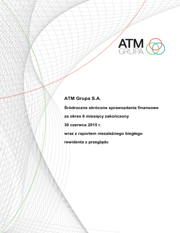 ATM Grupa S.A. Śródroczne skrócone sprawozdanie finansowe za okres 6 miesięcy zakończony 30 czerwca 2015 r. wraz z raportem niezależnego biegłego rewidenta z przeglądu 2 ATM Grupa S.A. Śródroczne skrócone sprawozdanie finansowe za 6 miesięcy zakończonych 30 czerwca 2015 r. Kwoty wyrażone są w tys. zł, o ile nie podano inaczej Wstęp Niniejsze skrócone śródroczne jednostkowe sprawozdanie finansowe zostało sporządzone w związku z wymaganiami sprawozdawczymi Giełdy Papierów Wartościowych w Warszawie. Powinno być ono rozpatrywane łącznie ze sprawozdaniem finansowym za rok zakończony 31 grudnia 2014 r. Niniejsze skrócone śródroczne jednostkowe sprawozdanie finansowe zostało zatwierdzone przez Zarząd ATM Grupa S.A. dnia 26 sierpnia 2015 r. Andrzej Muszyński Prezes Zarządu Maciej Grzywaczewski Wiceprezes Zarządu Grażyna Gołębiowska Członek Zarządu Paweł Tobiasz Członek Zarządu Przemysław Kmiotek Członek Zarządu ATM Grupa S.A. 3 Śródroczne skrócone sprawozdanie finansowe za 6 miesięcy zakończonych 30 czerwca 2015 r. Kwoty wyrażone są w tys. zł, o ile nie podano inaczej Spis treści Śródroczne skrócone sprawozdanie z sytuacji finansowej ............................................................................................................... 4 Śródroczne skrócone sprawozdanie z całkowitych dochodów ......................................................................................................... 5 Śródroczne skrócone sprawozdanie ze zmian w kapitale własnym ................................................................................................... 6 Śródroczne skrócone sprawozdanie z przepływów pieniężnych ................................................................................................................. 7 1 Informacje ogólne........................................................................................................................................................................... 8 2 Struktura Grupy Kapitałowej ........................................................................................................................................................... 9 3 Podstawa sporządzenia ............................................................................................................................................................... 11 4 Zasady rachunkowości ................................................................................................................................................................. 11 5 Rzeczowe aktywa trwałe .............................................................................................................................................................. 14 6 Wartości niematerialne ................................................................................................................................................................. 15 7 Nieruchomości inwestycyjne ........................................................................................................................................................ 16 8 Pozostałe aktywa finansowe (długoterminowe) ............................................................................................................................ 16 9 Pozostałe należności krótkoterminowe ......................................................................................................................................... 16 10 Środki pieniężne i ich ekwiwalenty oraz pozostałe aktywa finansowe krótkoterminowe ................................................................ 16 11 Zobowiązania długoterminowe inne.............................................................................................................................................. 17 12 Pozostałe zobowiązania krótkoterminowe .................................................................................................................................... 17 13 Rozliczenia międzyokresowe przychodów .................................................................................................................................... 17 14 Podatek dochodowy ..................................................................................................................................................................... 17 15 Przychody ze sprzedaży .............................................................................................................................................................. 18 16 Pozostałe przychody .................................................................................................................................................................... 18 17 Zysk na jedną akcję...................................................................................................................................................................... 18 18 Sezonowość ................................................................................................................................................................................. 19 19 Segmenty operacyjne................................................................................................................................................................... 19 20 Nabycie i utworzenie jednostek gospodarczych............................................................................................................................ 19 21 Kredyty i pożyczki ........................................................................................................................................................................ 19 22 Zobowiązania i aktywa warunkowe............................................................................................................................................... 19 23 Inne istotne wydarzenia w pierwszym półroczu 2015....................