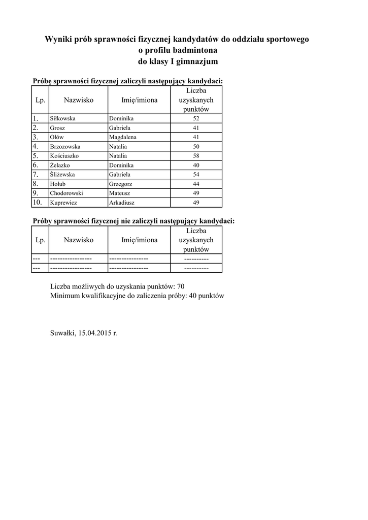 Wyniki prób sprawności fizycznej kandydatów do oddziału sportowego o profilu badmintona do klasy I gimnazjum Próbę sprawności fizycznej zaliczyli następujący kandydaci: Liczba Lp. Nazwisko Imię/imiona uzyskanych punktów Siłkowska Dominika 52 1. Grosz Gabriela 41 2. Ołów Magdalena 41 3. Brzozowska Natalia 50 4. Kościuszko Natalia 58 5. Żelazko Dominika 40 6. Śliżewska Gabriela 54 7. Hołub Grzegorz 44 8. Chodorowski Mateusz 49 9. Arkadiusz 49 10. Kuprewicz Próby sprawności fizycznej nie zaliczyli następujący kandydaci: Liczba Lp. Nazwisko Imię/imiona uzyskanych punktów --- ------------------------------------------- ----------------------------------------Liczba możliwych do uzyskania punktów: 70 Minimum kwalifikacyjne do zaliczenia próby: 40 punktów Suwałki, 15.04.2015 r. Wyniki prób sprawności fizycznej kandydatów do oddziału sportowego o profilu pływanie do klasy I gimnazjum Próbę sprawności fizycznej zaliczyli następujący kandydaci: Liczba Lp. Nazwisko Imię/imiona uzyskanych punktów Kościuszko Natalia 26 1. Szczęsna Natalia 23 2. Żelazko Dominika 22 3. Moroz Adriana 22 4. Wojdat Izabela 22 5. Próby sprawności fizycznej nie zaliczyli następujący kandydaci: Liczba Lp. Nazwisko Imię/imiona uzyskanych punktów 1. Słabińska Patrycja 13 2. --------------------------------------------------Liczba możliwych do uzyskania punktów: 42 Minimum kwalifikacyjne do zaliczenia próby: 22 punktów Suwałki, 15.04.2015 r. Wyniki prób sprawności fizycznej kandydatów do oddziału sportowego o profilu piłka siatkowa do klasy I gimnazjum Próbę sprawności fizycznej zaliczyli następujący kandydaci: Liczba Lp. Nazwisko Imię/imiona uzyskanych punktów Chwieduk Oskar 74 1. Szlaszyński Daniel 79 2. Jarmołowski Michał 78 3. Pawluczyk Bartosz 74 4. Jaśkiewicz Miłosz 70 5. Panasiewicz Albert 62 6. Rojek Mateusz 60 7. Hołub Grzegorz 60 8. Taudul Kacper 57 9. Adrian 53 10. Żukowski Damian 45 11. Bartłomiej Jakub 45 12. Grabowski Próby sprawności fizycznej nie zaliczyli następujący kandydaci: Liczba Lp. Nazwisko Imię/imiona uzyskanych punktów --- ---------------------------------------- -------------------------------------Liczba możliwych do uzyskania punktów: 90 Minimum kwalifikacyjne do zaliczenia próby: 45 punktów Suwałki, 15.04.2015 r.