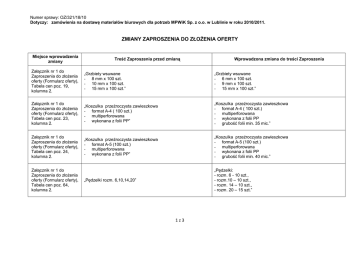 Numer sprawy: OZ/321/18/10 Dotyczy: zamówienia na dostawę materiałów biurowych dla potrzeb MPWiK Sp. z o.o. w Lublinie w roku 2010/2011. ZMIANY ZAPROSZENIA DO ZŁOśENIA OFERTY Miejsce wprowadzenia zmiany Treść Zaproszenia przed zmianą Wprowadzona zmiana do treści Zaproszenia Załącznik nr 1 do Zaproszenia do złoŜenia oferty (Formularz oferty), Tabela cen poz. 19, kolumna 2. „Grzbiety wsuwane - 8 mm x 100 szt. - 10 mm x 100 szt. - 15 mm x 100 szt.” „Grzbiety wsuwane - 6 mm x 100 szt. - 9 mm x 100 szt. - 15 mm x 100 szt.” Załącznik nr 1 do Zaproszenia do złoŜenia oferty (Formularz oferty), Tabela cen poz. 23, kolumna 2. „Koszulka przeźroczysta zawieszkowa - format A-4 ( 100 szt.) - multiperforowana - wykonana z folii PP” „Koszulka przeźroczysta zawieszkowa - format A-4 ( 100 szt.) - multiperforowana - wykonana z folii PP - grubość folii min. 35 mic.” Załącznik nr 1 do Zaproszenia do złoŜenia oferty (Formularz oferty), Tabela cen poz. 24, kolumna 2. „Koszulka przeźroczysta zawieszkowa - format A-5 (100 szt.) - multiperforowana - wykonana z folii PP” „Koszulka przeźroczysta zawieszkowa - format A-5 (100 szt.) - multiperforowana - wykonana z folii PP - grubość folii min. 40 mic.” „Pędzelki rozm. 6,10,14,20” „Pędzelki: - rozm. 6 - 10 szt., - rozm.10 – 10 szt., - rozm. 14 – 10 szt., - rozm. 20 – 15 szt.” Załącznik nr 1 do Zaproszenia do złoŜenia oferty (Formularz oferty), Tabela cen poz. 64, kolumna 2. 1z3 Numer sprawy: OZ/321/18/10 Dotyczy: zamówienia na dostawę materiałów biurowych dla potrzeb MPWiK Sp. z o.o. w Lublinie w roku 2010/2011. Miejsce wprowadzenia zmiany Załącznik nr 1 do Zaproszenia do złoŜenia oferty (Formularz oferty), Tabela cen poz. 66, kolumna 2. Załącznik nr 1 do Zaproszenia do złoŜenia oferty (Formularz oferty), Tabela cen poz. 79, kolumna 2. Załącznik nr 1 do Zaproszenia do złoŜenia oferty (Formularz oferty), Tabela cen poz. 81, kolumna 2. Załącznik nr 1 do Zaproszenia do złoŜenia oferty (Formularz oferty), Tabela cen poz. 82, kolumna 2. Załącznik nr 1 do Zaproszenia do złoŜenia oferty (Formularz oferty), Tabela cen poz. 83, kolumna 2. Treść Zaproszenia przed zmianą Wprowadzona zmiana do treści Zaproszenia „Poduszki do pieczątek: - 4911 – 5 szt., - 4912 – 5 szt., - 4913 – 2 szt.” „Poduszki do pieczątek 4911,4912,4913” „Segregator - oklejony ekologiczną folią polipropylenową - dwustronna etykieta na grzbiecie - na grzbiecie otwór na palec - na dolnych krawędziach metalowe okucie - format A – 4 - grzbiet 30-35 mm” „Segregator - oklejony ekologiczną folią polipropylenową - dwustronna etykieta na grzbiecie - na grzbiecie otwór na palec - na dolnych krawędziach metalowe okucie - format A – 5 grzbiet 75 mm” „Segregator - oklejony ekologiczną folią polipropylenową - dwustronna etykieta na grzbiecie - na grzbiecie otwór na palec - na dolnych krawędziach metalowe okucie - format A – 5 - grzbiet 50 mm” „Segregator - oklejony ekologiczną folią polipropylenową - dwustronna etykieta na grzbiecie - na grzbiecie otwór na palec - na dolnych krawędziach metalowe okucie - format A - 4 - grzbiet 3,5 z kółkami” „Segregator - oklejony ekologiczną folią polipropylenową - dwustronna etykieta na grzbiecie - format A – 4 - grzbiet 30-35 mm” „Segregator - oklejony ekologiczną folią polipropylenową - dwustronna etykieta na grzbiecie - na grzbiecie otwór na palec - format A – 5 grzbiet 75 mm” „Segregator - oklejony ekologiczną folią polipropylenową - dwustronna etykieta na grzbiecie - format A – 5 - grzbiet 35 mm” „Segregator - oklejony ekologiczną folią polipropylenową - dwustronna etykieta na grzbiecie - format A - 4 - grzbiet 3,5 z kółkami” 2z3 Numer sprawy: OZ/321/18/10 Dotyczy: zamówienia na dostawę materiałów biurowych dla potrzeb MPWiK Sp. z o.o. w Lublinie w roku 2010/2011. Miejsce wprowadzenia zmiany Treść Zaproszenia przed zmianą Wprowadzona zmiana do treści Zaproszenia Załącznik nr 1 do Zaproszenia do złoŜenia oferty (Formularz oferty), Tabela cen poz. 89, kolumna 2. „Spinacze biurowe krzyŜowe - wykonane z metalu Rodzaje - rozmiar 40 mm - rozmiar 80 mm” „Spinacze biurowe krzyŜowe - wykonane z metalu Rodzaje - rozmiar 40 mm - rozmiar 70 mm” Załącznik nr 1 do Zaproszenia do złoŜenia oferty (Formularz oferty), Tabela cen poz. 103, kolumna 2. „Teczka na rzep A 4 /18 mm - skrzydełkowa - wykonana z utwardzonego kartonu o gr.2 mm - pokryta ekologiczną folią polipropylenową 100 mic. - łączona na nity - Wymiar 320x245x40 mm - 4 podstawowe kolory” „Teczka na rzep A 4 /15 mm - skrzydełkowa - wykonana z utwardzonego kartonu o gr.2 mm - pokryta ekologiczną folią polipropylenową 100 mic. - łączona na nity - Wymiar 320x245x40 mm - 4 podstawowe kolory” Załącznik nr 1 do Zaproszenia do złoŜenia oferty (Formularz oferty), Tabela cen poz. 115, kolumna 2. „Zeszyt w kratkę - twarda oprawa - format B 5 - 196 kart” „Zeszyt w kratkę - twarda oprawa - format B 5 - 160 kart” 3z3