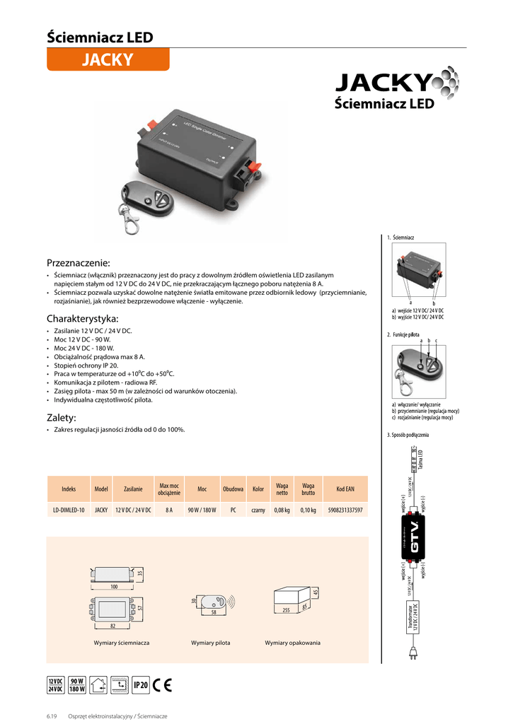 Ściemniacz LED JACKY Przeznaczenie: • • Ściemniacz (włącznik) przeznaczony jest do pracy z dowolnym źródłem oświetlenia LED zasilanym napięciem stałym od 12 V DC do 24 V DC, nie przekraczającym łącznego poboru natężenia 8 A. Ściemniacz pozwala uzyskać dowolne natężenie światła emitowane przez odbiornik ledowy (przyciemnianie, rozjaśnianie), jak również bezprzewodowe włączenie - wyłączenie. Charakterystyka: • • • • • • • • • Zasilanie 12 V DC / 24 V DC. Moc 12 V DC - 90 W. Moc 24 V DC - 180 W. Obciążalność prądowa max 8 A. Stopień ochrony IP 20. Praca w temperaturze od +10⁰C do +50⁰C. Komunikacja z pilotem - radiowa RF. Zasięg pilota - max 50 m (w zależności od warunków otoczenia). Indywidualna częstotliwość pilota. Zalety: • Zakres regulacji jasności źródła od 0 do 100%. Model Zasilanie Max moc obciążenie Moc Obudowa Kolor Waga netto Waga brutto Kod EAN LD-DIMLED-10 JACKY 12 V DC / 24 V DC 8A 90 W / 180 W PC czarny 0,08 kg 0,10 kg 5908231337597 35 Indeks 57 30 45 100 58 255 85 82 Wymiary ściemniacza 90 W 180 W 6.19 IP 20 Osprzęt elektroinstalacyjny / Ściemniacze Wymiary pilota Wymiary opakowania