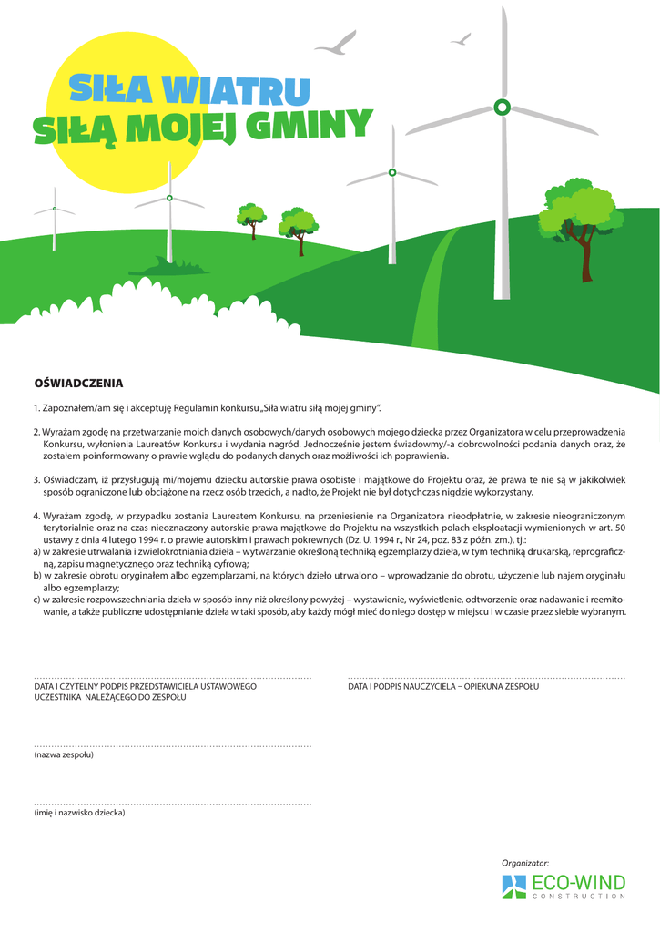 SIŁA WIATRU SIŁĄ MOJEJ GMINY OŚWIADCZENIA 1. Zapoznałem/am się i akceptuję Regulamin konkursu „Siła wiatru siłą mojej gminy”. 2. Wyrażam zgodę na przetwarzanie moich danych osobowych/danych osobowych mojego dziecka przez Organizatora w celu przeprowadzenia Konkursu, wyłonienia Laureatów Konkursu i wydania nagród. Jednocześnie jestem świadowmy/-a dobrowolności podania danych oraz, że zostałem poinformowany o prawie wglądu do podanych danych oraz możliwości ich poprawienia. 3. Oświadczam, iż przysługują mi/mojemu dziecku autorskie prawa osobiste i majątkowe do Projektu oraz, że prawa te nie są w jakikolwiek sposób ograniczone lub obciążone na rzecz osób trzecich, a nadto, że Projekt nie był dotychczas nigdzie wykorzystany. 4. Wyrażam zgodę, w przypadku zostania Laureatem Konkursu, na przeniesienie na Organizatora nieodpłatnie, w zakresie nieograniczonym terytorialnie oraz na czas nieoznaczony autorskie prawa majątkowe do Projektu na wszystkich polach eksploatacji wymienionych w art. 50 ustawy z dnia 4 lutego 1994 r. o prawie autorskim i prawach pokrewnych (Dz. U. 1994 r., Nr 24, poz. 83 z późn. zm.), tj.: a) w zakresie utrwalania i zwielokrotniania dzieła – wytwarzanie określoną techniką egzemplarzy dzieła, w tym techniką drukarską, reprograficzną, zapisu magnetycznego oraz techniką cyfrową; b) w zakresie obrotu oryginałem albo egzemplarzami, na których dzieło utrwalono – wprowadzanie do obrotu, użyczenie lub najem oryginału albo egzemplarzy; c) w zakresie rozpowszechniania dzieła w sposób inny niż określony powyżej – wystawienie, wyświetlenie, odtworzenie oraz nadawanie i reemitowanie, a także publiczne udostępnianie dzieła w taki sposób, aby każdy mógł mieć do niego dostęp w miejscu i w czasie przez siebie wybranym. ............................................................................................... ............................................................................................... DATA I CZYTELNY PODPIS PRZEDSTAWICIELA USTAWOWEGO UCZESTNIKA NALEŻĄCEGO DO ZESPOŁU DATA I PODPIS NAUCZYCIELA – OPIEKUNA ZESPOŁU ............................................................................................... (nazwa zespołu) ............................................................................................... (imię i nazwisko dziecka) Organizator: