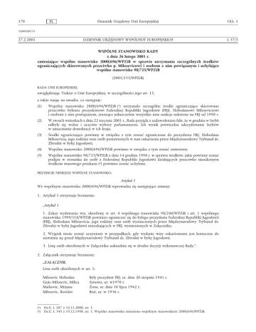 170 Dziennik Urzędowy Unii Europejskiej 18/t. 1 DZIENNIK URZĘDOWY WSPÓLNOT EUROPEJSKICH L 57/3 PL 32001E0155 27.2.2001 WSPÓLNE STANOWISKO RADY z dnia 26 lutego 2001 r. zmieniające wspólne stanowisko 2000/696/WPZiB w sprawie utrzymania szczególnych środków ograniczających skierowanych przeciwko p. Milosevicowi i osobom z nim powiązanym i uchylające wspólne stanowisko 98/725/WPZiB (2001/155/WPZiB) RADA UNII EUROPEJSKIEJ, uwzględniając Traktat o Unii Europejskiej, w szczególności jego art. 15, a także mając na uwadze, co następuje: (1) Wspólne stanowisko 2000/696/WPZiB (1) utrzymało szczególne środki ograniczające skierowane przeciwko byłemu prezydentowi Federalnej Republiki Jugosławii (FRJ), Slobodanowi Miloseviciowi i osobom z nim powiązanym, znoszące jednocześnie wszystkie inne sankcje nałożone na FRJ od 1998 r. (2) W swoich wnioskach z dnia 22 stycznia 2001 r., Rada przyjęła z zadowoleniem fakt, że w grudniu w Serbii odbyły się wolne i uczciwe wybory parlamentarne. Ich wynik potwierdza zdecydowanie Serbów w umacnianiu demokracji w ich kraju. (3) Środki ograniczające powinny w związku z tym zostać ograniczone do prezydenta FRJ, Slobodana Milosevicia, jego rodziny oraz osób postawionych w stan oskarżenia przez Międzynarodowy Trybunał ds. Zbrodni w byłej Jugosławii. (4) Wspólne stanowisko 2000/696/WPZiB powinno w związku z tym zostać zmienione. (5) Wspólne stanowisko 98/725/WPZiB z dnia 14 grudnia 1998 r. w sprawie środków, jakie powinny zostać podjęte w stosunku do osób z Federalnej Republiki Jugosławii działających przeciwko niezależnym środkom masowego przekazu (2) powinno zostać uchylone, PRZYJMUJE NINIEJSZE WSPÓLNE STANOWISKO: Artykuł 1 We wspólnym stanowisku 2000/696/WPZiB wprowadza się następujące zmiany: 1. Artykuł 1 otrzymuje brzmienie: „Artykuł 1 1. Zakaz wydawania wiz, określony w art. 4 wspólnego stanowiska 98/240/WPZiB i art. 1 wspólnego stanowiska 1999/318/WPZiB powinien ograniczać się do byłego prezydenta Federalnej Republiki Jugosławii (FRJ), Slobodana Milosevicia, jego rodziny oraz osób wyznaczonych przez Międzynarodowy Trybunał ds. Zbrodni w byłej Jugosławii mieszkających w FRJ, wymienionych w Załączniku. 2. Wyjątek może zostać uczyniony w przypadkach, gdy wydanie wizy oskarżonemu jest konieczne do stawienia się przed Międzynarodowy Trybunał ds. Zbrodni w byłej Jugosławii. 3. Listę osób określonych w Załączniku uaktualnia się w drodze decyzji wykonawczej Rady.”. 2. Załącznik otrzymuje brzmienie: „ZAŁĄCZNIK Lista osób określonych w art. 1: Milosevic Slobodan Gajic-Milosevic, Milica Markovic, Mirjana Milosevic, Borislav Były prezydent FRJ, ur. dnia 20 sierpnia 1941 r. Synowa, ur. w1970 r. Żona, ur. dnia 10 lipca 1942 r. Brat, ur. w 1936 r. (1) Dz.U. L 287 z 14.11.2000, str. 1. (2) Dz.U. L 345 z 19.12.1998, str. 1. Wspólne stanowisko zmienione wspólnym stanowiskiem 2000/696/WPZiB. 18/t. 1 PL Milosevic, Marija Milosevic, Marko Milutinovic, Milan Ojdanic, Dragoljub Sainovic, Nikola Stojilkovic, Vlajko Mrksic, Mile Radie, Miroslav Sljivancanin, Veselin Dziennik Urzędowy Unii Europejskiej 171 Córka, ur. w 1965 r. Syn, ur. dnia 2 lipca 1974 r. Prezydent Serbii, ur. dnia 19 grudnia 1942 r. Były minister obrony, ur. dnia 1 czerwca 1941 r. Były wicepremier, ur. dnia 7 grudnia 1948 r. Były minister spraw wewnętrznych, ur. w 1937 r. IT-95–13a, ur. dnia 20 lipca 1947 r. IT-95–133, ur. dnia 1 stycznia 1961 r. IT-95–13a, ur. dnia 13 czerwca 1953 r.”. Artykuł 2 Wspólne stanowisko 98/725/WPZiB traci moc. Artykuł 3 Niniejsze wspólne stanowisko staje się skuteczne z dniem jego przyjęcia. Artykuł 4 Niniejsze wspólne stanowisko zostaje opublikowane w Dzienniku Urzędowym. Sporządzono w Brukseli, dnia 26 lutego 2001 r. W imieniu Rady A. LINDH Przewodniczący