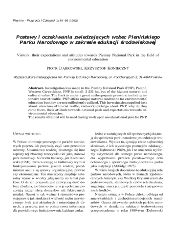 Pieniny – Przyroda i Człowiek 1: 89–95 (1992) Postawy i oczekiwania zwiedzaja˛cych wobec Pienińskiego Parku Narodowego w zakresie edukacji środowiskowej Visitors, their expectations and attitudes towards Pieniny National Park in the field of environmental education PIOTR DA˛BROWSKI, KRZYSZTOF KONIECZNY Wyższa Szkoła Pedagogiczna im. Komisji Edukacji Narodowej, ul. Podchora˛żych 2, 31–084 Kraków Abstract. Investigation was made in the Pieniny National Park (PNP), Poland, Western Carpathians. PNP is small: 2 231 ha, but of the highest natural and cultural value. The Park is under a great anthropogenic pressure, including intensive tourist traffic. PNP offers unique natural conditions for environmental education but they are not suffieciently utilized. This investigation supplied data about: structure of tourist traffic, visitors’knowledge about PNP, why do they come there, their attitude towards national park and expectations towards environmental education. The results obtained will be used during work upon an educational plan for PNP. UWAGI WSTE˛PNE W Polsce dominuje postrzeganie parków narodowych poprzez ich przyrode˛, czyli sam przedmiot ochrony. Stosunkowo rzadziej dostrzega sie˛ inne aspekty tej złożonej rzeczywistości jaka˛ stanowi park narodowy. Niewielu badaczy, jak Kolbuszewski (1990), zwraca uwage˛ na kulturowy wymiar funkcjonowania parków, jeszcze rzadziej przedmiotem analiz sa˛ sprawy organizacyjne, prawne czy ekonomiczne. Ten stan rzeczy znajduje naturalny wyraz w wiedzy jaka˛ mamy na temat parków. O ile ich przyroda jest zazwyczaj dość dobrze zbadana, to różnorodne relacje społeczne pozostaja˛ raczej sfera˛ domysłow niż faktycznych ustaleń. Nawet w tak ważnej i stosunkowo prostejsprawie jak struktura i wielkość ruchu turystycznego brak jest aktualnych i miarodajnych danych, a przecież jest to podstawowa informacja dla prawidłowego funkcjonowania każdego parku. Jedna˛ z ważniejszych ról społecznych jaka˛ maja˛ do spełnienia parki narodowe jest edukacja środowiskowa. Wynika to, ujmuja˛c rzecz najbardziej skrótowo, z ich wysokiego potencjału edukacyjnego (Da˛browski 1989), jak i ze znaczenia tej formy aktywności dla samego parku narodowego, dla wypełniania przezeń podstawowego celu ochronnego i sprawnego funkcjonowania parku jako instytucji (Aldridge 1975). W wielu krajach doceniono te˛ edukacyjna˛ role˛ parków narodowych, która w Stanach Zjedonoczonych Ameryki, czy Wielkiej Brytanii urasta do podstawowych, statutowych celów ich działania, angażuja˛c znacza˛ca˛ cze˛ść personelu i asygnowanych środków. Niestety sytuacja w Polsce daleko odbiega od amerykańskich i zachodnioeuropejskich standardów. Ocena aktywności polskich parków narodowych w dziedzinie edukacji środowiskowej przeprowadzona w roku 1989-tym (Da˛browski 90 P. Da˛browski & K. Konieczny – Edukacja środowiskowa w PPN 1990) ujawniła poważne zaniedbania w tym zakresie, tylko w cze˛ści wunikaja˛ce z trudności finansowych. Kolejne dwa lata przyniosły pewna˛ poprawe˛, lecz nadal edukacja stanowi margines instytucjonalnej działalności parków, i nie nie doczekała sie˛ nawet (poza nawiasowa˛ wzmianka˛) uwzgle˛dnienia w nowej ustawie o ochronie przyrody, chociaż inne sprawy mniejszej wagi sa˛ tam omawiane bardzo szczegółowo. Sytuacja taka jest tym bardziej niewłaściwa, że w kraju o takich rozmiarach zagrożenia ekologicznego jak Polska wszechstronna edukacja środowiskowa jest pilnie potrzebna. Z drugiej strony, kształtowanie sie˛ w państwie systemu demokratycznego, samorza˛dowego i wolnorynkowego stwarza, już ściśle dla terenów chronionych, nowe szanse, ale i nowe poważne problemy, których rozwia˛zanie be˛dzie niemożliwe bez odpowiednich wysiłków w zakresie ’public relations’. WALORY EDUKACYJNE PIENIŃSKIEGO PARKU NARODOWEGO Pieniński Park Narodowy, mimo niewielkiej powierzchni, stwarza wyja˛tkowe możliwości wykorzystania do celów dydaktycznych. Decyduja˛ o tym zarówno warunki naturalne jak i społecznoeknomiczne. Bogactwo i zróżnicowanie przyrody Pienin, tak żywej jak i nieożywionej, jest szeroko znane. Ponadto prezentuje ona różne stopnie przekształcenia pod wpływem działalności człowieka, co jest bardzo cenne pod wzgle˛dem dydaktycznym. Do czynników społecznych należa˛: wybitna atrakcyjność turystyczna Pienin, spote˛gowana dodatkowo poprzez znajduja˛ce sie˛ na ich terenie obiekty historyczne, bliskość miejscowości o charakterze uzdrowiskowo-wypoczynkowym, a także funkcjonuja˛cy w świadomości społecznej obraz Pienin, jako perły polskiej przyrody. Jest przy tym swoistym paradoksem, że przejawy dewastacji pienińskiej przyrody, np. dokonuja˛ce sie˛ w zwia˛zku z budowa˛ zbiornika czorsztyńskiego, poprzez silne oddziaływanie na sfere˛ emocjonalna˛, zwie˛kszaja˛ efektywność procesu dydaktycznego. Prowadzenie edukacji środowiskowej jest nie tylko obowia˛zkiem Parku, jest mu również bardzo potrzebne aby: – poprawić relacje z miejscowa˛ ludnościa˛; – ograniczyć szkodliwe oddziaływanie ruchu turystycznego; – zwie˛kszyć społeczne poparcie dla swojej działalności. Osia˛gnie˛cie dwóch ostatnich celów wymaga przede wszystkim dotarcia do turystów licznie odwiedzaja˛cych Park, aby po pierwsze wpłyna˛ć na ich zachowanie, a po drugie uczynić z nich przyjaciół Parku i ore˛downików jego sprawy. W celu właściwego zaplanowania takiej działalności niezbe˛dne jest pogłe˛bione rozpoznanie dotycza˛ce jej adresata, tj. zgromadzenie wiarygodnych danych o wielkości i strukturze ruchu turystycznego, a także o motywach, wiedzy, pogla˛dach i oczekiwaniach ludzi przybywaja˛cych do Pienińskiego Parku Narodowego. Doste˛pne informacje na ten temat sa˛ jak dotychczas bardzo skromne. Stosunkowo najwie˛cej danych można znależć o nate˛żeniu i dystrybucji przestrzennej ruchu turystycznego (Bartyzel i in. 1981, Bolland, 1982, Fiszba