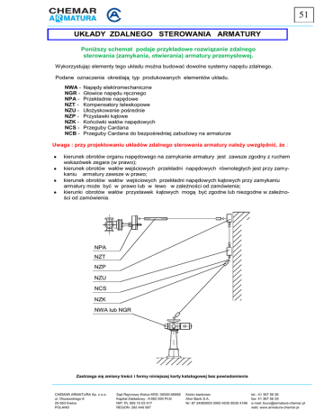 51 UKŁADY ZDALNEGO STEROWANIA ARMATURY Poniższy schemat podaje przykładowe rozwiązanie zdalnego sterowania (zamykania, otwierania) armatury przemysłowej. Wykorzystując elementy tego układu można budować dowolne systemy napędu zdalnego. Podane oznaczenia określają typ produkowanych elementów układu. NWA NGR NPA NZT NZU NZP NZK NCS NCB - Napędy elektromechaniczne Głowice napędu ręcznego Przekładnie napędowe Kompensatory teleskopowe Ułożyskowanie pośrednie Przystawki kątowe Końcówki wałów napędowych Przeguby Cardana Przeguby Cardana do bezpośredniej zabudowy na armaturze Uwaga : przy projektowaniu układów zdalnego sterowania armatury należy uwzględnić, że : kierunek obrotów organu napędowego na zamykanie armatury jest zawsze zgodny z ruchem wskazówek zegara (w prawo); kierunek obrotów wałów wejściowych przekładni napędowych równoległych jest przy zamykaniu armatury zawsze w prawo; kierunek obrotów wałów wejściowych przekładni napędowych kątowych przy zamykaniu armatury może być w prawo lub w lewo w zależności od zamówienia; kierunki obrotów wałów przystawek kątowych mogą być zgodne lub niezgodne w zależności od zamówienia. NPA NZT NZP NZU NCS NZK NWA lub NGR Zastrzega się zmiany treści i formy niniejszej karty katalogowej bez powiadomienia CHEMAR ARMATURA Sp. z o.o. ul. Olszewskiego 6 25-953 Kielce POLAND Sąd Rejonowy Kielce KRS: 00000 68958 Kapitał Zakładowy : 9 682 000 PLN NIP: PL 959 15 03 417 REGON: 292 449 587 Konto bankowe: Alior Bank S.A. Nr: 87 24900005 0000 4530 8530 4196 tel.: 41 367 56 26 fax: 41 367 56 29 e-mail: [email protected] web: www.armatura-chemar.pl