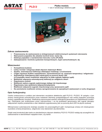 PLD/2 Płytka modułu 1- lub 2- kanałowego detektora pętli Zakres zastosowania • • • • Przeznaczony do zastosowania w zintegrowanych elektronicznych systemach sterowania Wykrywanie pojazdów dla układów kontroli bram, barier itp. Detekcja pojazdów z rozróżnieniem kierunku ruchu (PLD2/2) Zabezpieczenie i kontrola systemów transportowych, myjni samochodowych, itp. Właściwości • • • • • • • • • • • Kompaktowa budowa Łatwy montaż i integracja dzięki złączom wtykowym Molex Szybka, automatyczna kalibracja ułatwiająca instalację i uruchomianie Ciągła regulacja dryftów częstotliwości, spowodowanych np. zmianami temperatury i wilgotności Sygnalizacja uszkodzenia pętli indukcyjnej za pomocą diody LED (w przypadku awarii możliwość włączenia na stałe sygnału zajętości pętli) Możliwość włączenia automatycznej kalibracji po ustąpieniu awarii Regulowana czułość Możliwość wyboru sygnału wyjściowego stałego lub impulsowego Regulowany czas opóźnienia załączania/wyłączania Możliwość załączenia sygnału impulsowego przy opuszczaniu pętli Na zamówienie możliwość zmiany oprogramowania do specjalnych zastosowań w ruchu drogowym Opis funkcjonalny Cewka umieszczona w podłożu jest elementem oscylatora detektorów pętli PLD1/2 i PLD2/2. W związku z tym zmiany indukcyjności powodowane przez metalowe elementy przejeżdżających nad cewką pojazdów powodują zmiany częstotliwości oscylacji. Wielkością mierzoną jest wartość odstrojenia generatora od częstotliwości środkowej. Odstrojenie jest analizowane przez mikroprocesor i na tej podstawie generowany jest sygnał sterujący załączaniem styków przekaźnika a stan detektora sygnalizowany jest za pomocą diod LED na płycie czołowej. Mikroprocesor automatycznie dostraja oscylator do poszczególnych pętli i kompensuje zmiany ich indukcyjności wywołane zmianą temperatury, wilgotności oraz starzeniem się elementów. Dzięki swej konstrukcji jako karta ze standardowym złączem detektory PLD1/2 i PLD2/2 nadają się szczególnie do zastosowania w sterownikach napędów bram, czy barier. ASTAT Sp. z o.o., 60-451 Poznań, ul. Dąbrowskiego 441, tel. 061 848 88 71, faks 061 848 82 76, www.astat.com.pl, [email protected] Płytka modułu PLD/2 1- lub 2- kanałowego detektora pętli Dane techniczne Napięcie zasilania 24 V DC +/-10 % (inne napięcia zasilania na zamówienie) Pobór mocy 3W Temperatura pracy Według DIN VDE 0832 Temperatura składowania -40°C to +80°C Wymiary W = 70 mm, Sz = 100 mm, G = 22 mm Złącze 10- lub 14-biegunowa listwa Molex (typ 2145/3215 KK 3,96 mm) Waga 70 g Zakres indukcyjności 15 μH to 2000 μH (zalecany zakres 100 μH do 300 μH przy maks. 30Ω) Czułość Ustawiana w 7 stopniach dla każdego kanału Od dużej 0,01 % do małej 0,9 % (zmiana częstotliwości w %) Czas podtrzymania W trybie impulsowym: 100 ms (opcjonalnie: 1 s) i statycznie Kalibracja Automatyczna po załączeniu napięcia zasilania, lub po naciśnięciu przycisku Reset, zewnętrzny Reset Wyjścia Bezpotencjałowe styki przekaźnika U max = 48 V, Imax = 2 A, Pmax = 60 W (obciążenie rezystancyjne), opcjonalnie: otwarty kolektor Sygnalizacja LED czerwona = pętla uszkodzona, LED zielona = detekcja, LED żółta = miga podczas kalibracji / wskaźnik zasilania Przewody ochronne Wejścia pętli Izolacja galwaniczna Izolacja rezystancyjna Należy przestrzegać przepisów bezpieczeństwa! Schemat połączeń listwy Molex 1 2 3 4 5 6 7 8 9 10 11 12 13 14 1 2 3 4 5 6 7 8 9 10 PLD2/2 PLD1/2 Nie podłączony Zestyk rozwierny (kanał 2) 24 V DC (+) GND (-) Zestyk zwierny (kanał 1) Zestyk rozwierny (kanał 1) Zestyk przełączny (kanał 1) Zestyk zwierny (kanał 2) Zew. Reset Zestyk przełączny (kanał 2) Pętla 1 Pętla 1 Pętla 2 Pętla 2 Symbol zamówienia Wymiary Przycisk diody Reset LED DIP-Switch Przekaźnik Złącze Molex Pozycja zestyku: detektor włączony, pętla niezajęta ASTAT Sp. z o.o., 60-451 Poznań, ul. Dąbrowskiego 441, tel. 061 848 88 71, faks 061 848 82 76, www.astat.com.pl, [email protected] Płytka modułu PLD/2 1- lub 2- kanałowego detektora pętli Zgodność z Normami CE Wymagania dotyczące zastosowania zgodnego z przeznaczeniem Wymagania według ETSI EN 300330-1 (2002-12) Dla współczynnika anteny (powierzchnia pętli A w m2 pomnożyć przez liczbę uzwojeń pętli N) obowiązuje: N*A ≤ 60 m2 Klasa produktu 2 Maks. dług./szer. Powierzchnia Liczba uzwojeń Klasa produktu 3 30 m < 30 m 2 ≥1 > 30 m 2 1 Powierzchnia Liczba uzwojeń Warunki zgodności z EN 300330-1 Zgodnie ze zdefiniowaną formułą zaleca się dla zadanych powierzchni pętli następującą ilość uzwojeń Klasa produktu Powierzchnia według EN 300300-1 2 (1 – 3) m2 (3 – 5) m2 (5 – 10) m2 (10 – 15) m2 (15 – 30) m2 3 (30 – 60) m2 Liczba uzwojeń 6 5 4 3 2 1 Lpętli [μH] 100 - 300 80 – 260 160 – 320 180 – 280 80 – 180 40 - 100 Zakres częstotliwości pracy (L = 15 μH – 400 μH) 20.05 kHz < f < 70 kHz Indukcyjność całkowita (pętla + przewód doprowadzający) Zalecana: L całkowita < 400 μH Przykład: Indukcyjność pętli 200 μH; indukcyjność przewodu doprowadzającego < 200 μH przy 100 μH / 100 m: długość przewodu doprowadzającego < 200 m Wymagania według DIN EN 60950 Urządzenie posiada izolację podstawową ASTAT Sp. z o.o., 60-451 Poznań, ul. Dąbrowskiego 441, tel. 061 848 88 71, faks 061 848 82 76, www.astat.com.pl, [email protected] PLD/2 Płytka modułu 1- lub 2- kanałowego detektora pętli ASTAT Sp. z o.o., 60-451 Poznań, ul. Dąbrowskiego 441, tel. 061 848 88 71, faks 061 848 82 76, www.astat.com.pl, [email protected]
