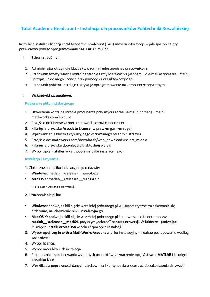 Total Academic Headcount - Instalacja dla pracowników Politechniki Koszalińskiej Instrukcja instalacji licencji Total Academic Headcount (TAH) zawiera informacje w jaki sposób należy prawidłowo pobrać oprogramowanie MATLAB i Simulink. I. Schemat ogólny: 1. Administrator otrzymuje klucz aktywacyjny i udostępnia go pracownikom. 2. Pracownik tworzy własne konto na stronie firmy MathWorks (w oparciu o e-mail w domenie uczelni) i przypisuje do niego licencję przy pomocy klucza aktywacyjnego. 3. Pracownik pobiera, instaluje i aktywuje oprogramowanie na komputerze prywatnym. II. Wskazówki szczegółowe: Pobieranie pliku instalacyjnego 1. Utworzenie konta na stronie producenta przy użyciu adresu e-mail z domeną uczelni mathworks.com/account 2. Przejście do License Center: mathworks.com/licensecenter 3. Kliknięcie przycisku Associate License (w prawym górnym rogu). 4. Wprowadzenie klucza aktywacyjnego otrzymanego od administratora. 5. Przejście do: mathworks.com/downloads/web_downloads/select_release 6. Kliknięcie przycisku download dla aktualnej wersji. 7. Wybór opcji installer w celu pobrania pliku instalacyjnego. Instalacja i aktywacja 1. Zlokalizowanie pliku instalacyjnego o nazwie: • Windows: matlab__<release>__win64.exe • Mac OS X: matlab__<release>__maci64.zip <release> oznacza nr wersji. 2. Uruchomienie pliku: • • 3. 4. 5. 6. 7. Windows: podwójne kliknięcie wcześniej pobranego pliku, automatyczne rozpakowanie się archiwum, uruchomienie pliku instalacyjnego. Mac OS X: podwójne kliknięcie wcześniej pobranego pliku, utworzenie folderu o nazwie: matlab__<release>__maci64, przy czym „release” oznacza nr wersji. W folderze - podwójne kliknięcie InstallForMacOSX w celu rozpoczęcie instalacji. Wybór opcji Log in with a MathWorks Account w pliku instalacyjnym i dalsze postepowanie według wskazówek. Wybór licencji. Wybór modułów i ich instalacja. Po pobraniu i zainstalowaniu wybranych produktów, zaznaczenie opcji Activate MATLAB i kliknięcie przycisku Next. Weryfikacja poprawności danych użytkownika i kontynuacja procesu aż do zakończenia aktywacji.