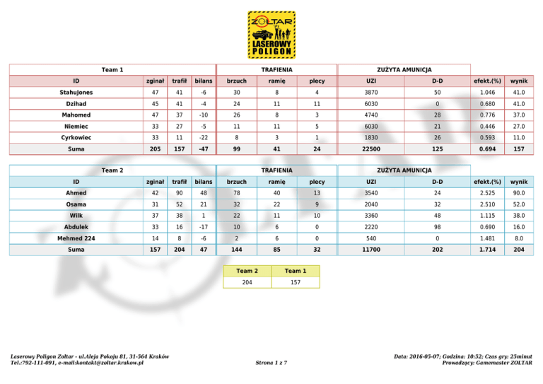 Team 1 TRAFIENIA ZUŻYTA AMUNICJA ID zginał trafił bilans