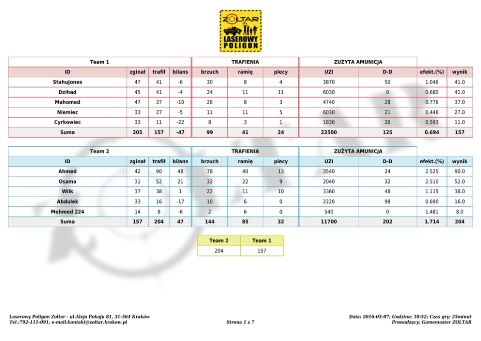 Team 1 TRAFIENIA ZUŻYTA AMUNICJA ID zginał trafił bilans brzuch ramię plecy UZI D-D efekt.(%) wynik StahuJones 47 41 -6 30 8 4 3870 50 1.046 41.0 Dzihad 45 41 -4 24 11 11 6030 0 0.680 41.0 Mahomed 47 37 -10 26 8 3 4740 28 0.776 37.0 Niemiec 33 27 -5 11 11 5 6030 21 0.446 27.0 Cyrkowiec 33 11 -22 8 3 1 1830 26 0.593 11.0 Suma 205 157 -47 99 41 24 22500 125 0.694 157 Team 2 TRAFIENIA ZUŻYTA AMUNICJA ID zginał trafił bilans brzuch ramię plecy UZI D-D efekt.(%) wynik Ahmed 42 90 48 78 40 13 3540 24 2.525 90.0 Osama 31 52 21 32 22 9 2040 32 2.510 52.0 Wilk 37 38 1 22 11 10 3360 48 1.115 38.0 Abdulek 33 16 -17 10 6 0 2220 98 0.690 16.0 Mehmed 224 14 8 -6 2 6 0 540 0 1.481 8.0 Suma 157 204 47 144 85 32 11700 202 1.714 204 Laserowy Poligon Zoltar - ul.Aleja Pokoju 81, 31-564 Kraków Tel.:792-111-091, e-mail:[email protected] Team 2 Team 1 204 157 Strona 1 z 7 Data: 2016-05-07; Godzina: 10:52; Czas gry: 25minut Prowadzący: Gamemaster ZOLTAR Team 1 TRAFIENIA ZUŻYTA AMUNICJA ID zginał trafił bilans brzuch ramię plecy UZI D-D efekt.(%) wynik Osama 33 78 45 28 46 11 4080 1 1.911 78.0 Mahomed 47 62 15 56 2 6 5310 0 1.168 62.0 Niemiec 41 39 -2 13 21 7 6840 28 0.568 39.0 Dzihad 36 37 1 29 8 3 4650 10 0.794 37.0 Cyrkowiec 34 28 -6 23 2 5 2100 51 1.302 28.0 Suma 191 244 53 149 79 32 22980 90 1.058 244 Team 2 TRAFIENIA ZUŻYTA AMUNICJA ID zginał trafił bilans brzuch ramię plecy UZI D-D efekt.(%) wynik Ahmed 56 106 50 86 44 29 1770 72 5.755 106.0 Wilk 48 29 -19 24 5 2 3450 72 0.823 29.0 StahuJones 54 25 -29 22 6 1 3210 125 0.750 25.0 Mehmed 224 53 19 -34 12 4 3 3090 0 0.615 19.0 Abdulek 33 12 -21 8 7 2 2220 204 0.495 12.0 Suma 244 191 -53 152 66 37 13740 473 1.344 191 Laserowy Poligon Zoltar - ul.Aleja Pokoju 81, 31-564 Kraków Tel.:792-111-091, e-mail:[email protected] Team 1 Team 2 244 191 Strona 2 z 7 Data: 2016-05-07; Godzina: 11:30; Czas gry: 25minut Prowadzący: Gamemaster ZOLTAR Team 1 TRAFIENIA ZUŻYTA AMUNICJA ID zginał trafił bilans brzuch ramię plecy UZI D-D efekt.(%) wynik Ahmed 46 117 71 88 60 23 4560 27 2.551 117.0 Mahomed 58 45 -13 29 11 6 5430 11 0.827 45.0 Mehmed 224 64 41 -23 28 11 4 3990 0 1.028 41.0 Niemiec 37 32 -5 15 17 5 7440 71 0.426 32.0 Abdulek 53 20 -33 9 8 3 4980 34 0.399 20.0 Suma 258 255 -3 169 107 41 26400 143 0.961 255 Team 2 TRAFIENIA ZUŻYTA AMUNICJA ID zginał trafił bilans brzuch ramię plecy UZI D-D efekt.(%) wynik Osama 54 79 25 53 22 14 4410 36 1.777 79.0 StahuJones 48 56 8 39 6 13 4830 46 1.148 56.0 Wilk 69 46 -23 35 7 4 5670 37 0.806 46.0 Dzihad 46 45 -1 38 7 3 4860 0 0.926 45.0 Cyrkowiec 38 32 -6 19 8 9 2790 60 1.123 32.0 Suma 255 258 3 184 50 43 22560 179 1.135 258 Laserowy Poligon Zoltar - ul.Aleja Pokoju 81, 31-564 Kraków Tel.:792-111-091, e-mail:[email protected] Team 2 Team 1 258 255 Strona 3 z 7 Data: 2016-05-07; Godzina: 12:21; Czas gry: 28minut Prowadzący: Gamemaster ZOLTAR Drużyny Miejsce Laserowy Poligon Zoltar - ul.Aleja Pokoju 81, 31-564 Kraków Tel.:792-111-091, e-mail:[email protected] Rozgrywki Nazwa 1 2 3 Suma Team 1 157 244 255 656 Team 2 204 191 258 653 Strona 4 z 7 Data: 2016-05-07 Prowadzący: Gamemaster ZOLTAR Zestawienie wg wyniku Miejsce TRAFIENIA ZUŻYTA AMUNICJA ID zginał trafił bilans brzuch ramię plecy UZI D-D efekt.(%) wynik Ahmed 111.26 240.37 129.11 194.06 110.06 50.03 7505.14 96.09 3.162 240.37 Osama 89.77 160.43 70.66 85.86 70.11 26.00 8046.00 52.11 1.981 160.43 Mahomed 116.63 111.34 -5.29 86.31 15.86 11.49 11918.57 30.26 0.932 111.34 4 Dzihad 97.66 94.54 -3.11 69.54 20.20 13.34 12015.43 8.00 0.786 94.54 5 StahuJones 115.09 92.80 -22.29 69.46 15.49 13.29 9114.00 172.86 0.999 92.80 6 Wilk 117.29 86.46 -30.83 61.80 17.80 12.46 9498.00 122.43 0.899 86.46 7 Niemiec 85.63 75.66 -9.97 29.91 37.74 13.17 15610.29 89.91 0.482 75.66 8 Cyrkowiec 80.74 54.06 -26.69 38.37 9.71 11.23 5136.86 104.46 1.031 54.06 9 Mehmed 224 99.31 50.89 -48.43 31.20 15.86 5.26 5754.00 0.00 0.884 50.89 10 Abdulek 90.66 36.69 -53.97 20.83 16.11 3.74 7109.14 265.89 0.497 36.69 Laserowy Poligon Zoltar - ul.Aleja Pokoju 81, 31-564 Kraków Tel.:792-111-091, e-mail:[email protected] Strona 5 z 7 Data: 2016-05-07 Prowadzący: Gamemaster ZOLTAR Zestawienie wg bilansu Miejsce TRAFIENIA ZUŻYTA AMUNICJA ID zginał trafił bilans brzuch ramię plecy UZI D-D efekt.(%) wynik Ahmed 111.26 240.37 129.11 194.06 110.06 50.03 7505.14 96.09 3.162 240.37 Osama 89.77 160.43 70.66 85.86 70.11 26.00 8046.00 52.11 1.981 160.43 Dzihad 97.66 94.54 -3.11 69.54 20.20 13.34 12015.43 8.00 0.786 94.54 4 Mahomed 116.63 111.34 -5.29 86.31 15.86 11.49 11918.57 30.26 0.932 111.34 5 Niemiec 85.63 75.66 -9.97 29.91 37.74 13.17 15610.29 89.91 0.482 75.66 6 StahuJones 115.09 92.80 -22.29 69.46 15.49 13.29 9114.00 172.86 0.999 92.80 7 Cyrkowiec 80.74 54.06 -26.69 38.37 9.71 11.23 5136.86 104.46 1.031 54.06 8 Wilk 117.29 86.46 -30.83 61.80 17.80 12.46 9498.00 122.43 0.899 86.46 9 Mehmed 224 99.31 50.89 -48.43 31.20 15.86 5.26 5754.00 0.00 0.884 50.89 10 Abdulek 90.66 36.69 -53.97 20.83 16.11 3.74 7109.14 265.89 0.497 36.69 Laserowy Poligon Zoltar - ul.Aleja Pokoju 81, 31-564 Kraków Tel.:792-111-091, e-mail:[email protected] Strona 6 z 7 Data: 2016-05-07 Prowadzący: Gamemaster ZOLTAR Zestawienie wg efektywności Miejsce TRAFIENIA ZUŻYTA AMUNICJA ID zginał trafił bilans brzuch ramię plecy UZI D-D efekt.(%) wynik Ahmed 111.26 240.37 129.11 194.06 110.06 50.03 7505.14 96.09 3.162 240.37 Osama 89.77 160.43 70.66 85.86 70.11 26.00 8046.00 52.11 1.981 160.43 Cyrkowiec 80.74 54.06 -26.69 38.37 9.71 11.23 5136.86 104.46 1.031 54.06 4 StahuJones 115.09 92.80 -22.29 69.46 15.49 13.29 9114.00 172.86 0.999 92.80 5 Mahomed 116.63 111.34 -5.29 86.31 15.86 11.49 11918.57 30.26 0.932 111.34 6 Wilk 117.29 86.46 -30.83 61.80 17.80 12.46 9498.00 122.43 0.899 86.46 7 Mehmed 224 99.31 50.89 -48.43 31.20 15.86 5.26 5754.00 0.00 0.884 50.89 8 Dzihad 97.66 94.54 -3.11 69.54 20.20 13.34 12015.43 8.00 0.786 94.54 9 Abdulek 90.66 36.69 -53.97 20.83 16.11 3.74 7109.14 265.89 0.497 36.69 10 Niemiec 85.63 7