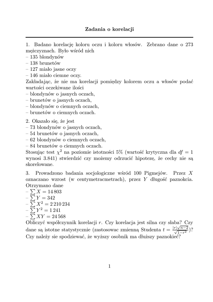 Zadania o korelacji 1. Badano korelacje, koloru oczu i koloru wlosów. Zebrano dane o 273 me,żczyznach. Bylo wśród nich – 135 blondynów – 138 brunetów – 127 mialo jasne oczy – 146 mialo ciemne oczy. Zakladaja,c, że nie ma korelacji pomie,dzy kolorem oczu a wlosów podać wartości oczekiwane ilości – blondynów o jasnych oczach, – brunetów o jasnych oczach, – blondynów o ciemnych oczach, – brunetów o ciemnych oczach. 2. Okazalo sie,, że jest – 73 blondynów o jasnych oczach, – 54 brunetów o jasnych oczach, – 62 blondynów o ciemnych oczach, – 84 brunetów o ciemnych oczach. Stosuja,c test χ2 na poziomie istotności 5% (wartość krytyczna dla df = 1 wynosi 3.841) stwierdzić czy możemy odrzucić hipoteze,, że cechy nie sa, skorelowane. 3. Prowadzono badania socjologiczne wśród 100 Pigmejów. Przez X oznaczano wzrost (w centymetracmetrach), przez Y dlugość paznokcia. Otrzymano dane P – P X = 14 803 – P Y = 342 – P X 2 = 2 210 234 – P Y 2 = 1 241 – XY = 24 568 Obliczyć wspólczynnik korelacji r. Czy korelacja jest silna czy slaba? Czy √ |r| n−2 dane sa, istotne statystycznie (zastosowac zmienna, Studenta t = √1−r2 )? Czy należy sie spodziewać, że wyższy osobnik ma dluższy paznokieć? 1