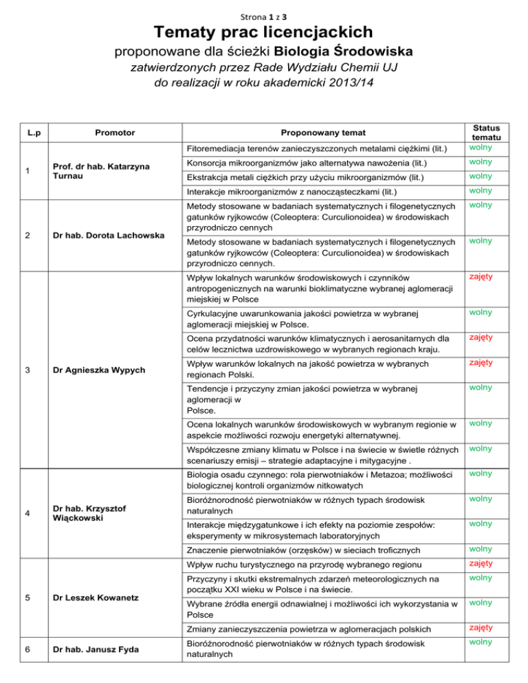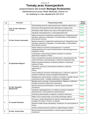Strona 1 z 3 Tematy prac licencjackich proponowane dla ścieżki Biologia Środowiska zatwierdzonych przez Rade Wydziału Chemii UJ do realizacji w roku akademicki 2013/14 L.p 1 2 3 4 5 6 Promotor Prof. dr hab. Katarzyna Turnau Dr hab. Dorota Lachowska Dr Agnieszka Wypych Dr hab. Krzysztof Wiąckowski Dr Leszek Kowanetz Dr hab. Janusz Fyda Fitoremediacja terenów zanieczyszczonych metalami ciężkimi (lit.) Status tematu wolny Konsorcja mikroorganizmów jako alternatywa nawożenia (lit.) wolny Ekstrakcja metali ciężkich przy użyciu mikroorganizmów (lit.) wolny Interakcje mikroorganizmów z nanocząsteczkami (lit.) wolny Metody stosowane w badaniach systematycznych i filogenetycznych gatunków ryjkowców (Coleoptera: Curculionoidea) w środowiskach przyrodniczo cennych wolny Metody stosowane w badaniach systematycznych i filogenetycznych gatunków ryjkowców (Coleoptera: Curculionoidea) w środowiskach przyrodniczo cennych. wolny Wpływ lokalnych warunków środowiskowych i czynników antropogenicznych na warunki bioklimatyczne wybranej aglomeracji miejskiej w Polsce zajęty Cyrkulacyjne uwarunkowania jakości powietrza w wybranej aglomeracji miejskiej w Polsce. wolny Ocena przydatności warunków klimatycznych i aerosanitarnych dla celów lecznictwa uzdrowiskowego w wybranych regionach kraju. zajęty Wpływ warunków lokalnych na jakość powietrza w wybranych regionach Polski. zajęty Tendencje i przyczyny zmian jakości powietrza w wybranej aglomeracji w Polsce. wolny Ocena lokalnych warunków środowiskowych w wybranym regionie w aspekcie możliwości rozwoju energetyki alternatywnej. wolny Współczesne zmiany klimatu w Polsce i na świecie w świetle różnych scenariuszy emisji – strategie adaptacyjne i mitygacyjne . wolny Biologia osadu czynnego: rola pierwotniaków i Metazoa; możliwości biologicznej kontroli organizmów nitkowatych wolny Bioróżnorodność pierwotniaków w różnych typach środowisk naturalnych wolny Interakcje międzygatunkowe i ich efekty na poziomie zespołów: eksperymenty w mikrosystemach laboratoryjnych wolny Znaczenie pierwotniaków (orzęsków) w sieciach troficznych wolny Wpływ ruchu turystycznego na przyrodę wybranego regionu zajęty Przyczyny i skutki ekstremalnych zdarzeń meteorologicznych na początku XXI wieku w Polsce i na świecie. wolny Wybrane źródła energii odnawialnej i możliwości ich wykorzystania w Polsce wolny Zmiany zanieczyszczenia powietrza w aglomeracjach polskich zajęty Bioróżnorodność pierwotniaków w różnych typach środowisk naturalnych wolny Proponowany temat Strona 2 z 3 7 Dr hab. Wojciech Fiałkowski 8 Dr Sebastian Hofman 9 10 11 12 13 14 Prof. dr hab. Henryk Okarma Dr Izabela Wierzbowska (opcjonalnie) Dr Artur Osikowski Dr hab. Małgorzata Grodzińska-Jurczak Dr hab. Stanisław Knutelski Dr hab. Magdalena Chadzińska Dr Tomasz Skalski Badania porównawcze czułości wybranych „szybkich metod” oceny stanu środowiska wód powierzchniowych wolny Badanie wpływu metod pobierania prób na obraz struktury zgrupowania makrobentosu wolny Zmiany geologiczne a kalibrowanie zegarów molekularnych wolny Znaczenie hybrydyzacji w ochronie gatunkowej roślin i zwierząt wolny Występowanie i przystosowania kręgowców do życia w terenach miejskich wolny Przystosowania behawioralne i fizjologiczne wybranych gatunków kręgowców wolny Ochrona wybranych gatunków kręgowców na świecie wolny Badania oceny społecznej w odniesieniu do gatunków obcych lub konfliktowych wolny Analiza rozmieszczenia i dyspersji gatunków konfliktowych zwierząt i roślin wolny Wpływ zagrożeń antropogenicznych na wybrane aspekty biologii rozrodu płazów wolny Wpływ globalnego ocieplenia na populacje płazów wolny Społeczne aspekty ochrony przyrody (w szczególności związane z programem NATURA 2000) wolny Świadomość ekologiczna różnych grup wiekowych i zawodowych społeczeństwa polskiego wolny Wdrażanie zasad racjonalnej gospodarki odpadami komunalnymi wolny Struktura zgrupowań owadów na obszarach naturalnych oraz zaburzonych przez człowieka wolny Ryjkowce (Coleoptera: Curculionoidea) skażonych metalami ciężkimi borów sosnowych w Polsce wolny Chrząszcze jako wskaźniki zmian środowiskowych wolny Wpływ kortykosterydów na odporność ryb wolny Przystosowania owadów lądowych do chronicznych zaburzeń środowiska. zajęty Zastosowanie chrząszczy jako wskaźników modyfikacji koryta rzecznego. wolny Biegaczowate jako wskaźniki skażenia metalami ciężkimi. wolny Trwałe zanieczyszczenia organiczne środowiska a otyłość. wolny 15 Dr Anna Ptak Toksykokinetyka bisfenolu A (BPA), tetrabromobisfenlou A (TBBPA) i tetrachlorobisfenolu (TCBPA). wolny 16 Prof. dr hab. Barbara Płytycz Wpływ nanocząsteczek na środowisko zajęty Wpływ benzopirenu na przebieg ciąży. wolny Charakterystyka i metabolizm benzopirenu. wolny Skutki zanieczyszczeń powietrza a rozród samic. wolny Wpływ zanieczyszczeń gleb na zdrowie. wolny Wpływ zmian klimatycznych na rolnictwo (lit.) wolny Wpływ suszy na procesy glebowe i mikroorganizmy glebowe (lit.) wolny Zasolenie gleb a procesy glebowe (lit.) wolny Rola pestycydów we współczesnym rolnictwie (lit.) wolny Wpływ WWA na procesy glebowe i mikroorganizmy glebowe (lit.) wolny Oddziaływanie arsenu na aktywność gleby leśnej wolny 17 18 Dr Agnieszka Rak-Mardyła Dr hab. Maria Niklińska Strona 3 z 3 19 20 21 22 23 24 25 Dr hab. Paulina Kramarz Prof. dr hab. January Weiner Doc. dr hab. Anna Rożen (opcjonalnie) Dr hab. Szymon Zubek Dr hab. Renata ŚwiergoszKowalewska Prof. dr hab. Ryszard Laskowski Dr hab. Mariusz Płachno Dr Dawid Moroń (Inst. Systematyki i Ewolucji Zwierząt PAN) Wpływ azotu na aktywność dehydrogenazy wolny Potencjalne tempo nitryfikacji w glebach leśnych okolic Olkusza wolny Czy ochrona biologiczna upraw może zastąpić chemiczne pestycydy? lit. wolny Stechiometryczne różnice składu ciała drapieżnych stawonogów różnych taksonów i z różnych ek