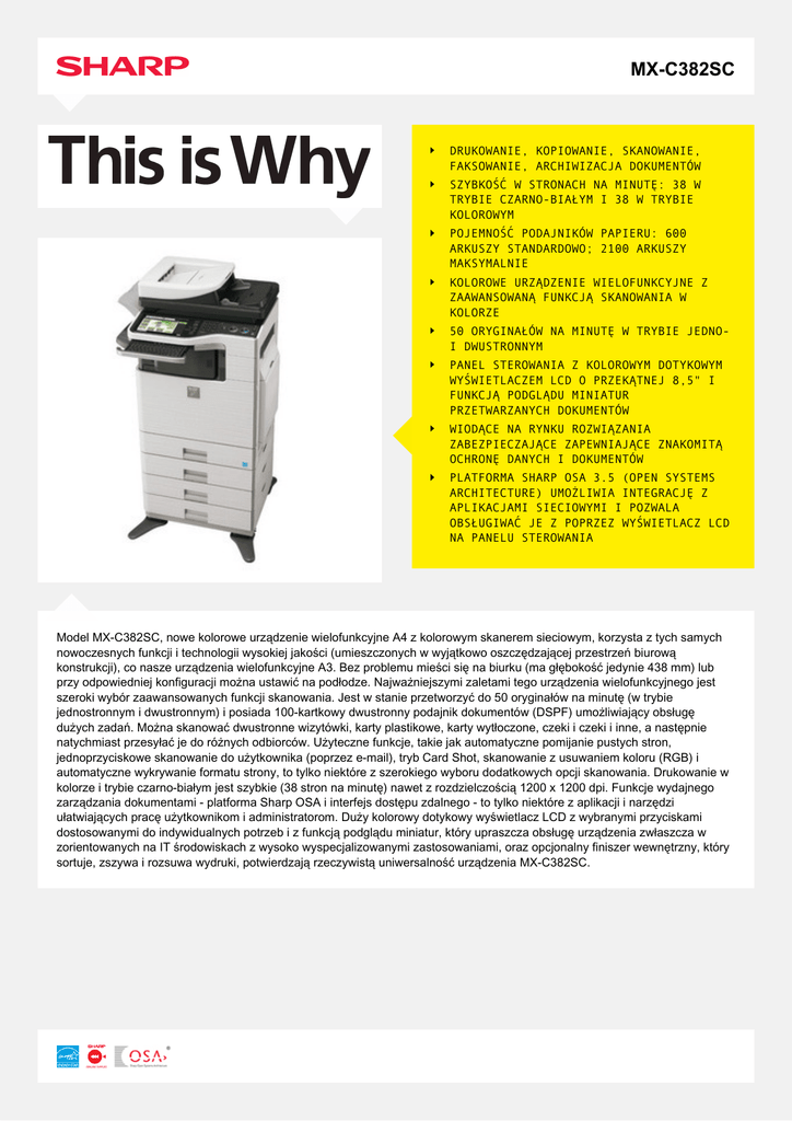MX-C382SC DRUKOWANIE, KOPIOWANIE, SKANOWANIE, FAKSOWANIE, ARCHIWIZACJA DOKUMENTÓW SZYBKOŚĆ W STRONACH NA MINUTĘ: 38 W TRYBIE CZARNO-BIAŁYM I 38 W TRYBIE KOLOROWYM POJEMNOŚĆ PODAJNIKÓW PAPIERU: 600 ARKUSZY STANDARDOWO; 2100 ARKUSZY MAKSYMALNIE KOLOROWE URZĄDZENIE WIELOFUNKCYJNE Z ZAAWANSOWANĄ FUNKCJĄ SKANOWANIA W KOLORZE 50 ORYGINAŁÓW NA MINUTĘ W TRYBIE JEDNOI DWUSTRONNYM PANEL STEROWANIA Z KOLOROWYM DOTYKOWYM WYŚWIETLACZEM LCD O PRZEKĄTNEJ 8,5" I FUNKCJĄ PODGLĄDU MINIATUR PRZETWARZANYCH DOKUMENTÓW WIODĄCE NA RYNKU ROZWIĄZANIA ZABEZPIECZAJĄCE ZAPEWNIAJĄCE ZNAKOMITĄ OCHRONĘ DANYCH I DOKUMENTÓW PLATFORMA SHARP OSA 3.5 (OPEN SYSTEMS ARCHITECTURE) UMOŻLIWIA INTEGRACJĘ Z APLIKACJAMI SIECIOWYMI I POZWALA OBSŁUGIWAĆ JE Z POPRZEZ WYŚWIETLACZ LCD NA PANELU STEROWANIA Model MX-C382SC, nowe kolorowe urządzenie wielofunkcyjne A4 z kolorowym skanerem sieciowym, korzysta z tych samych nowoczesnych funkcji i technologii wysokiej jakości (umieszczonych w wyjątkowo oszczędzającej przestrzeń biurową konstrukcji), co nasze urządzenia wielofunkcyjne A3. Bez problemu mieści się na biurku (ma głębokość jedynie 438 mm) lub przy odpowiedniej konfiguracji można ustawić na podłodze. Najważniejszymi zaletami tego urządzenia wielofunkcyjnego jest szeroki wybór zaawansowanych funkcji skanowania. Jest w stanie przetworzyć do 50 oryginałów na minutę (w trybie jednostronnym i dwustronnym) i posiada 100-kartkowy dwustronny podajnik dokumentów (DSPF) umożliwiający obsługę dużych zadań. Można skanować dwustronne wizytówki, karty plastikowe, karty wytłoczone, czeki i czeki i inne, a następnie natychmiast przesyłać je do różnych odbiorców. Użyteczne funkcje, takie jak automatyczne pomijanie pustych stron, jednoprzyciskowe skanowanie do użytkownika (poprzez e-mail), tryb Card Shot, skanowanie z usuwaniem koloru (RGB) i automatyczne wykrywanie formatu strony, to tylko niektóre z szerokiego wyboru dodatkowych opcji skanowania. Drukowanie w kolorze i trybie czarno-białym jest szybkie (38 stron na minutę) nawet z rozdzielczością 1200 x 1200 dpi. Funkcje wydajnego zarządzania dokumentami - platforma Sharp OSA i interfejs dostępu zdalnego - to tylko niektóre z aplikacji i narzędzi ułatwiających pracę użytkownikom i administratorom. Duży kolorowy dotykowy wyświetlacz LCD z wybranymi przyciskami dostosowanymi do indywidualnych potrzeb i z funkcją podglądu miniatur, który upraszcza obsługę urządzenia zwłaszcza w zorientowanych na IT środowiskach z wysoko wyspecjalizowanymi zastosowaniami, oraz opcjonalny finiszer wewnętrzny, który sortuje, zszywa i rozsuwa wydruki, potwierdzają rzeczywistą uniwersalność urządzenia MX-C382SC. KOPIARKA OGÓLNE Szybkość urządzenia, tryb kolorowy w str./min (A4): 38 Szybkość urządzenia, tryb cz.-b. w str./min (A4): 38 Format papieru: min.- maks.: A5 - A4 Gramatura papieru (g/m²): 60 - 105 Pojemność: standardowa (arkuszy): 600 Pojemność: maks. (arkuszy): 2100 Czas nagrzewania (w sekundach): 90 Pamięć ogólna min./maks. (MB): 512 Pamięć drukarki min./maks. (MB): 1024 - 2048 Twardy dysk: STD Pojemność twardego dysku (GB): 80 Dupleks: STD Wymagania dotyczące źródła zasilania - sieciowe napięcie lokalne (Hz): 220 - 240V, 50/60Hz Pobór mocy (kW): 1,84 Wymiary (mm): 560 x 494 x 789 Waga (kg): 53 PODAJNIK DOKUMENTÓW Pojemność podajnika oryginałów (kartek): 100 FUNKCJA ARCHIWIZACJI DOKUMENTÓW Funkcja archiwizacji dokumentów (std./opcja): STD Pojemność funkcji przechowywania dokumentów - foldery główny i własny (liczba stron): 5500 Pojemność funkcji przechowywania dokumentów - folder tymczasowy (liczba stron): 1700 Programowane zadania: Kopiowanie, drukowanie, druk bezpośredni, skanowanie, wysyłanie faksów Foldery do przechowywania dokumentów: Folder tymczasowy, folder główny, foldery własne (maks. 1000) Przechowywanie faksów poufnych: FAKS Faks (std./opcja): Opcja System kompresji: MH/MR/MMR/JBIG Protokół komunikacyjny: Super G3 Czas transmisji (w sekundach): 3 Szybkość modemu (b/s): 33.600 - 2.400 Rozdzielczość transmisji: STD 203,2 x 97,8 dpi/Extra Fine 406,4 x 391 dpi Format dokumentu (min.): A5 Format dokumentu (maks.): A4 Pamięć (MB): 8 Poziomy szarości: 256 Programowanie połączeń; skrócone, szybkie: 999 Rozsyłanie (maks. liczba odbiorców): 500 www.sharp.pl Powered by TCPDF (www.tcpdf.org) Format oryginału (maks.): A4 Czas pierwszej kopii kolorowej (sek.): 8,5 Czas pierwszej kopii cz.-b. (sek.): 6,5 Sorter elektroniczny (standard): Kopiowanie ciągłe (maks. kopii): 999 Rozdzielczość skanowania w trybie cz.-b. (dpi): 600 x 600 Rozdzielczość skanowania w trybie kolorowym (dpi): 600 x 600 Rozdzielczość druku (dpi): 1200 x 1200 Gradacja (liczba odcieni) - tryb czarno-biały: 2 Gradacja (liczba odcieni) - tryb kolorowy: 256 Zakres regulacji skali (%): 50 - 200 Zaprogramowane skale kopiowania: 8 SKANER Skaner sieciowy (std./opcja): STD Skanowanie w trybach "pull scan" i "push scan": Rozdzielczość w trybie "push scan" (dpi): 100,200, 300,400, 600 Rozdzielczość w trybie "pull scan" (dpi): 75,100, 150,200, 300,400, 600,50 to 9600 Formaty plików: XPS, TIFF, PDF, encrypted PDF, JPEG (colour only), XPS Narzędzia skanera: Network Scanner Tool, Sharpdesk, TWAIN Skanowanie na pulpit: Skanowanie do FTP, Email: Skanowanie do folderu sieciowego: Skanowanie do pamięci USB: DRUKARKA Rozdzielczość (dpi): 1200 x 1200 Drukarka sieciowa (std./opcja): Standard Interfejs standardowy/opcjonalny: Standard USB 2.0,10Base-T/100Base-TX/1000Base-T Obsługiwane systemy operacyjne - standardowo: Windows 2000/XP, Windows Server 2003/2008/2008R2, Windows Vista, Windows 7; Mac OS 9.0 - 9.2.2/Mac OS X 10.2.8/10.3.9/10.4.11/ 10.5-10.5.8,10.6 - 10.6.2 Protokoły sieciowe: TCP/IP (IPv4 i IPv6), IPX/SPX (NetWare), NetBEUI, EtherTalk (AppleTalk) Protokoły druku: LPR, Raw TCP (port 9100), POP3 (drukowanie przez email), HTTP, aplikacja Novell Printserver z NDS i Bindery, F