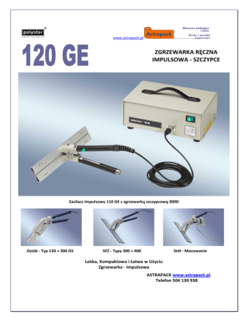 www.astrapack.pl ZGRZEWARKA RĘCZNA IMPULSOWA - SZCZYPCE Zasilacz Impulsowy 110 GE z zgrzewarką szczypcową 300D Dziób - Typ 150 + 300 DS SFZ - Typy 300 + 400 Stół - Mocowanie Lekka, Kompaktowa i Łatwa w Użyciu Zgrzewarka - Impulsowa ASTRAPACK www.astrapack.pl Telefon 504 130 938 Zgrzewarka Impulsowa - Szczypce 120 GE doskonały zgrzew Nowoczesna technologia: Automatyczne dostosowanie napięcia dla różnych szerokości zgrzewu szczypiec Zastosowanie: Ręczna przenośna zgrzewarka szczypcowa polystar® zgrzeje wszystkie rozmiary worków bez względu na rozmiar jest bardzo poręczna i łatwa w użyciu. Przy pomocy tej zgrzewarki można zgrzewać bardzo długie powierzchnie folii dokonując zgrzewu za zgrzewem np. 1m lub wiele więcej. Ten model zgrzewa folię polietylenową PE LDPE oraz PE HDPE do grubości 2 x 0,3 mm . Inne folie po przeprowadzonych testach Obsługa: Po włączeniu zgrzewarki jest ona natychmiast gotowa do pracy. Zasada pracy operatora jest bardzo prosta. Nie potrzebne są żadne specjalne umiejętności ani specjalne szkolenie użytkowników. OPERATOR tylko otwiera szczypce zgrzewarki, po zwolnieniu uchwytu, szczypce “automatycznie” zaciskają się na folii [możliwa regulacja siły zacisku]. Operator włącza impuls po przez wciśnięcie przycisku start. Impuls jest generowany z zasilacza na czas wcześniej ustalony i jest kontrolowany elektronicznie. Dziób - Typ 150 + 300 DS Innowacyjność: Automatyczna korekta zasilania. Niezależnie od szerokości szczypiec – impulsowy generator rozpoznaje automatycznie wymagane napięcie w zależności od rodzaju szczypiec. Dlatego do różnych zgrzewarek szczypcowych małych lub dużych jest przeznaczony jeden model polystar® 110 GE . Typ SFZ 300 + 400 +600 Szczególne właściwości i zalety zgrzewarek : polystar® 110 GE działa na zasadzie zgrzewu impulsowego natychmiastowa gotowość do pracy po włączeniu zasilacza 110GE podwójne szczęki wykonują 3 mm pewny zgrzew zielona dioda sygnalizuje czas i prawidłowość procesu zgrzewania automatyczna kontrola temperatury taśmy zgrzewajacej regulowana siła docisku szczęk stały, kontrolowany elektronicznie czas zgrzewania automatyczna korekta napięcia generowanego przez zasilacz, można stosować różne rodzaje zgrzewarek przedłużony czas pracy zgrzewarek – zastosowano specjalne taśmy zgrzewające Podstawowe Daneniemiecki Techniczne: “GS” znak bezpieczeństwa i znak “CE” polystar® Modele zgrzewarek Model 150 D Model 200 D Model 300 D Model 400 D Model 600 D Dziób typ: Model 150 DS Model 300 DS SFZ : Model 300 SFZ Model 400 SFZ Zgrzew max. 150 mm max. 200 mm max. 300 mm max. 400 mm max. 600 mm Waga 0,70 kg 0,75 kg 0,80 kg 0,95 kg 1,00 kg Dane Tech. Zasilacza Impulsowego polystar® 120 GE Zasilanie: Natężenie: Zużycie energii: 230 V/50 Hz max. 3,7 A ca. 0,1 kWh max. 150 mm max. 300 mm 0,80 kg 0,95 kg Wymiar 120GE: 296 x 195 x 132 mm max. 300 mm max. 400 mm 0,80 kg 0,85 kg Wymiar szczęk 160, 210, 260, 310, 410, 610 x 220 x 65 mm Wszystkie zgrzewarki są wyposażone w 3 metrowe kable zasilające. Dane techniczne zgrzewarek mogą ulec zmianie. (C 2007/05)