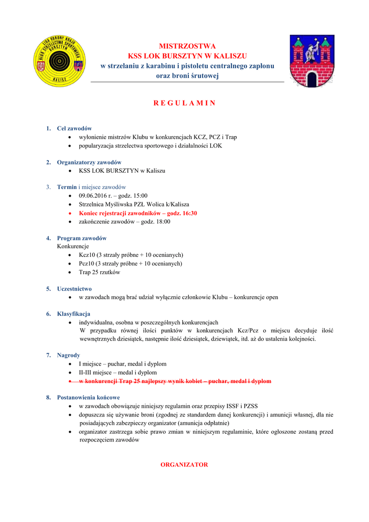 MISTRZOSTWA KSS LOK BURSZTYN W KALISZU w strzelaniu z karabinu i pistoletu centralnego zapłonu oraz broni śrutowej REGULAMIN 1. Cel zawodów wyłonienie mistrzów Klubu w konkurencjach KCZ, PCZ i Trap popularyzacja strzelectwa sportowego i działalności LOK 2. Organizatorzy zawodów KSS LOK BURSZTYN w Kaliszu 3. Termin i miejsce zawodów 09.06.2016 r. – godz. 15:00 Strzelnica Myśliwska PZŁ Wolica k/Kalisza Koniec rejestracji zawodników – godz. 16:30 zakończenie zawodów – godz. 18:00 4. Program zawodów Konkurencje Kcz10 (3 strzały próbne + 10 ocenianych) Pcz10 (3 strzały próbne + 10 ocenianych) Trap 25 rzutków 5. Uczestnictwo w zawodach mogą brać udział wyłącznie członkowie Klubu – konkurencje open 6. Klasyfikacja indywidualna, osobna w poszczególnych konkurencjach W przypadku równej ilości punktów w konkurencjach Kcz/Pcz o miejscu decyduje ilość wewnętrznych dziesiątek, następnie ilość dziesiątek, dziewiątek, itd. aż do ustalenia kolejności. 7. Nagrody I miejsce – puchar, medal i dyplom II-III miejsce – medal i dyplom w konkurencji Trap 25 najlepszy wynik kobiet – puchar, medal i dyplom 8. Postanowienia końcowe w zawodach obowiązuje niniejszy regulamin oraz przepisy ISSF i PZSS dopuszcza się używanie broni (zgodnej ze standardem danej konkurencji) i amunicji własnej, dla nie posiadających zabezpieczy organizator (amunicja odpłatnie) organizator zastrzega sobie prawo zmian w niniejszym regulaminie, które ogłoszone zostaną przed rozpoczęciem zawodów ORGANIZATOR