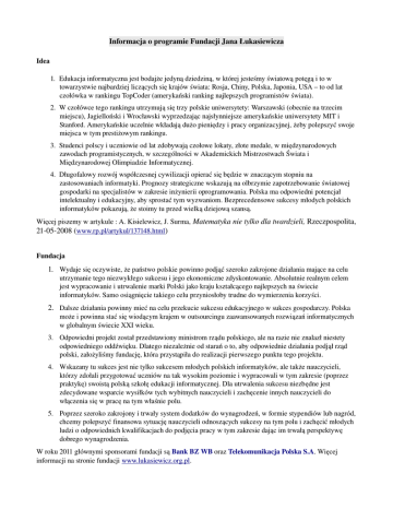 Informacja o programie Fundacji Jana Łukasiewicza Idea 1. Edukacja informatyczna jest bodajże jedyną dziedziną, w której jesteśmy światową potęgą i to w towarzystwie najbardziej liczących się krajów świata: Rosja, Chiny, Polska, Japonia, USA – to od lat czołówka w rankingu TopCoder (amerykański ranking najlepszych programistów świata). 2. W czołówce tego rankingu utrzymują się trzy polskie uniwersytety: Warszawski (obecnie na trzecim miejscu), Jagielloński i Wrocławski wyprzedzając najsłynniejsze amerykańskie uniwersytety MIT i Stanford. Amerykańskie uczelnie wkładają dużo pieniędzy i pracy organizacyjnej, żeby polepszyć swoje miejsca w tym prestiżowym rankingu. 3. Studenci polscy i uczniowie od lat zdobywają czołowe lokaty, złote medale, w międzynarodowych zawodach programistycznych, w szczególności w Akademickich Mistrzostwach Świata i Międzynarodowej Olimpiadzie Informatycznej. 4. Długofalowy rozwój współczesnej cywilizacji opierać się będzie w znaczącym stopniu na zastosowaniach informatyki. Prognozy strategiczne wskazują na olbrzymie zapotrzebowanie światowej gospodarki na specjalistów w zakresie inżynierii oprogramowania. Polska ma odpowiedni potencjał intelektualny i edukacyjny, aby sprostać tym wyzwaniom. Bezprecedensowe sukcesy młodych polskich informatyków pokazują, że stoimy tu przed wielką dziejową szansą. Więcej piszemy w artykule : A. Kisielewicz, J. Surma, Matematyka nie tylko dla twardzieli, Rzeczpospolita, 21052008 (www.rp.pl/artykul/137148.html) Fundacja 1. Wydaje się oczywiste, że państwo polskie powinno podjąć szeroko zakrojone działania mające na celu utrzymanie tego niezwykłego sukcesu i jego ekonomiczne zdyskontowanie. Absolutnie realnym celem jest wypracowanie i utrwalenie marki Polski jako kraju kształcącego najlepszych na świecie informatyków. Samo osiągnięcie takiego celu przyniosłoby trudne do wymierzenia korzyści. 2. Dalsze działania powinny mieć na celu przekucie sukcesu edukacyjnego w sukces gospodarczy. Polska może i powinna stać się wiodącym krajem w outsourcingu zaawansowanych rozwiązań informatycznych w globalnym świecie XXI wieku. 3. Odpowiedni projekt został przedstawiony ministrom rządu polskiego, ale na razie nie znalazł niestety odpowiedniego oddźwięku. Dlatego niezależnie od starań o to, aby odpowiednie działania podjął rząd polski, założyliśmy fundację, która przystąpiła do realizacji pierwszego punktu tego projektu. 4. Wskazany tu sukces jest nie tylko sukcesem młodych polskich informatyków, ale także nauczycieli, którzy zdołali przygotować uczniów na tak wysokim poziomie i wypracowali w tym zakresie (poprzez praktykę) swoistą polską szkołę edukacji informatycznej. Dla utrwalenia sukcesu niezbędne jest zdecydowane wsparcie wysiłków tych wybitnych nauczycieli i zachęcenie innych nauczycieli do włączenia się w pracę na tym właśnie polu. 5. Poprzez szeroko zakrojony i trwały system dodatków do wynagrodzeń, w formie stypendiów lub nagród, chcemy polepszyć finansowa sytuację nauczycieli odnoszących sukcesy na tym polu i zachęcić młodych ludzi o odpowiednich kwalifikacjach do podjęcia pracy w tym zakresie dając im trwałą perspektywę dobrego wynagrodzenia. W roku 2011 głównymi sponsorami fundacji są Bank BZ WB oraz Telekomunikacja Polska S.A. Więcej informacji na stronie fundacji www.lukasiewicz.org.pl.