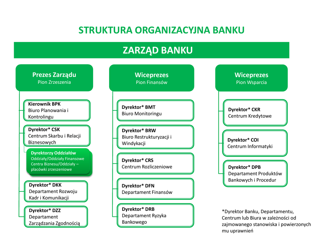 STRUKTURA ORGANIZACYJNA BANKU ZARZĄD BANKU Prezes Zarządu Wiceprezes Wiceprezes Pion Zrzeszenia Pion Finansów Pion Wsparcia Kierownik BPK Biuro Planowania i Kontrolingu Dyrektor* BMT Biuro Monitoringu Dyrektor* CSK Centrum Skarbu i Relacji Biznesowych Dyrektor* BRW Biuro Restrukturyzacji i Windykacji Dyrektor* CKR Centrum Kredytowe Dyrektor* COI Centrum Informatyki Dyrektorzy Oddziałów Oddziały/Oddziały Finansowe Centra Biznesu/Oddziały – placówki zrzeszeniowe Dyrektor* CRS Centrum Rozliczeniowe Dyrektor* DKK Departament Rozwoju Kadr i Komunikacji Dyrektor* DFN Departament Finansów Dyrektor* DZZ Departament Zarządzania Zgodnością Dyrektor* DRB Departament Ryzyka Bankowego Dyrektor* DPB Departament Produktów Bankowych i Procedur *Dyrektor Banku, Departamentu, Centrum lub Biura w zależności od zajmowanego stanowiska i powierzonych mu uprawnień STRUKTURA ORGANIZACYJNA ODDZIAŁU DYREKTOR ODDZIAŁU Kierownik Samodzielne stanowiska pracy Zespół Obsługi Klientów (ZOK) STRUKTURA ORGANIZACYJNA ODDZIAŁU FINANSOWEGO CENTRUM BIZNESU DYREKTOR ODDZIAŁU FINANSOWEGO CENTRUM BIZNESU Samodzielne stanowiska pracy Kierownik Zespół Obsługi Transakcji i Klientów Indywidualnych (ZOTiKI) Kierownik Zespół Obsługi Firm (ZOF) STRUKTURA ORGANIZACYJNA ODDZIAŁU – PLACÓWKI ZRZESZENIOWEJ DYREKTOR ODDZIAŁU – PLACÓWKI ZRZESZENIOWEJ Samodzielne stanowiska pracy