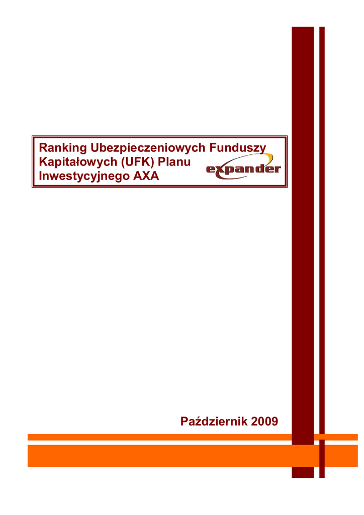 Ranking Ubezpieczeniowych Funduszy Kapitałowych (UFK) Planu Inwestycyjnego AXA Październik 2009 Indeks Indeks Planu Inwestycyjnego AXA Indeks planu inwestycyjnego AXA (PLN, wykres tygodniowy) 270 250 230 210 190 170 150 130 wrz 09 sie 09 lip 09 cze 09 maj 09 kwi 09 mar 09 lut 09 sty 09 gru 08 lis 08 paź 08 wrz 08 sie 08 lip 08 cze 08 maj 08 kwi 08 mar 08 lut 08 sty 08 gru 07 lis 07 paź 07 wrz 07 sie 07 lip 07 cze 07 maj 07 kwi 07 mar 07 lut 07 sty 07 Źródło: obliczenia własne na podstawie średniej arytmetycznej stóp zwrotu wszystkich UFK wchodzących w skład programu Ranking UFK UFK Waluta UFK AXA - HSBC GIF Indian Equity USD Stopa 1M Stopa 6M Sharpe Sortino Trend Siła wzgl. Ranking VAR Maks. strata Ryzyko 10,9% 82,0% 0,7 1,0 -38% -67% UFK AXA - ING Subfundusz Środkowoeurop. Sektora Fin. Plus PLN 6,3% 94,5% 1,0 1,5 -42% -64% UFK AXA - HSBC GIF BRIC Markets Equity USD 8,8% 32,1% 1,2 1,9 -35% -54% UFK AXA - ING Subfundusz Środkowoeuropejski Budownictwa i Nieruchomości Plus PLN 1,1% 64,9% 0,7 1,2 -21% -61% UFK AXA - BlackRock World Mining USD 8,5% 27,9% 0,5 0,7 -51% -68% UFK AXA - AXA WF European Small Cap Equities EUR 9,4% 27,4% 0,2 0,3 -29% -54% UFK AXA - Templeton Asian Growth Fund USD 10,4% 42,2% -0,1 -0,1 -29% -61% 2 UFK AXA - ING Subfundusz Selektywny Plus PLN -1,7% 55,3% 0,7 1,1 -38% -63% UFK AXA - AXA WF Emerging Europe Equities EUR 7,9% 44,9% 0,1 0,1 -49% -66% UFK AXA - BlackRock Latin American Fund USD 11,5% 49,2% -0,3 -0,5 -43% -61% UFK AXA - HSBC Global Emerging Markets Equity Fund USD 10,4% 33,6% -0,1 -0,2 -48% -44% UFK AXA - DWS FIO Top 50 Malych i Srednich Spolek PLN 1,8% 45,0% 0,3 0,4 -34% -69% UFK AXA - AXA Akcji PLN -1,8% 43,1% 0,6 1,0 -36% -57% UFK AXA - Noble Fund Akcji PLN -0,1% 48,6% 0,3 0,5 -34% -58% UFK AXA - Legg Mason Akcji FIO PLN 0,3% 41,2% 0,4 0,5 -32% -56% UFK AXA - UniKorona Akcje FIO PLN 1,4% 55,8% 0,0 0,0 -32% -57% UFK AXA - AXA WF Euro Value Equities EUR 7,4% 21,1% -0,3 -0,3 -34% -51% UFK AXA - JPMorgan Emerging Europe, Middle East, Africa Fund USD 7,7% 39,0% -0,6 -0,8 -38% -62% UFK AXA - ARKA BZ WBK ZrównowaŜony FIO PLN 0,2% 39,0% 0,0 -0,1 -26% -47% UFK AXA - PKO/CS Akcji Nowa Europa [FANE] PLN 1,9% 41,0% -0,3 -0,3 -35% -56% UFK AXA - AXA WF Talents EUR 5,0% 24,3% -0,3 -0,4 -30% -59% UFK AXA - ARKA BZ WBK Akcji FIO PLN -0,6% 58,0% 0,2 0,2 -36% -60% UFK AXA - UniKorona ZrównowaŜony FIO PLN 0,8% 30,3% -0,2 -0,3 -17% -38% UFK AXA - DWS FIO Akcji PLN -0,3% 44,5% 0,1 0,2 -41% -60% UFK AXA - PIONEER Akcji Polskich FIO PLN -0,1% 57,2% -0,2 -0,2 -41% -66% UFK AXA - PIONEER Dochodu i Wzrostu Rynku Chińskiego PLN 5,0% 34,2% -0,8 -1,1 -14% -39% UFK AXA - AXA WF Aedificandi EUR 4,4% 33,0% -0,3 -0,4 -36% -50% UFK AXA - SKARBIEC Akcja PLN -1,3% 42,2% 0,0 0,0 -33% -54% UFK AXA - SKARBIEC Sektora Nieruchomosci PLN 0,1% 33,4% -0,1 -0,1 -26% -52% UFK AXA - BlackRock World Gold USD 12,5% 2,2% 0,2 0,4 -49% -61% UFK AXA - BlackRock New Energy Fund USD 5,3% 8,3% 0,0 0,1 -39% -65% 3 UFK AXA - UniAktywna Alokacja FIO PLN 0,5% 10,6% 0,9 1,4 -6% -16% UFK AXA - HSBC Balanced Portfolio Fund USD 4,4% 7,0% -0,1 -0,1 -22% -35% UFK AXA - AXA Aktywnego Inwestowania PLN -0,9% 18,5% 0,1 0,2 -15% -28% UFK AXA - Legg Mason ZrównowaŜony Środkowoeuropejski FIO PLN 1,7% 22,1% 0,3 0,5 -17% -36% UFK AXA - AXA Stabilnego Wzrostu PLN -0,2% 8,2% -0,1 -0,1 -5% -12% UFK AXA - HSBC Adventurous Portfolio Fund USD 4,9% 13,5% -0,6 -0,8 -27% -45% UFK AXA - SKARBIEC Ochrony Kapitalu PLN -0,7% 5,2% 0,7 1,8 -1% -2% UFK AXA - DWS FIO ZrównowaŜony PLN -1,0% 25,4% 0,0 0,0 -29% -45% UFK AXA - SKARBIEC Waga PLN -0,7% 25,7% 0,0 0,0 -19% -35% UFK AXA - PKO/CS Japońskiego Rynku Akcji [JRA(PLN)] PLN -0,4% 0,1% -0,2 -0,3 -30% -39% UFK AXA - SKARBIEC III Filar PLN -0,8% 15,9% 0,1 0,1 -12% -23% UFK AXA - PKO/CS Akcji [FPA] PLN -0,8% 32,6% -0,2 -0,2 -39% -64% UFK AXA - UniStoProcentPlus FIO PLN 0,2% 4,9% 0,1 0,2 -1% -5% UFK AXA - DWS FIO Zabezpieczenia Emerytalnego PLN -0,4% 15,6% -0,1 -0,1 -16% -26% UFK AXA - PIONEER Akcji Amerykańskich FIO PLN 3,5% 6,6% -1,0 -1,1 -34% -45% UFK AXA - HSBC Cautious Portfolio Fund USD 3,5% -2,7% -0,3 -0,4 -22% -30% UFK AXA - AXA WF Optimal Income EUR 5,9% 0,1% -1,1 -1,5 -23% -26% UFK AXA - HSBC Climate Change Fund USD 5,9% 16,8% -2,4 -2,8 -79% -32% UFK AXA - PKO/CS Stabilnego Wzrostu [FSW] PLN 0,0% 12,1% -0,4 -0,4 -17% -29% UFK AXA - PKO/CS ZrównowaŜony PLN [FZ] -0,4% 16,5% -0,4 -0,5 -27% -39% -2,0 -2,7 -61% 0% pienięŜny 0% 0% UFK AXA - JPMorgan Highbridge Statistical Market Neutral Fund USD 1,2% 18,1% UFK AXA - AXA Rynku PienięŜnego PLN 0,5% 2,6% UFK AXA - SKARBIEC Obligacja PLN -0,2% 3,7% -0,2 -0,3 obligacje -2% -2% UFK AXA - DWS FIO DłuŜnych Papierów Wartościowych PLN 0,2% 2,3% -0,6 -0,7 obligacje -7% -1% 4 UFK AXA - AXA Bezpiecznego Inwestowania PLN 0,2% 2,3% -0,7 -0,9 obligacje -2% -1% UFK AXA - Templeton Global Bond Fund USD 3,9% -5,9% 0,2 0,5 obligacje -19% -23% UFK AXA - BlackRock Local Emerging Markets Short Duration Bond Fund USD 2,2% -7,4% 1,6 3,6 obligacje -10% 0% LEGENDA - trend wzrostowy - trend horyzontalny lub zmiana trendu - trend spadkowy - wzrostowa siła względna - spadkowa siła względna - punktacja rankingu; im większa, tym większa atrakcyjność UFK - klasa ryzyka; im większa numeracja, tym większe ryzyko związane z inwestycją Opis wskaźników zastosowanych w rankingu Stopa 1M – stopa zwrotu osiągnięta w okresie ostatniego miesiąca (obliczona według wartości jednostek przeliczonych na polską walutę, jeŜeli UFK notowany jest w walucie zagranicznej). Stopa 6M - stopa zwrotu osiągnięta w okresie ostatnich sześciu miesięcy (obliczona według wartości jednostek przeliczonych na polską walutę, jeŜeli UFK notowany jest w walucie zagranicznej). Sharpe – wskaźnik Sharpe’a, obrazujący stosunek średniej nadwyŜkowej1 stopy zwrotu do odchylenia standardowego nadwyŜkowych stóp zwrotu. NadwyŜkowe stopy zwrotu są to stopy zwrotu pomniejszone o stopę zwrotu wolną od ryzyka. Wskaźnik ten został na potrzeby 