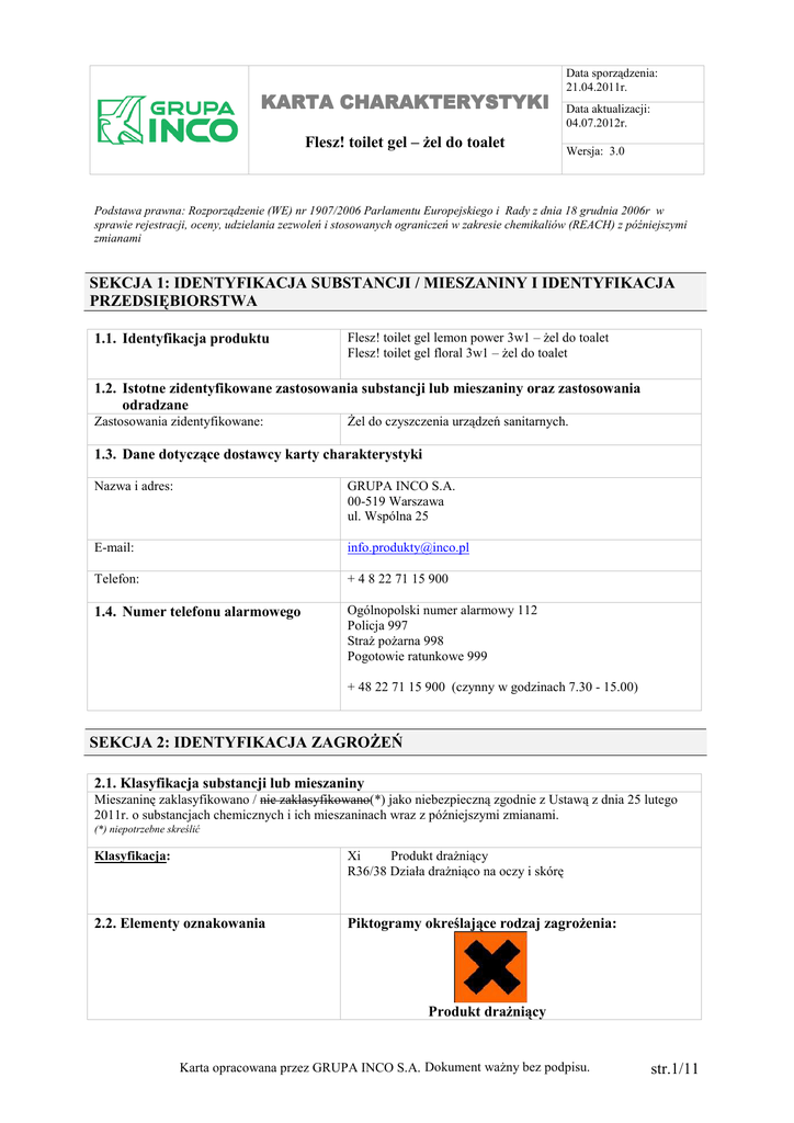 Data sporządzenia: 21.04.2011r. KARTA CHARAKTERYSTYKI Flesz! toilet gel – Ŝel do toalet Data aktualizacji: 04.07.2012r. Wersja: 3.0 Podstawa prawna: Rozporządzenie (WE) nr 1907/2006 Parlamentu Europejskiego i Rady z dnia 18 grudnia 2006r w sprawie rejestracji, oceny, udzielania zezwoleń i stosowanych ograniczeń w zakresie chemikaliów (REACH) z późniejszymi zmianami SEKCJA 1: IDENTYFIKACJA SUBSTANCJI / MIESZANINY I IDENTYFIKACJA PRZEDSIĘBIORSTWA 1.1. Identyfikacja produktu Flesz! toilet gel lemon power 3w1 – Ŝel do toalet Flesz! toilet gel floral 3w1 – Ŝel do toalet 1.2. Istotne zidentyfikowane zastosowania substancji lub mieszaniny oraz zastosowania odradzane Zastosowania zidentyfikowane: śel do czyszczenia urządzeń sanitarnych. 1.3. Dane dotyczące dostawcy karty charakterystyki Nazwa i adres: GRUPA INCO S.A. 00-519 Warszawa ul. Wspólna 25 E-mail: [email protected] Telefon: + 4 8 22 71 15 900 1.4. Numer telefonu alarmowego Ogólnopolski numer alarmowy 112 Policja 997 StraŜ poŜarna 998 Pogotowie ratunkowe 999 + 48 22 71 15 900 (czynny w godzinach 7.30 - 15.00) SEKCJA 2: IDENTYFIKACJA ZAGROśEŃ 2.1. Klasyfikacja substancji lub mieszaniny Mieszaninę zaklasyfikowano / nie zaklasyfikowano(*) jako niebezpieczną zgodnie z Ustawą z dnia 25 lutego 2011r. o substancjach chemicznych i ich mieszaninach wraz z późniejszymi zmianami. (*) niepotrzebne skreślić Klasyfikacja: Xi Produkt draŜniący R36/38 Działa draŜniąco na oczy i skórę 2.2. Elementy oznakowania Piktogramy określające rodzaj zagroŜenia: Produkt draŜniący Karta opracowana przez GRUPA INCO S.A. Dokument waŜny bez podpisu. str.1/11 Data sporządzenia: 21.04.2011r. KARTA CHARAKTERYSTYKI Flesz! toilet gel – Ŝel do toalet Data aktualizacji: 04.07.2012r. Wersja: 3.0 Zwrot(y) R: R36/38 Działa draŜniąco na oczy i skórę Zwrot(y) S: S2 S26 Chronić przed dziećmi Zanieczyszczone oczy przemyć natychmiast duŜą ilością wody i zasięgnąć porady lekarza Zanieczyszczona skórę natychmiast przemyć duŜą ilością wody W razie połknięcia niezwłocznie zasięgnij porady lekarza – pokaz opakowanie lub etykietę Nie mieszać z innymi środkami czyszczącymi S28 S46 S50 Nie są znane 2.3. Inne zagroŜenia SEKCJA 3: SKŁAD / INFORMACJA O SKŁADNIKACH 3.1. Substancje Nie ma zastosowania, produkt jest mieszaniną 3.2. Mieszaniny Nazwa substancji / numer indeksowy Kwas fosforowy (V)/ 015-011-00-6 Alkohole, C12-16, etoksylowane 7-15 TE Nr rejestracji 01211948592 4-24-xxxx Polimer WE CAS StęŜenie 231- 7664633-2 38-2 3 - 7% Polim 68551er 12-2 0,5 - 2% Ograniczenia i zezwolenia dotyczące substancji: Klasyfikacja Klasyfikacja Dyr.67/548/EWG Rozp.1272/2008 C R34 Skin Corr. 1B H314 Xn R22 Xi R41 Acute Tox. 4 H302 Eye Dam. 1 H318 Nie dotyczy SEKCJA 4: ŚRODKI PIERWSZEJ POMOCY 4.1. Opis środków pierwszej pomocy Wdychanie: Kontakt ze skórą: Kontakt z oczami: Wyprowadzić poszkodowanego z miejsca naraŜenia. Zapewnić spokój w dowolnej pozycji oraz dostęp świeŜego powietrza. W razie potrzeby skontaktować się z lekarzem. Natychmiast zdjąć zanieczyszczona odzieŜ; skaŜoną skórę dokładnie zmywać wodą. Nie stosować mydła ani Ŝadnych środków zobojętniających. Natychmiast płukać duŜą ilością wody przez co najmniej 15 min, przy szeroko rozwartych powiekach. Usunąć szkła kontaktowe. Unikać silnego strumienia wody ze względu na ryzyko mechanicznego uszkodzenia rogówki. Konieczne udać się do okulisty. Karta opracowana przez GRUPA INCO S.A. Dokument waŜny bez podpisu. str.2/11 Data sporządzenia: 21.04.2011r. KARTA CHARAKTERYSTYKI Flesz! toilet gel – Ŝel do toalet SpoŜycie: Informacje dla lekarza: Konieczna jest natychmiastowa pomoc lekarska: (w przypadku spoŜycia i kontaktu z oczami) Istnieje moŜliwość wystąpienia opóźnionych skutków naraŜenia: Zalecane jest przeniesienie naraŜonej osoby z miejsca naraŜenia na świeŜe powietrze: Zalecane jest zdjęcie osobie poszkodowanej zanieczyszczonej odzieŜy i butów: Zalecane indywidualne wyposaŜenie ochronne dla osób udzielających pierwszej pomocy: 4.2. NajwaŜniejsze ostre i opóźnione objawy oraz skutki naraŜenia: 4.3. Wskazania dotyczące natychmiastowej pomocy lekarskiej i szczególnego postępowania z poszkodowanym: Data aktualizacji: 04.07.2012r. Wersja: 3.0 JeŜeli nastąpi połknięcie, Nie wywoływać wymiotów. Podawać duŜe ilości wody do picia. Nie podawać środków zobojętniających. NIGDY NIE PODAWAĆ NICZEGO NIEPRZYTOMNEJ OSOBIE. Zapewnić natychmiastową pomoc lekarską. Przedstawić lekarzowi Kartę Charakterystyki wyrobu. Decyzję o szczególnym sposobie postępowania podejmuje lekarz po dokładnej ocenie stanu poszkodowanego. x tak □ nie □ brak danych x tak □ nie □ brak danych x tak □ nie □ brak danych x tak □ nie □ brak danych W zaleŜności od sposobu naraŜenia nosić: ubranie ochronne, maski ochronne, rękawice ochronne, gogle ochronne. Oczy: Ból, pieczenie, łzawienie, światłowstręt, przekrwienie i obrzęk spojówki, zniszczenie rogówki. Skóra: MoŜe powodować zaczerwienienie, ból i podraŜnienie skóry Wdychanie: Nie jest szczególnie niebezpieczny, chyba Ŝe podgrzany do wysokiej temperatury lub rozpylony. Mgła lub opary wywołują podraŜnienie nosa, gardła i górnych dróg oddechowych. Połknięcie: Połknięcie moŜe wywołać ból i podraŜnienia przewodu pokarmowego. Decyzję o szczególnym sposobie postępowania podejmuje lekarz po dokładnej ocenie stanu poszkodowanego. SEKCJA 5: POSTĘPOWANIE W PRZYPADKU POśARU 5.1. Środki gaśnicze Odpowiednie środki gaśnicze: Odpowiednio do materiałów magazynowanych w bezpośrednim sąsiedztwie. Nieodpowiednie środki gaśnicze: Zwarty strumień wody. 5.2. Szczególne zagroŜenia związane z substancją lub mieszaniną: Mieszanina niepalna. W kontakcie z większością metali moŜe reagować emitując wodór, który tworzy wybuchowe mieszaniny z powietrzem. W razie poŜaru moŜliwe powstawanie niebezpiecznych p