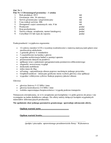 Zał. Nr 1 Pak Nr 1 Ultrasonograf przenośny - 1 sztuka 1. Rok produkcji: 2013 2. Gwarancja: min. 36 miesięcy 3. Serwis gwarancyjny i pogwarancyjny 4. Czas reakcji serwisu: 48h 5. Dostępność części zamiennych: min. 8 lat 6. Producent: 7. Kraj pochodzenia: 8. Nazwa własna urządzenia, numer katalogowy 9. Certyfikat CE lub wpis do rejestru tak tak tak tak tak podać podać podać podać Funkcjonalność i wyjątkowa ergonomia: 12-calowy monitor LCD o wysokiej rozdzielczości z matową matrycą (anti glare) oraz możliwością odchylenia 2 gniazda głowic w standardzie 5 częstotliwości na każdej z głowic wygodna archiwizacja badań w pamięci aparatu przenoszenie danych na pendrive aplikacje wraz z pakietami oprogramowania pomiarowo-obliczeniowego elegancki, nowoczesny wygląd doskonała mobilność niska masa do 6kg mTuning - optymalizacja obrazu poprzez naciśnięcie jednego przycisku GraphicExamIcon - intuicyjne graficzne menu wyboru głowicy oraz aplikacji wygodne i efektywne cyfrowe funkcje poprawy jakości obrazu Głowice głowica liniowa 5-12 MHz i inne głowica konweksowa 2-6 MHz i inne walizka zapewniająca bezpieczeństwo i wygodę podczas transportu Niniejszym oświadczamy, że w/w urządzenie jest kompletne i w pełni gotowe do pracy i nie wymagane są żadne dodatkowe zakupy. Do oferty należy dołączyć komplet oryginalnych materiałów informacyjnych producenta. Nie spełnienie choć jednego parametru granicznego spowoduje odrzucenie oferty. Ogółem wartość netto ………………………………. Ogółem wartość brutto………………………………. ............................................................................................................ (podpis i pieczątka uprawnionego przedstawiciela firmy/ Wykonawca 15 Pak Nr 2-Defibrylator -6sztuk 1. Rok produkcji: 2013 2. Gwarancja: min. 36 miesięcy 3. Serwis gwarancyjny i pogwarancyjny 4. Czas reakcji serwisu: 48h 5. Dostępność części zamiennych: min. 8 lat 6. Producent: 7. Kraj pochodzenia: 8. Nazwa własna urządzenia, numer katalogowy 9. Certyfikat CE lub wpis do rejestru DEFIBRYLACJA: Cena Stawka Wartość jednostkowa podatku netto netto VAT tak tak tak tak tak podać podać podać podać Wartość brutto - rodzaj impulsu: dwufazowy - energia: 140 - 360J - czas trwania cyklu: zazwyczaj 20 sekund ECG: - metoda: Eindhoven II - oporność pacjenta: 23-200 Ohm - częstość akcji serca: 30-300 uderzeń / min DETEKCJA VF/VT: - detekcja VF/VT: TAK - czas analizy: 7-12 s - próg VF/VT : 200 µ V - próg zatrzymania serca: <200 µ V - detekcja rozrusznika serca: TAK ELEKTRODY: - elektrody przylepne - długość przydatności: 36 miesięcy - długość kabla: 1.5 m - aktywna powierzchnia elektrod: 164 cm2 - warunki przechowywania: od 0 do 50 stopni C PRZECHOWYWANIE DANYCH: - pamięć przenośna: karta CF - czas zapisu: do 100 godzin 16 - oprogramowanie PC ZASILANIE: - bateria: LiMnO2, 15V, 2,8Ah, żywotność: do 6 lat (ilość wyładowań do 200 @360J) WARUNKI OTOCZENIA: - warunki pracy: od 0 do 50 stopni C (wilgotność 30-95% z kondensacją, 700-1060 hPa) - warunki przechowywania: od -20 do +70 stopni C (wilgotność 30-95% z kondensacją, 500-1060 hPa) ALGORYTM POSTĘPOWANIA: - AHA - ERC STANDARDY: - IEC606011:1988+A1:1991+A2:1995 (Electrical Safety of Med. Electrical Devices) - IEC60601-1-2:2001 (EMC standard) - IEC60601-14:1996+A1:1999 (Programmable electrical medical systems) - IEC60601-2-4:2002 (Defibrillator standard) - EN1789:2003 (Ambulance standard) - Klasa bezpieczeństwa: IP55 WYMIARY: - wys. x szer x gł. : 25 x 28 x 9 cm - waga z baterią: około 2.5kg Niniejszym oświadczamy, że w/w urządzenie jest kompletne i w pełni gotowe do pracy i nie wymagane są żadne dodatkowe zakupy. Do oferty należy dołączyć komplet oryginalnych materiałów informacyjnych producenta. Nie spełnienie choć jednego parametru granicznego spowoduje odrzucenie oferty. Ogółem wartość netto ………………………………. Ogółem wartość brutto………………………………. ......................................................................................................... 17 (podpis i pieczątka uprawnionego przedstawiciela firmy/ Wykonawcy Pak Nr 4 -Stół zabiegowy 2 sztuki 1. Rok produkcji: 2013 2. Gwarancja: min. 36 miesięcy 3. Serwis gwarancyjny 4. Producent: 5. Kraj pochodzenia: 6. Nazwa własna urządzenia, numer katalogowy 7. Certyfikat CE lub wpis do rejestru CaC\CccccCałkowita długość stołu tak tak tak podać podać podać podać Dane techniczne – 1sztuka Całkowita długość blatu 2020 mm Całkowita szerokość blatu 550 mm 810 mm Minimalna wysokość blatu (z materacem) Maksymalna wysokość blatu (z materacem) Regulacja oparcia pleców Regulacja podgłówka -40° do 50° Przechył Trendelenburga 25° Przechył anty - trendelenburga 150 Regulacja nachylenia podnóżków ( w pionie ) Regulacja odchylenia podnóżków (w poziomie) Maksymalne dopuszczalne obciążenie -90° do 15° Mobilna podstawa posiada centralny układ blokowania 4 kół oraz funkcję jazdy kierunkowej. 1050 mm -40° do 80° 0° do 180° 180 kg wartość netto ………………………………. wartość brutto………………………………. Dane techniczne -1sztuka Całkowita długość stołu 1950mm, Całkowita szerokość stołu 650mm, 18 1. 2. 3. 4. 5. 6. 7. Minimalna wysokość blatu 620mm, Maksymalna wysokość blatu1060mm, Regulacja oporu pleców 0do 650 Kąt uniesienia siedziska 0 do 150 Kąt uniesienia podgłówka 0do 350 Przechył trendelenburga 150 Przechył anty - trendelenburga 150 Maksymalne dopuszczalne obciążenie 180kg, Uchwyt do podkładów jednorazowych mocowany do oparcia pleców, Wieszak kroplówki, Podpórka ręki, Podkolanniki, Uchwyt ręki, Listwy do mocowania wyposażenia dodatkowego Pasy do unieruchomienia pacjenta Mobilna podstawa posiada centralny układ blokowania 4 kół oraz funkcję jazdy kierunkowej. Rok produkcji: 2013 Gwarancja: min. 3