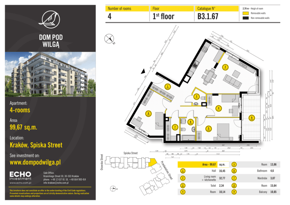 Number of rooms Floor Catalogue N° 4 1 floor B3.1.67 st 2,70 m - Heigh of room Removable walls Non-removable walls 2 1 3 Apartment: 4-rooms 4 8 9 Area: 6 99,67 sq.m. 7 5 Location: See investment on: i o śn sq.m. 5 Room 1 Hall 16,45 6 Bathroom 4,6 2 Living room + kitchenette 32,77 7 Wardrobe 3,87 3 Toilet 2,34 8 Room 15,64 4 Room 10,14 9 Balcony 10,85 ie S tree t This brochure does not constitute an offer in the understanding of the Civil Code regulations. Presented visualizations and projections are of strictly demonstrative nature. During realization some details may undergo alteration. Area - 99,67 e dw Sale Office: Krasickiego Street 30, 30-503 Kraków phone: +48 12 637 81 18, +48 664 900 414 [email protected] Spiska Street Pr z www.dompodwilga.pl Orawska Street Kraków, Spiska Street 13,86