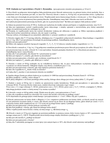 WIP. Zadania na I sprawdzian z Fizyki 1. Dynamika. (przyspieszenie ziemskie przyjmujemy g=10 m/s2) 1. Dwa klocki są połączone nierozciągliwą linką przełożoną przez bloczek umieszczony na górnym końcu równi pochyłej. Kąt α nachylenia równi do poziomu jest taki, że sinα=0,6. Pierwszy klocek o masie m1=0,4 kg leży na powierzchni równi, a połączona z nim linka jest równoległa do powierzchni równi. Współczynnik tarcia kinetycznego klocka o równię jest µk=0,4. Drugi klocek o masie m2=0,6 kg zwisa na pionowej lince poniżej bloczka. Zaniedbujemy masę linki i bloczka oraz tarcie na bloczku. a) Z jakim przyspieszeniem poruszają się klocki, gdy nie są przytrzymywane? b) Jakie jest napięcie linki podczas ruchu? 2. Zakręt ma promień krzywizny R=90 m. Jezdnia jest nachylona do środka zakrętu pod kątem α względem poziomu. sinα=0,15. a) Jaka jest najmniejsza wartość współczynnika tarcia statycznego µ między oponami a nawierzchnią, przy której samochód stojący na nachylonej jezdni nie ześlizguje się w dół. b) Przyjmij, że współczynnik tarcia ma wartość dwukrotnie większą niż obliczona w punkcie a. Oblicz największą prędkość v z jaką może jechać samochód po zakręcie, aby nie wpaść w poślizg. Narysuj wektory sił działających na samochód, oddzielnie w sytuacji z punktu a i z punktu b. 3. Dziecko ciągnie siłą F=5 N pociąg zabawkę, składającą się z 5 wagoników połączonych sznurkiem. Masa każdego z wagoników jest m=1 kg. Siła F jest przyłożona równolegle do poziomego podłoża. Zaniedbujemy tarcie. a) Jakie jest przyspieszenie? b) Oblicz siły napięcia sznurków łączących wagoniki: T1, T2, T3, T4? (Ti dotyczy sznurka między wagonikiem i a i+1). 4. Dwa klocki o masach m1=1 kg i m2=3 kg połączono sznurkiem przełożonym przez bloczek przyczepiony do sufitu. Klocek Nr 1 jest przytrzymywany na stole, a klocek Nr 2 wisi nad stołem. Sznurek pomiędzy klockiem Nr 1 a bloczkiem jest pionowy. Zaniedbujemy tarcie i masę bloczka. a) Jaka siła F jest potrzebna, aby klocek Nr 1 przytrzymać na stole? b) Jakie jest napięcie FS sznurka, gdy klocki są nieruchome? c) Jakie jest przyspieszenie a klocków, gdy zwolniony został klocek Nr 1? d) Jakie jest napięcie FN sznurka, gdy układ jest w ruchu? 5. Dziecko o masie m=30 kg rozbujało się na wahadłowej huśtawce tak, że przy maksymalnym wychyleniu znajduje się na wysokości osi obrotu huśtawki. Odległość między osią obrotu a siodełkiem jest L=2 m. a) Jakie jest przyspieszenie a dziecka, gdy mija najniższe położenie huśtawki ? b) Jaka siła wypadkowa FW działa wtedy na dziecko? c) Z jaką siłą FN naciska w tym momencie dziecko na siodełko? 6. Satelita obiega Ziemię po orbicie kołowej na wysokości h=1000 km nad powierzchnią. Promień Ziemi R = 6370 km. a) Oblicz prędkość v satelity i okres obiegu T. b) W jakiej odległości x od Ziemi przebiega orbita satelity, którego okres obiegu jest równy jednej dobie T1=24 godz? 7. Student o masie m=80 kg stoi w windzie na sprężynowej wadze łazienkowej. Winda jest początkowo w spoczynku, waga wskazuje 80 kG. W pewnej chwila winda rusza, student obserwuje wskazanie wagi i stoper: Przez czas t1=2 s waga wskazuje F1=60 kG, potem przez czas t2=4s F2=80 kG, przez czas t3=1s F3=120 kG, a następnie F4=80 kG. Jaką drogę przebyła winda i w którą stronę? Czy można wysiadać? 8. Człowiek o masie m=60 kg jedzie windą. Winda rusza do góry z przyspieszeniem a=5 m/s2. a) Jaka siła wypadkowa działa na człowieka? Ile wynosi siła nacisku człowieka na podłogę windy? b) Po dojechaniu do górnego piętra winda hamuje z przyspieszeniem a= -2 m/s2. Oblicz siły jak w punkcie a. 9. Klocek umieszczono na końcu deski o długości L=2 m i stopniowo podnoszono ten koniec deski, aż klocek zaczął się zsuwać. W tym położeniu trzymano deskę w czasie, gdy klocek zsuwał się po desce do jej drugiego końca, gdzie dotarł po czasie t=2,5 s. Uniesiony koniec deski znajdował się o h=1 m wyżej niż jej drugi koniec oparty o podłogę. a) Jakie jest przyśpieszenie a klocka podczas zsuwania się? b) Jaka była prędkość v klocka, gdy dotarł do dolnego końca deski? Oblicz współczynniki tarcia klocka o deskę: c) statycznego µS i d) kinetycznego µK. 10. Klocek o masie m=25 kg jest ciągnięty po poziomej podłodze za pomocą sznura, który tworzy kątem α=30° z poziomem. Siła naciągu sznura jest FS=100 N. Współczynnik tarcia kinetycznego między klockiem a podłogą jest µk=0,2. a) Jaka jest siła nacisku FN podłogi na klocek? b) Jakie jest przyspieszenie a klocka? c) Jaką siła F należałoby pociągnąć za sznur (przy tym samym kącie α=30°), aby klocek został uniesiony nad podłogę? Odpowiedzi: 1. a) a = 2,32 ms-2 (drugi klocek w dół), b) FL=4,608 N≅4,6 N. 2. a) µ = 0,152, b) v = 20,7 m/s ≅ 74,5 km/h. 3. a) a = 1 ms-2, b) T1 = 4 N; T2 = 3 N; T3 = 2 N; T4 = 1 N. 4. a) F = 20 N, b) FS = 30 N, c) a = 5 ms-2, d) FN = 15 N. 5. a) a = 20 ms-2 skierowane pionowo w górę, b) FW = 600 N w górę, c) FN = 900 N w dół. 6. a) v = 7,42 km/s, T = 6240 s ≅ 1 godz. 44 min., b) x = 36124 km. 7. s = 27,5 m w dół, winda się zatrzymała – można wysiadać. 8. a) Fw=300 N, FN=900 N, b) Fw= -120 N, FN=480 N. 9. a) a = 0,64 ms-2, b) v = 1,6 m/s, c) µS = 0,58, d) µK = 0,50. 10. a) FN = 200 N, b) a = 1,864 ms-2, c) F = 500 N.