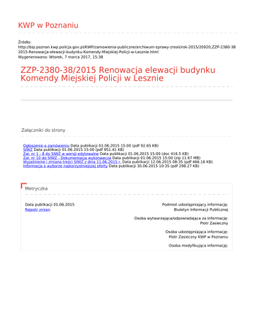 KWP w Poznaniu Źródło: http://bip.poznan.kwp.policja.gov.pl/KWP/zamowienia-publiczne/archiwum-sprawy-zreali/rok-2015/20920,ZZP-2380-38 2015-Renowacja-elewacji-budynku-Komendy-Miejskiej-Policji-w-Lesznie.html Wygenerowano: Wtorek, 7 marca 2017, 15:38 ZZP-2380-38/2015 Renowacja elewacji budynku Komendy Miejskiej Policji w Lesznie Załączniki do strony Ogłoszenie o zamówieniu Data publikacji 01.06.2015 15:00 (pdf 92.65 KB) SIWZ Data publikacji 01.06.2015 15:00 (pdf 951.41 KB) Zał. nr 1 - 8 do SIWZ w wersji edytowalne Data publikacji 01.06.2015 15:00 (doc 416.5 KB) Zał. nr 10 do SIWZ - Dokumentacja wykonawcza Data publikacji 01.06.2015 15:00 (zip 11.67 MB) Wyjaśnienie i zmiana treści SIWZ z dnia 11.06.2015 r. Data publikacji 12.06.2015 08:35 (pdf 466.16 KB) Informacja o wyborze najkorzystniejszej oferty Data publikacji 30.06.2015 10:35 (pdf 298.27 KB) Metryczka Data publikacji 01.06.2015 Rejestr zmian Podmiot udostępniający informację: Biuletyn Informacji Publicznej Osoba wytwarzająca/odpowiadająca za informację: Piotr Zasieczny Osoba udostępniająca informację: Piotr Zasieczny KWP w Poznaniu Osoba modyfikująca informację: