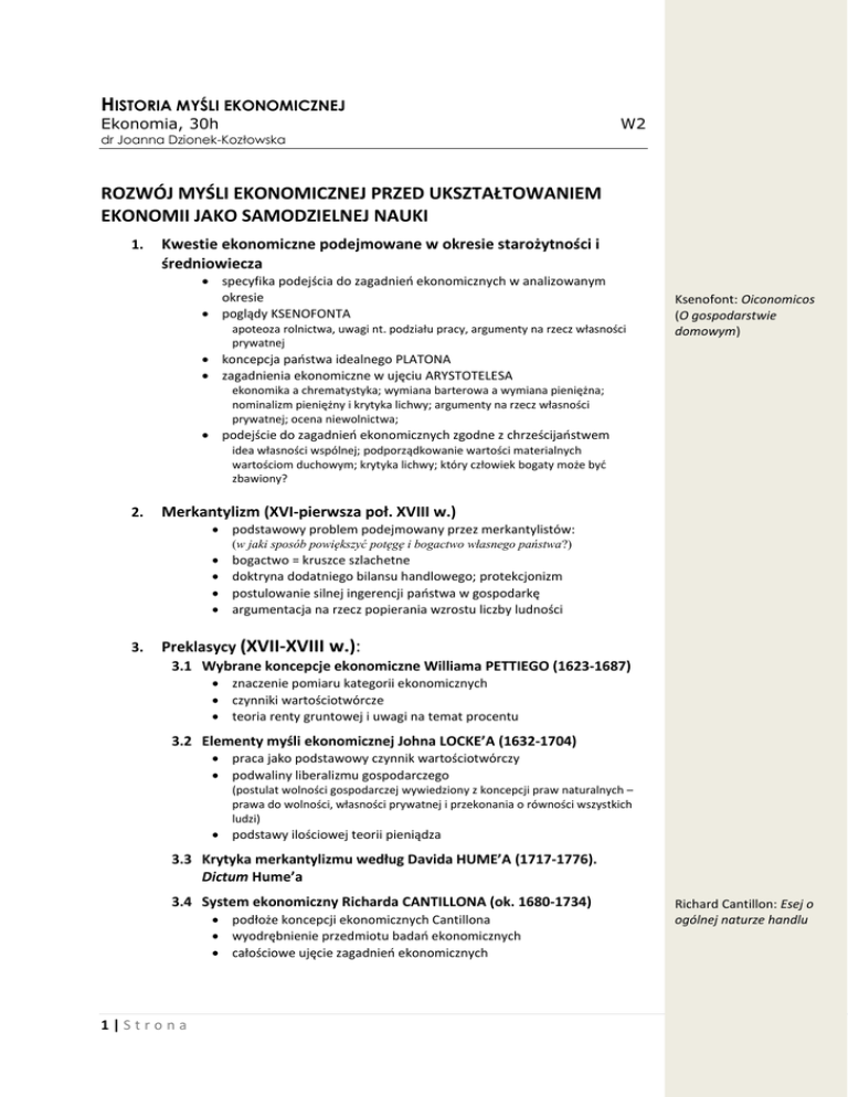 HISTORIA MYŚLI EKONOMICZNEJ Ekonomia, 30h W2 dr Joanna Dzionek-Kozłowska ROZWÓJ MYŚLI EKONOMICZNEJ PRZED UKSZTAŁTOWANIEM EKONOMII JAKO SAMODZIELNEJ NAUKI 1. Kwestie ekonomiczne podejmowane w okresie starożytności i średniowiecza specyfika podejścia do zagadnień ekonomicznych w analizowanym okresie poglądy KSENOFONTA apoteoza rolnictwa, uwagi nt. podziału pracy, argumenty na rzecz własności prywatnej Ksenofont: Oiconomicos (O gospodarstwie domowym) koncepcja państwa idealnego PLATONA zagadnienia ekonomiczne w ujęciu ARYSTOTELESA ekonomika a chrematystyka; wymiana barterowa a wymiana pieniężna; nominalizm pieniężny i krytyka lichwy; argumenty na rzecz własności prywatnej; ocena niewolnictwa; podejście do zagadnień ekonomicznych zgodne z chrześcijaństwem idea własności wspólnej; podporządkowanie wartości materialnych wartościom duchowym; krytyka lichwy; który człowiek bogaty może być zbawiony? 2. Merkantylizm (XVI-pierwsza poł. XVIII w.) podstawowy problem podejmowany przez merkantylistów: (w jaki sposób powiększyć potęgę i bogactwo własnego państwa?) 3. bogactwo = kruszce szlachetne doktryna dodatniego bilansu handlowego; protekcjonizm postulowanie silnej ingerencji państwa w gospodarkę argumentacja na rzecz popierania wzrostu liczby ludności Preklasycy (XVII-XVIII w.): 3.1 Wybrane koncepcje ekonomiczne Williama PETTIEGO (1623-1687) znaczenie pomiaru kategorii ekonomicznych czynniki wartościotwórcze teoria renty gruntowej i uwagi na temat procentu 3.2 Elementy myśli ekonomicznej Johna LOCKE’A (1632-1704) praca jako podstawowy czynnik wartościotwórczy podwaliny liberalizmu gospodarczego (postulat wolności gospodarczej wywiedziony z koncepcji praw naturalnych – prawa do wolności, własności prywatnej i przekonania o równości wszystkich ludzi) podstawy ilościowej teorii pieniądza 3.3 Krytyka merkantylizmu według Davida HUME’A (1717-1776). Dictum Hume’a 3.4 System ekonomiczny Richarda CANTILLONA (ok. 1680-1734) podłoże koncepcji ekonomicznych Cantillona wyodrębnienie przedmiotu badań ekonomicznych całościowe ujęcie zagadnień ekonomicznych 1|Strona Richard Cantillon: Esej o ogólnej naturze handlu 3.5 Pierre BOISGUILLEBERT (1646-1717) i idea równowagi w życiu gospodarczym 3.6 François QUESNAY (1694-1774) i FIZJOKRATYZM (II poł. XVIII wieku) idea porządku naturalnego a rola państwa w gospodarce; leseferyzm koncepcja dochodu czystego: ziemia jako jedyny czynnik wartościotwórczy Tablica ekonomiczna Ksenofont: Oikonomicós (Ekonomika) 2|Strona