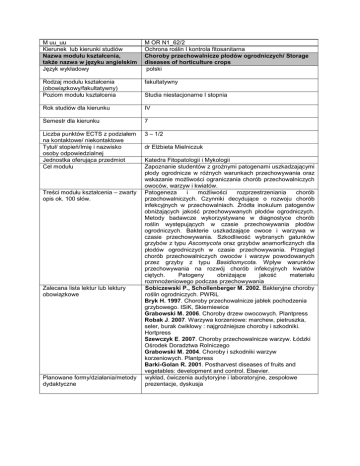 M uu_uu Kierunek lub kierunki studiów Nazwa modułu kształcenia, także nazwa w języku angielskim Język wykładowy M OR N1_62/2 Ochrona roślin I kontrola fitosanitarna Choroby przechowalnicze płodów ogrodniczych/ Storage diseases of horticulture crops polski Rodzaj modułu kształcenia (obowiązkowy/fakultatywny) Poziom modułu kształcenia fakultatywny Rok studiów dla kierunku IV Semestr dla kierunku 7 Liczba punktów ECTS z podziałem na kontaktowe/ niekontaktowe Tytuł/ stopień/Imię i nazwisko osoby odpowiedzialnej Jednostka oferująca przedmiot Cel modułu 3 – 1/2 Treści modułu kształcenia – zwarty opis ok. 100 słów. Zalecana lista lektur lub lektury obowiązkowe Planowane formy/działania/metody dydaktyczne Studia niestacjonarne I stopnia dr Elżbieta Mielniczuk Katedra Fitopatologii i Mykologii Zapoznanie studentów z groźnymi patogenami uszkadzającymi płody ogrodnicze w różnych warunkach przechowywania oraz wskazanie możliwości ograniczania chorób przechowalniczych owoców, warzyw i kwiatów. Patogeneza i możliwości rozprzestrzeniania chorób przechowalniczych. Czynniki decydujące o rozwoju chorób infekcyjnych w przechowalniach. Źródła inokulum patogenów obniżających jakość przechowywanych płodów ogrodniczych. Metody badawcze wykorzystywane w diagnostyce chorób roślin występujących w czasie przechowywania płodów ogrodniczych. Bakterie uszkadzające owoce i warzywa w czasie przechowywania. Szkodliwość wybranych gatunków grzybów z typu Ascomycota oraz grzybów anamorficznych dla płodów ogrodniczych w czasie przechowywania. Przegląd chorób przechowalniczych owoców i warzyw powodowanych przez grzyby z typu Basidiomycota. Wpływ warunków przechowywania na rozwój chorób infekcyjnych kwiatów ciętych. Patogeny obniżające jakość materiału rozmnożeniowego podczas przechowywania Sobiczewski P., Schollenberger M. 2002. Bakteryjne choroby roślin ogrodniczych. PWRiL Bryk H. 1997. Choroby przechowalnicze jabłek pochodzenia grzybowego. ISiK, Skierniewice Grabowski M. 2006. Choroby drzew owocowych. Plantpress Robak J. 2007. Warzywa korzeniowe: marchew, pietruszka, seler, burak ćwikłowy : najgroźniejsze choroby i szkodniki. Hortpress Szewczyk E. 2007. Choroby przechowalnicze warzyw. Łódzki Ośrodek Doradztwa Rolniczego Grabowski M. 2004. Choroby i szkodniki warzyw korzeniowych. Plantpress Barki-Golan R. 2001. Postharvest diseases of fruits and vegetables: development and control. Elsevier. wykład, ćwiczenia audytoryjne i laboratoryjne, zespołowe prezentacje, dyskusja