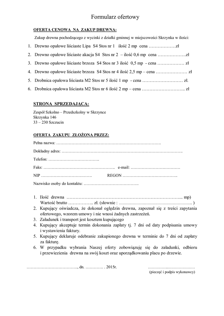 Formularz ofertowy OFERTA CENOWA NA ZAKUP DREWNA: Zakup drewna pochodzącego z wycinki z działki gminnej w miejscowości Skrzynka w ilości: 1. Drewno opałowe liściaste Lipa S4 Stos nr 1 ilość 2 mp cena ………………zł 2. Drewno opałowe liściaste akacja S4 Stos nr 2 – ilość 0,6 mp cena ……………….zł 3. Drewno opałowe liściaste brzoza S4 Stos nr 3 ilość 0,5 mp - cena ……………… zł 4. Drewno opałowe liściaste brzoza S4 Stos nr 4 ilość 2,5 mp – cena ………………… zł 5. Drobnica opałowa liściasta M2 Stos nr 5 ilość 1 mp - cena ……………………… zł. 6. Drobnica opałowa liściasta M2 Stos nr 6 ilość 2 mp – cena ……………………….. zł STRONA SPRZEDAJĄCA: Zespół Szkolno – Przedszkolny w Skrzynce Skrzynka 146 33 – 230 Szczucin OFERTA ZAKUPU ZŁOŻONA PRZEZ: Pełna nazwa: …………………………………………………………………. Dokładny adres: ……………………………………………………………………………. Telefon: ………………………………. Faks: ……………………………………………. e-mail: ……………………………… NIP ………………………………. REGON …………………………………. Nazwisko osoby do kontaktu: …………………………………. 1. Ilość drewna …………………………………………………………………... mp) Wartość brutto …………….. zł. (słownie : ………………………………………………….. ) 2. Kupujący oświadcza, że dokonał oględzin drewna, zapoznał się z treści zapytania ofertowego, wzorem umowy i nie wnosi żadnych zastrzeżeń. 3. Załadunek i transport jest kosztem kupującego 4. Kupujący akceptuje termin dokonania zapłaty tj. 7 dni od daty podpisania umowy i wystawienia faktury. 5. Kupujący deklaruje odebranie zakupionego drewna w terminie do 7 dni od zapłaty za fakturę. 6. W przypadku wybrania Naszej oferty zobowiązuję się do załadunki, odbioru i przewiezienia drewna na swój koszt oraz uporządkowaniu placu po drzewie. ………………………………., dn. …………. . 2015r. ……………..………………… (pieczęć i podpis wykonawcy)