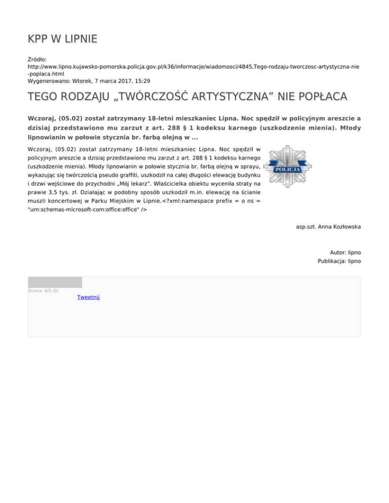 KPP W LIPNIE Źródło: http://www.lipno.kujawsko-pomorska.policja.gov.pl/k36/informacje/wiadomosci/4845,Tego-rodzaju-tworczosc-artystyczna-nie -poplaca.html Wygenerowano: Wtorek, 7 marca 2017, 15:29 TEGO RODZAJU „TWÓRCZOŚĆ ARTYSTYCZNA” NIE POPŁACA Wczoraj, (05.02) został zatrzymany 18-letni mieszkaniec Lipna. Noc spędził w policyjnym areszcie a dzisiaj przedstawiono mu zarzut z art. 288 § 1 kodeksu karnego (uszkodzenie mienia). Młody lipnowianin w połowie stycznia br. farbą olejną w ... Wczoraj, (05.02) został zatrzymany 18-letni mieszkaniec Lipna. Noc spędził w policyjnym areszcie a dzisiaj przedstawiono mu zarzut z art. 288 § 1 kodeksu karnego (uszkodzenie mienia). Młody lipnowianin w połowie stycznia br. farbą olejną w sprayu, wykazując się twórczością pseudo graffiti, uszkodził na całej długości elewację budynku i drzwi wejściowe do przychodni „Mój lekarz”. Właścicielka obiektu wyceniła straty na prawie 3,5 tys. zł. Działając w podobny sposób uszkodził m.in. elewację na ścianie muszli koncertowej w Parku Miejskim w Lipnie.<?xml:namespace prefix = o ns = "urn:schemas-microsoft-com:office:office" /> asp.szt. Anna Kozłowska Autor: lipno Publikacja: lipno Ocena: 0/5 (0) Tweetnij