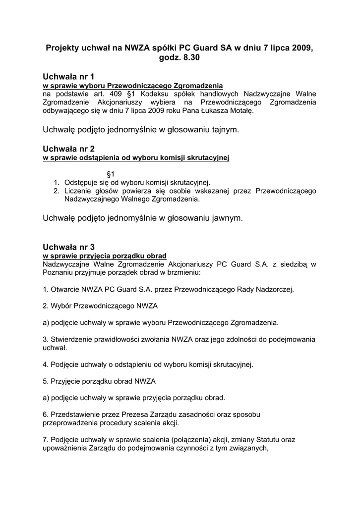 Projekty uchwał na NWZA spółki PC Guard SA w dniu 7 lipca 2009, godz. 8.30 Uchwała nr 1 w sprawie wyboru Przewodniczącego Zgromadzenia na podstawie art. 409 §1 Kodeksu spółek handlowych Nadzwyczajne Walne Zgromadzenie Akcjonariuszy wybiera na Przewodniczącego Zgromadzenia odbywającego się w dniu 7 lipca 2009 roku Pana Łukasza Motałę. Uchwałę podjęto jednomyślnie w głosowaniu tajnym. Uchwała nr 2 w sprawie odstąpienia od wyboru komisji skrutacyjnej §1 1. Odstępuje się od wyboru komisji skrutacyjnej. 2. Liczenie głosów powierza się osobie wskazanej przez Przewodniczącego Nadzwyczajnego Walnego Zgromadzenia. Uchwałę podjęto jednomyślnie w głosowaniu jawnym. Uchwała nr 3 w sprawie przyjęcia porządku obrad Nadzwyczajne Walne Zgromadzenie Akcjonariuszy PC Guard S.A. z siedzibą w Poznaniu przyjmuje porządek obrad w brzmieniu: 1. Otwarcie NWZA PC Guard S.A. przez Przewodniczącego Rady Nadzorczej. 2. Wybór Przewodniczącego NWZA a) podjęcie uchwały w sprawie wyboru Przewodniczącego Zgromadzenia. 3. Stwierdzenie prawidłowości zwołania NWZA oraz jego zdolności do podejmowania uchwał. 4. Podjęcie uchwały o odstąpieniu od wyboru komisji skrutacyjnej. 5. Przyjęcie porządku obrad NWZA a) podjęcie uchwały w sprawie przyjęcia porządku obrad. 6. Przedstawienie przez Prezesa Zarządu zasadności oraz sposobu przeprowadzenia procedury scalenia akcji. 7. Podjęcie uchwały w sprawie scalenia (połączenia) akcji, zmiany Statutu oraz upoważnienia Zarządu do podejmowania czynności z tym związanych, 8. Podjęcie uchwały w przedmiocie zmiany statutu Spółki, 9. Podjęcie uchwały w przedmiocie zmiany Regulaminu Walnego Zgromadzenia, 10. Podjęcie uchwały w przedmiocie upoważnienia Rady Nadzorczej do ustalenia tekstu jednolitego Statutu Spółki 11. Wolne głosy i wnioski. 12. Zamknięcie obrad. Uchwałę podjęto jednomyślnie w głosowaniu jawnym. Uchwała nr 4 w sprawie scalenia (połączenia) akcji, zmiany Statutu Spółki oraz upoważnienia Zarządu do podejmowania czynności z tym związanych §1 1. Nadzwyczajne Walne Zgromadzenie PC Guard SA po zapoznaniu się z wymaganiami Zarządu Giełdy Papierów Wartościowych w Warszawie S.A., który zobowiązał Spółki o niskiej wycenie pojedynczej akcji, a tym samym wysokiej zmienności kursowej, do wprowadzenia programów naprawczych zapobiegających wysokiej zmienności kursowej, postanawia przeprowadzenie operacji scalenia akcji przy zachowaniu niezmienionej wysokości kapitału zakładowego Spółki. 2. W związku z operacją scalenia akcji PC Guard SA Nadzwyczajne Walne Zgromadzenie PC Guard SA prosi akcjonariuszy PC Guard S.A. o sprawdzenie stanu posiadania akcji PC Guard S.A. oraz dostosowanie ich liczby do dnia referencyjnego wyznaczonego przez Zarząd w formie Raportu Bieżącego w taki sposób, aby posiadana liczba akcji spółki PC Guard S.A. stanowiła wielokrotność liczby 100 akcji. §2 1. Nadzwyczajne Walne Zgromadzenie PC Guard S.A. na podstawie art. 430 Kodeksu Spółek Handlowych ustala wartość nominalną akcji PC Guard S.A. każdej z serii w wysokości 1 złotych (jeden złoty) w miejsce dotychczasowej wartości nominalnej Spółki wynoszącej 0,01 złotych (jeden grosz) oraz zmniejsza się proporcjonalnie ogólną liczbę akcji PC Guard S.A. wszystkich serii 1.100.000.000 (jeden miliard sto milionów) do liczby 11.000.000 (jedenaście milionów), przy zachowaniu niezmienionej wysokości kapitału zakładowego (scalenie akcji). 2. Nadzwyczajne Walne Zgromadzenie PC Guard S.A. upoważnia Zarząd PC Guard S.A. do podejmowania wszelkich możliwych i zgodnych z obowiązującymi przepisami prawa czynności, w tym także niewymienionych w niniejszej uchwale, a zmierzających do scalenia akcji PC Guard S.A. w ten sposób, że sto akcji PC Guard S.A. o wartości nominalnej 0,01 złotych (jeden grosz) każda zostanie wymienionych na jedną akcję PC Guard S.A. o wartości nominalnej 1 (jeden) złotych. 3. Nadzwyczajne Walne Zgromadzenie PC Guard S.A. upoważnia Zarząd PC Guard S.A. do wyznaczenia dnia (dzień referencyjny) według stanu na który zostanie ustalona liczba akcji PC Guard S.A. o wartości nominalnej 0,01 złotych (jeden grosz) każda, zapisanych na poszczególnych rachunkach papierów wartościowych, w celu wyliczenia liczby akcji PC Guard S.A. o wartości 1 (jeden) złotych każda, które w związku ze scaleniem akcji PC Guard S.A. o wartości nominalnej 0,01 złotych (jeden grosz) każda, powinny zostać w ich miejsce wydane poszczególnym posiadaczom tych rachunków papierów wartościowych. 4. Nadzwyczajne Walne Zgromadzenie PC Guard S.A. upoważnia Zarząd PC Guard S.A. do dokonania wszelkich niezbędnych czynności faktycznych i prawnych związanych z rejestracją zmienionej wartości nominalnej akcji PC Guard S.A. oraz ich liczby w Krajowym Depozycie Papierów Wartościowych S.A., które to zmiany zostaną zaewidencjonowane i figurować będą w formie zapisu na indywidualnych rachunkach papierów wartościowych każdego z akcjonariuszy PC Guard S.A.. Nastąpi to za pośrednictwem systemu prowadzonego przez Krajowy Depozyt Papierów Wartościowych S.A. 5. Nadzwyczajne Walne Zgromadzenie PC Guard S.A. upoważnia Zarząd PC Guard S.A. do wystąpienia z wnioskiem do Giełdy Papierów Wartościowych w Warszawie S.A. o zawieszenie notowań giełdowych w celu przeprowadzenia scalenia (połączenia) akcji PC Guard S.A. Ze względu na konieczność wyznaczenia dnia wymiany akcji, okres zawieszenia powinien być uprzednio uzgodniony z Krajowym Depozytem Papierów Wartościowych S.A. 6. Nadzwyczajne Walne Zgromadzenie PC Guard S.A. postanawia, że ewentualne niedobory scaleniowe zostaną uzupełnione kosztem praw akcyjnych posiadanych przez Podmiot wskazany przez Zarząd (Podmiot Uzupełniający Niedobory Scaleniowe), a z którym zostanie podpisana umowa, na mocy której wskazany Podmiot zrzeknie się swoich praw akcyjnych w PC Guard SA nieodpłatnie na rzecz akcjonariuszy p
