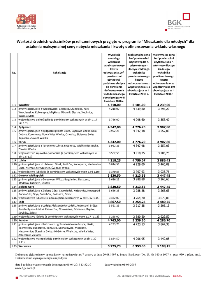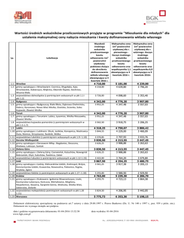 Wartości średnich wskaźników przeliczeniowych przyjęte w programie "Mieszkanie dla młodych" dla ustalenia maksymalnej ceny nabycia mieszkania i kwoty dofinansowania wkładu własnego Lp. Lokalizacja 1.1 Wrocław 1.2 gminy sąsiadujące z Wrocławiem: Czernica, Długołęka, Kąty Wrocławskie, Kobierzyce, Miękinia, Oborniki Śląskie, Siechnice, Wisznia Mała 1.3 województwo dolnośląskie (z pominięciem wskazanych w pkt 1.1 i pkt 1.2) 1.4 Bydgoszcz 1.5 gminy sąsiadujące z Bydgoszczą: Białe Błota, Dąbrowa Chełmińska, Dobrcz, Koronowo, Nowa Wieś Wielka, Osielsko, Sicienko, Solec Kujawski, Zławieś Wielka 1.6 Toruń 1.7 gminy sąsiadujące z Toruniem: Lubicz, Łysomice, Wielka Nieszawka, Zławieś Wielka 1.8 województwo kujawsko-pomorskie (z pominięciem wskazanych w pkt 1.5-1.7) 1.9 Lublin 1.10 gminy sąsiadujące z Lublinem: Głusk, Jastków, Konopnica, Niedrzwica Duża, Niemce, Strzyżewice, Świdnik, Wólka 1.11 województwo lubelskie (z pominięciem wskazanych w pkt 1.9 i 1.10) 1.12 Gorzów Wielkopolski 1.13 gminy sąsiadujące z Gorzowem Wlkp.: Bogdaniec, Deszczno, Kłodawa, Lubiszyn, Santok 1.14 Zielona Góra 1.15 gminy sąsiadujące z Zieloną Górą: Czerwieńsk, Kożuchów, Nowogród Bobrzański, Otyń, Sulechów, Świdnica, Zabór 1.16 województwo lubuskie (z pominięciem wskazanych w pkt 1.12-1.15) 1.17 Łódź 1.18 gminy sąsiadujące z Łodzią: Aleksandrów Łódzki, Andrespol, Brójce, Konstantynów Łódzki, Ksawerów, Nowosolna, Pabianice, Rzgów, Stryków, Zgierz 1.19 województwo łódzkie (z pominięciem wskazanych w pkt 1.17 i 1.18) 1.20 Kraków 1.21 gminy sąsiadujące z Krakowem: Igołomia-Wawrzeńczyce, Liszki, Kocmyrzów-Luborzyca, Koniusza, Michałowice, Mogilany, Niepołomice, Skawina, Świątniki Górne, Wieliczka, Wielka Wieś, Zabierzów, Zielonki 1.22 województwo małopolskie(z pominięciem wskazanych w pkt 1.20 1.21) 1.23 Warszawa Wysokość Maksymalna cena średniego 1m² powierzchni wskaźnika użytkowej dla r. przeliczeniowego pierwotnego kosztu iloczyn średniego odtworzenia 1m² wskaźnika powierzchni przeliczeniowego użytkowejkosztu podstawa służąca odtworzenia oraz do określenia współczynnika 1,1 dofinansowania obowiązująca w II wkładu własnego kwartale 2016 r. obowiązująca w II kwartale 2016 r. 4 710,00 5 181,00 4 218,00 4 639,80 Maksymalna cena 1m² powierzchni użytkowej dla r. wtórnego -iloczyn średniego wskaźnika przeliczeniowego kosztu odtworzenia oraz współczynnika 0,9 obowiązująca w II kwartale 2016r. 4 239,00 3 796,20 3 726,00 4 098,60 3 353,40 4 342,00 3 952,25 4 776,20 4 347,48 3 907,80 3 557,03 4 342,00 3 952,25 4 776,20 4 347,48 3 907,80 3 557,03 3 562,50 3 918,75 3 206,25 4 318,25 3 844,55 4 750,07 4 229,00 3 886,42 3 460,09 3 370,85 3 830,50 3 626,25 3 707,93 4 213,55 3 988,88 3 033,76 3 447,45 3 263,63 3 830,50 3 626,25 4 213,55 3 988,88 3 447,45 3 263,63 3 422,00 3 867,50 3 561,25 3 764,20 4 254,25 3 917,38 3 079,80 3 480,75 3 205,13 3 255,00 4 763,00 4 293,75 3 580,50 5 239,30 4 723,13 2 929,50 4 286,70 3 864,38 3 824,50 4 206,95 3 442,05 5 775,73 6 353,30 5 198,15 Dokument elektroniczny sporządzony na podstawie art.7 ustawy z dnia 29.08.1997 r. Prawo Bankowe (Dz. U. Nr 140 z 1997 r., poz. 939 z późn. zm.). Dokument nie wymaga stempla ani podpisu. data i godzina wygenerowania dokumentu: 01-04-2016 13:32:30 www.bgk.com.pl data wydruku: 01-04-2016 1.24 gminy sąsiadujące z Warszawą: Izabelin, Jabłonna, Józefów, Konstancin-Jeziorna, Lesznowola, Łomianki, Marki, Michałowice, Nieporęt, Ożarów Mazowiecki, Piaseczno, Piastów, Raszyn, Stare Babice, Sulejówek, Wiązowna, Ząbki, Zielonka 1.25 województwo mazowieckie (z pominięciem wskazanych w pkt 1.23 i 1.24) 1.26 Opole 1.27 gminy sąsiadujące z Opolem: Chrząstowice, Dąbrowa, Dobrzeń Wielki, Komprachcice, Łubniany, Prószków, Tarnów Opolski, Turawa 1.28 województwo opolskie (z pominięciem wskazanych w pkt 1.26 i 1.27) 1.29 Rzeszów 1.30 gminy sąsiadujące z Rzeszowem: Boguchwała, Chmielnik, Głogów Małopolski, Krasne, Lubenia, Świlcza, Trzebownisko, Tyczyn 1.31 województwo podkarpackie (z pominięciem wskazanych w pkt 1.29 i 1.30) 1.32 Białystok 1.33 gminy sąsiadujące z Białymstokiem: Choroszcz, Dobrzyniewo Duże, Juchnowiec Kościelny, Supraśl, Wasilków, Zabłudów 1.34 województwo podlaskie (z pominięciem wskazanych w pkt 1.32 i 1.33) 1.35 Gdańsk 1.36 gminy sąsiadujące z Gdańskiem: Cedry Wielkie, Gdynia, Kolbudy, Pruszcz Gdański, Sopot, Stegna, Żukowo 1.37 województwo pomorskie (z pominięciem wskazanych w pkt 1.35 i 1.36) 1.38 Katowice 1.39 gminy sąsiadujące z Katowicami: Chorzów, Czeladź, Lędziny, Mikołów, Mysłowice, Siemianowice Śląskie, Sosnowiec, Ruda Śląska, Tychy 1.40 województwo śląskie (z pominięciem wskazanych w pkt 1.38 i 1.39) 1.41 Kielce 1.42 gminy sąsiadujące z Kielcami: Daleszyce, Górno, Masłów, Miedziana Góra, Morawica, Piekoszów, Sitkówka-Nowiny 1.43 województwo świętokrzyskie (z pominięciem wskazanych w pkt 1.41 i 1.42) 1.44 Olsztyn 1.45 gminy sąsiadujące z Olsztynem: Barczewo, Dywity, Gietrzwałd, Jonkowo, Purda, Stawiguda 1.46 województwo warmińsko-mazurskie (z pominięciem wskazanych w pkt 1.44 i 1.45) 1.47 Poznań 1.48 gminy sąsiadujące z Poznaniem: Czerwonak, Dopiewo, Kleszczewo, Komorniki, Kórnik, Luboń, Mosina, Rokietnica, Suchy Las, Swarzędz, Tarnowo Podgórne 1.49 województwo wielkopolskie (z pominięciem wskazanych w pkt 1.47 i 1.48) 1.50 Szczecin 1.51 gminy sąsiadujące ze Szczecinem: Dobra (Szczecińska), Goleniów, Gryfino, Kobylanka, Kołbaskowo, Police, Stare Czarnowo 1.52 województwo zachodniopomorskie (z pominięciem wskazanych w pkt 1.50 i 1.51) 4 162,60 4 578,86 3 746,34 3 468,84 3 815,72 3 121,95 3 625,50 3 444,00 3 988,05 3 788,40 3 262,95 3 099,60 3 262,50 4 167,50 3 899,75 3 588,75 4 584,25 4 289,73 2 936,25 3 750,75 3 509,78 3 632,00 3 995,20 3 268,80 4 288,00 4 025,75 4 716,80 4 428,33 3 859,20 3 623,18 3 763,50 4 139,8