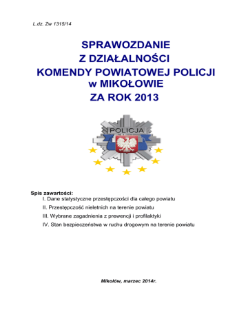 L.dz. Zw 1315/14 SPRAWOZDANIE Z DZIAŁALNOŚCI KOMENDY POWIATOWEJ POLICJI w MIKOŁOWIE ZA ROK 2013 Spis zawartości: I. Dane statystyczne przestępczości dla całego powiatu II. Przestępczość nieletnich na terenie powiatu III. Wybrane zagadnienia z prewencji i profilaktyki IV. Stan bezpieczeństwa w ruchu drogowym na terenie powiatu Mikołów, marzec 2014r. I. Dane statystyczne przestępczości dla całego powiatu W 2013 roku na terenie powiatu mikołowskiego wszczęto 1816 spraw o przestępstwa, co do całego roku 2012 stanowi odsetek 92,19%. Przestępczość ogółem (wszczęcia) 10000 wszczęcia 1971 1883 wykrycie powiat % 1970 wykr. śr. woj. % 1816 1000 100 59,3 63,6 58,5 64,4 67,8 66,3 67,7 67,6 2010 2011 2012 2013 10 1 W 2013 roku wskaźnik wykrywalności przestępstw kształtował się na poziomie 67,7% i był niższy od wykrywalności w 2012 o 0,1%, lecz był wyższy od średniej wojewódzkiej o 0,1%. Szczegółowe zestawienie dotyczące ilości wszczętych przestępstw w 2013 roku i latach wcześniejszych przestępstw przedstawia poniższa tabela. Kategoria przestępstw 2013 2012 2011 2010 2013 -2012 Zabójstwo 1 1 0 1 0 Zgwałcenie 0 3 2 2 -3 Kradzież cudzej rzeczy 399 466 543 434 -67 -w tym samochodu 47 54 57 41 -7 Kradzież z włamaniem 260 276 291 294 -16 Rozbój i wymuszenie rozbójnicze 25 36 33 294 -11 2013 2012 2011 2010 Kategoria przestępstw - w tym rozbój z bronią 0 1 2013 -2012 2 4 -1 ** Niep rawi dłow e wyra żeni e ** ** Niep rawi dłow e wyra żeni e ** -84 Razem wym. przestępstwa ** Niep rawi dłow 753 e wyra żeni e ** Uszczerbek na zdrowiu 31 31 41 41 0 Bójka lub pobicie 14 25 21 26 -11 Uszkodzenie rzeczy 76 153 159 157 -77 Przestępstwo p-ko funk. publ. ---- 16 16 16 -16 Ust. o przeciwdz. narkomanii 36 40 37 33 -4 Przestępstwa drogowe 292 312 334 295 -20 Ogółem przestępstwa 1816 1970 1971 1883 -154 Ustalono sprawców 783 919 -133 Wykrywalność ogółem (%) 67,7 67,8 58,5 59,3 -0,1 977 844 II. Przestępczość nieletnich na terenie powiatu W analizowanym okresie na terenie powiatu mikołowskiego ujawniono 80 nieletnich, którzy popełnili łącznie 473 czyny karalne co stanowi 26,04% wszystkich stwierdzonych w 2013 roku przestępstw na terenie powiatu. Szczegółowe zestawienie dotyczące ilości stwierdzonych w 2013 roku i latach wcześniejszych czynów karalnych popełnionych przez nieletnich, przedstawia poniższa tabela. W ostatniej kolumnie przedstawiono różnicę ilości stwierdzonych w 2013 roku czynów karalnych i nieletnich sprawców w odniesieniu do roku 2012. czyny nieletnich sprawcy nieletni 2013 473 80 2012 462 98 2011 256 97 2010 212 102 2013-2012 11 -18 Z powyższych danych wynika, iż w 2013 roku mniejsza liczba nieletnich dopuściła się podobnej ilości czynów karalnych niż w roku ubiegłym. Przestępczość nieletnich 500 473 462 450 400 350 300 czyny niel. sprawcy niel. 256 250 212 200 150 102 98 97 100 80 50 0 2010 2011 2012 2013 Wybrane kategorie przestępstw popełnianych przez nieletnich: wybrane kategorie przestępstw uszczerbek na zdrowiu bójka lub pobicie kradzież cudzej rzeczy kradzież z włamaniem kradzież pojazdu rozbój, kradzież rozbójnicza, wymuszenie rozbójnicze uszkodzenie rzeczy Ustawa o przeciwdziałaniu narkomanii Inne razem przestępstwa o charakterze kryminalnym czyny nieletni 12 10 13 7 0 11 12 11 3 0 171 11 3 201 35 452 1 9 17 75 Najczęściej popełnianymi czynami karalnymi przez nieletnich były czyny związane z przestępczością z ustawy o przeciwdziałaniu narkomanii (201 czynów, które popełniło 9 nieletnich) oraz przestępczością rozbójniczą (171 czynów popełnionych przez 11 nieletnich) Kolejną grupa najczęściej popełnianych czynów karalnych przez nieletnich były kradzieże oraz czyny w wyniku których dochodziło do uszczerbku na zdrowiu III. Wybrane zagadnienia z prewencji i profilaktyki Wydział Prewencji Komendy Powiatowej Policji w Mikołowie oraz podległe Komisariaty Policji w Łaziskach Górnych i Orzeszu realizują szereg długofalowych programów i działań profilaktycznych, które skierowane są do dzieci i młodzieży. Odbiorcami działań edukacyjnych i informacyjnych są wszystkie grupy wiekowe, począwszy od dzieci w wieku przedszkolnym po młodzież kończącą szkołę średnią. Mają one na celu między innymi podnoszenie szeroko rozumianej świadomości prawnej młodych osób oraz wskazanie im prawidłowych form i zasad zachowania, a także możliwości unikania potencjalnych zagrożeń mogących wystąpić w danym środowisku. Istotnym elementem edukacji jest zaznajomienie nieletnich ze sposobem postępowania w przypadkach, gdy staną się ofiarą przestępstwa. Powyższe cele funkcjonariusze realizują między innymi poprzez prelekcje i spotkania, które realizowane są w szkołach. Z myślą o dzieciach przedszkolnych i ich rodzicach w 2013 roku kontynuowany był program profilaktyczny „Bezpieczny Świat Dziecka”, który na bieżąco realizowany jest w przedszkolach powiatu mikołowskiego z udziałem maskotki mikołowskiej policji - „Sierżanta Hektora”. Podobnie jak w latach wcześniejszych policjanci organizowali cyklicznie następujące akcje: ,,Bezpieczne wakacje”, ,,Bezpieczne ferie”, ,,Bezpieczna droga do szkoły”, do których to akcji angażowani byli również funkcjonariusze Wydziału Ruchu Drogowego KPP w Mikołowie. W 2013 r. w KPP Mikołów zainicjowano cykl spotkań dla dzieci które odbywały się w Sądzie Rejonowym w Mikołowie. Podczas których Przewodniczący Wydziału III Rodzinnego i Nieletnich wraz z funkcjonariuszem Policji przybliżała dzieciom funkcjonowanie Sądu oraz inicjowano scenki na sali rozpraw z ich udziałem (odpowiedzialność prawna nieletnich). W 2013 roku na terenie Komendy Powiatowej Policji w Mikołowie z inicjatywy Policjantów przeprowadzono również cykl spotkań profilaktycznych w trakcie których dzieci oraz nauczyciele mogli zapoznać się z pracą policjantów. Ponadto w 2013 roku kont