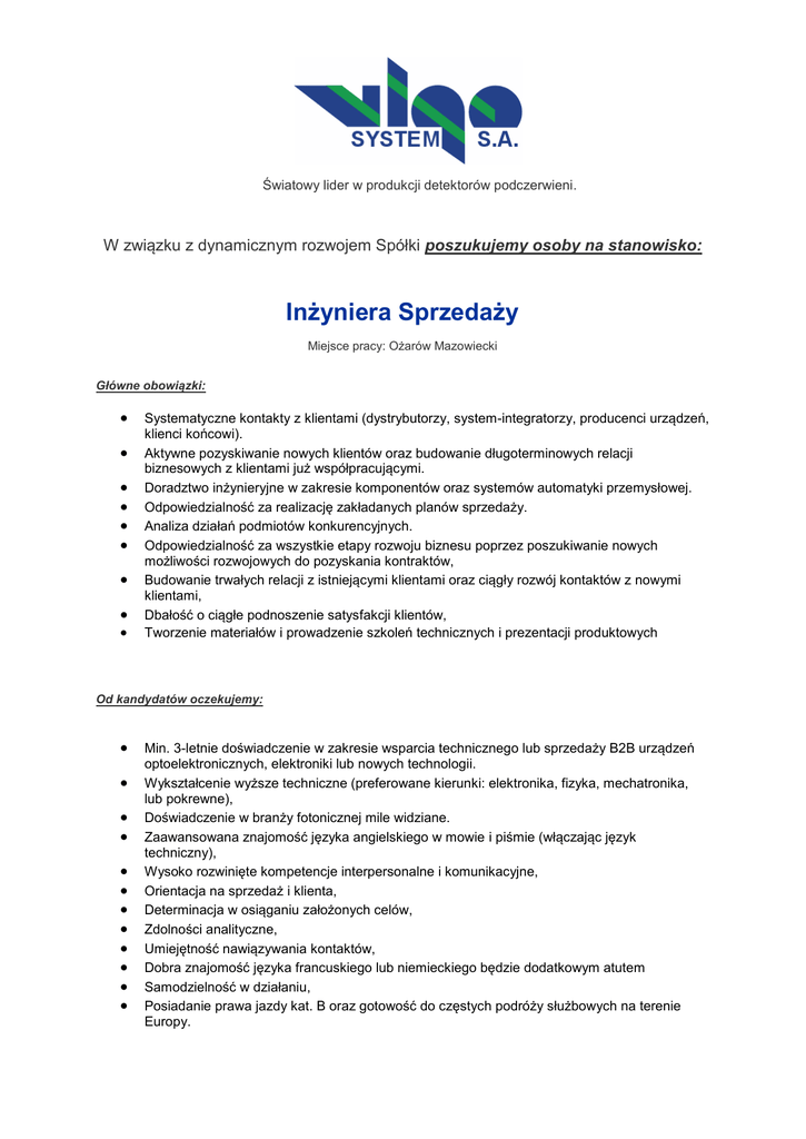 Światowy lider w produkcji detektorów podczerwieni. W związku z dynamicznym rozwojem Spółki poszukujemy osoby na stanowisko: Inżyniera Sprzedaży Miejsce pracy: Ożarów Mazowiecki Główne obowiązki: Systematyczne kontakty z klientami (dystrybutorzy, system-integratorzy, producenci urządzeń, klienci końcowi). Aktywne pozyskiwanie nowych klientów oraz budowanie długoterminowych relacji biznesowych z klientami już współpracującymi. Doradztwo inżynieryjne w zakresie komponentów oraz systemów automatyki przemysłowej. Odpowiedzialność za realizację zakładanych planów sprzedaży. Analiza działań podmiotów konkurencyjnych. Odpowiedzialność za wszystkie etapy rozwoju biznesu poprzez poszukiwanie nowych możliwości rozwojowych do pozyskania kontraktów, Budowanie trwałych relacji z istniejącymi klientami oraz ciągły rozwój kontaktów z nowymi klientami, Dbałość o ciągłe podnoszenie satysfakcji klientów, Tworzenie materiałów i prowadzenie szkoleń technicznych i prezentacji produktowych Od kandydatów oczekujemy: Min. 3-letnie doświadczenie w zakresie wsparcia technicznego lub sprzedaży B2B urządzeń optoelektronicznych, elektroniki lub nowych technologii. Wykształcenie wyższe techniczne (preferowane kierunki: elektronika, fizyka, mechatronika, lub pokrewne), Doświadczenie w branży fotonicznej mile widziane. Zaawansowana znajomość języka angielskiego w mowie i piśmie (włączając język techniczny), Wysoko rozwinięte kompetencje interpersonalne i komunikacyjne, Orientacja na sprzedaż i klienta, Determinacja w osiąganiu założonych celów, Zdolności analityczne, Umiejętność nawiązywania kontaktów, Dobra znajomość języka francuskiego lub niemieckiego będzie dodatkowym atutem Samodzielność w działaniu, Posiadanie prawa jazdy kat. B oraz gotowość do częstych podróży służbowych na terenie Europy. Oferujemy: Pracę w firmie o wysokich standardach Motywujący system wynagrodzeń Bogaty pakiet socjalny (m. in. ubezpieczenie medyczne, ubezpieczenie na życie, pakiet Multisport) Szanse zdobycia doświadczenia zawodowego w firmie innowacyjnej CV wraz z listem motywacyjnym prosimy przesyłać na adres [email protected] z tytułem „inżynier sprzedaży” Prosimy o dopisanie następującej klauzuli: "Wyrażam zgodę na przetwarzanie moich danych osobowych zawartych w mojej ofercie pracy dla potrzeb niezbędnych do realizacji procesu rekrutacji (zgodnie z Ustawą z dn. 29.08.97 o Ochronie danych Osobowych Dz. U. nr 133 poz. 883 z póżn. zm.)"