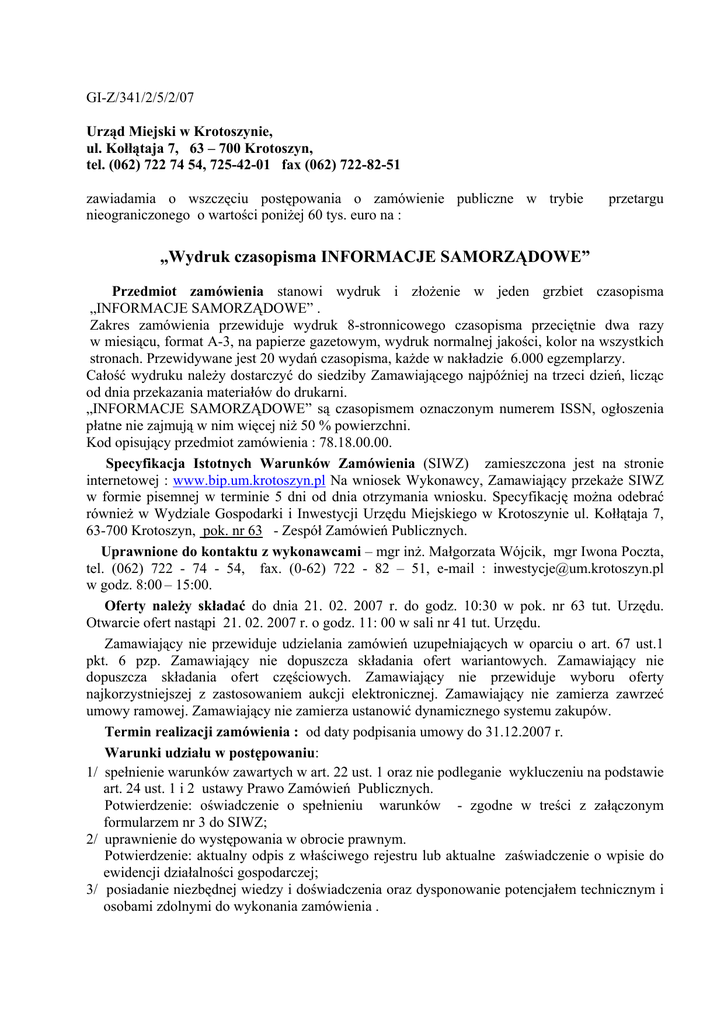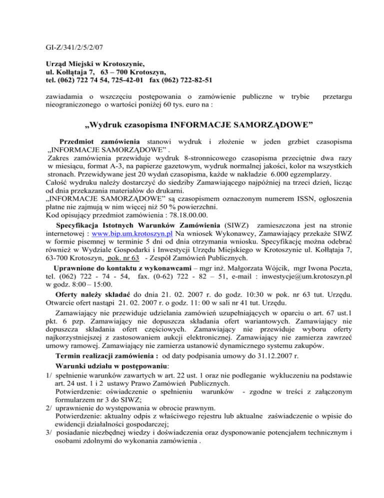 GI-Z/341/2/5/2/07 Urząd Miejski w Krotoszynie, ul. Kołłątaja 7, 63 – 700 Krotoszyn, tel. (062) 722 74 54, 725-42-01 fax (062) 722-82-51 zawiadamia o wszczęciu postępowania o zamówienie publiczne w trybie nieograniczonego o wartości poniżej 60 tys. euro na : przetargu „Wydruk czasopisma INFORMACJE SAMORZĄDOWE” Przedmiot zamówienia stanowi wydruk i złożenie w jeden grzbiet czasopisma „INFORMACJE SAMORZĄDOWE” . Zakres zamówienia przewiduje wydruk 8-stronnicowego czasopisma przeciętnie dwa razy w miesiącu, format A-3, na papierze gazetowym, wydruk normalnej jakości, kolor na wszystkich stronach. Przewidywane jest 20 wydań czasopisma, każde w nakładzie 6.000 egzemplarzy. Całość wydruku należy dostarczyć do siedziby Zamawiającego najpóźniej na trzeci dzień, licząc od dnia przekazania materiałów do drukarni. „INFORMACJE SAMORZĄDOWE” są czasopismem oznaczonym numerem ISSN, ogłoszenia płatne nie zajmują w nim więcej niż 50 % powierzchni. Kod opisujący przedmiot zamówienia : 78.18.00.00. Specyfikacja Istotnych Warunków Zamówienia (SIWZ) zamieszczona jest na stronie internetowej : www.bip.um.krotoszyn.pl Na wniosek Wykonawcy, Zamawiający przekaże SIWZ w formie pisemnej w terminie 5 dni od dnia otrzymania wniosku. Specyfikację można odebrać również w Wydziale Gospodarki i Inwestycji Urzędu Miejskiego w Krotoszynie ul. Kołłątaja 7, 63-700 Krotoszyn, pok. nr 63 - Zespół Zamówień Publicznych. Uprawnione do kontaktu z wykonawcami – mgr inż. Małgorzata Wójcik, mgr Iwona Poczta, tel. (062) 722 - 74 - 54, fax. (0-62) 722 - 82 – 51, e-mail : [email protected] w godz. 8:00 – 15:00. Oferty należy składać do dnia 21. 02. 2007 r. do godz. 10:30 w pok. nr 63 tut. Urzędu. Otwarcie ofert nastąpi 21. 02. 2007 r. o godz. 11: 00 w sali nr 41 tut. Urzędu. Zamawiający nie przewiduje udzielania zamówień uzupełniających w oparciu o art. 67 ust.1 pkt. 6 pzp. Zamawiający nie dopuszcza składania ofert wariantowych. Zamawiający nie dopuszcza składania ofert częściowych. Zamawiający nie przewiduje wyboru oferty najkorzystniejszej z zastosowaniem aukcji elektronicznej. Zamawiający nie zamierza zawrzeć umowy ramowej. Zamawiający nie zamierza ustanowić dynamicznego systemu zakupów. Termin realizacji zamówienia : od daty podpisania umowy do 31.12.2007 r. Warunki udziału w postępowaniu: 1/ spełnienie warunków zawartych w art. 22 ust. 1 oraz nie podleganie wykluczeniu na podstawie art. 24 ust. 1 i 2 ustawy Prawo Zamówień Publicznych. Potwierdzenie: oświadczenie o spełnieniu warunków - zgodne w treści z załączonym formularzem nr 3 do SIWZ; 2/ uprawnienie do występowania w obrocie prawnym. Potwierdzenie: aktualny odpis z właściwego rejestru lub aktualne zaświadczenie o wpisie do ewidencji działalności gospodarczej; 3/ posiadanie niezbędnej wiedzy i doświadczenia oraz dysponowanie potencjałem technicznym i osobami zdolnymi do wykonania zamówienia . 2 Potwierdzenie: przedstawienie wykazu min. 5 zadań z ostatnich 3 lat (przed dniem wszczęcia postępowania o udzielenie zamówienia, a jeżeli okres prowadzenia działalności jest krótszy – w tym okresie), polegających na wydruku kolorowych gazet, czasopism samorządowych lub branżowych w nakładzie co najmniej 1.000 egzemplarzy, w tym co najmniej jedno w nakładzie 6.000 egzemplarzy. Zamawiający oceni spełnianie warunków udziału w postępowaniu metodą spełnia/nie spełnia na podstawie dokumentów określonych w SIWZ. Wadium nie jest wymagane Termin związania ofertą – 30 dni od upływu terminu do składania ofert. Kryterium wyboru ofert i jego znaczenie : cena – 100 %. Krotoszyn, 2007-02-13 Z upoważnienia Burmistrza Z-ca Burmistrza / --/ Franciszek Marszałek