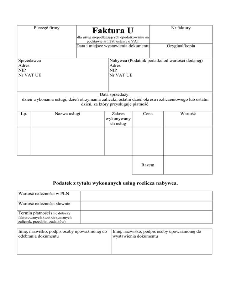 Pieczęć firmy Nr faktury Faktura U dla usług niepodlegających opodatkowaniu na podstawie art. 28b ustawy o VAT Data i miejsce wystawienia dokumentu Sprzedawca Adres NIP Nr VAT UE Oryginał/kopia Nabywca (Podatnik podatku od wartości dodanej) Adres NIP Nr VAT UE Data sprzedaży: dzień wykonania usługi, dzień otrzymania zaliczki, ostatni dzień okresu rozliczeniowego lub ostatni dzień, za który przysługuje płatność Lp. Nazwa usługi Zakres wykonywany ch usług Cena Wartość Razem Podatek z tytułu wykonanych usług rozlicza nabywca. Wartość należności w PLN Wartość należności słownie Termin płatności (nie dotyczy fakturowanych kwot otrzymanych zaliczek, przedpłat, zadatków) Imię, nazwisko, podpis osoby upoważnionej do odebrania dokumentu Imię, nazwisko, podpis osoby upoważnionej do wystawienia dokumentu