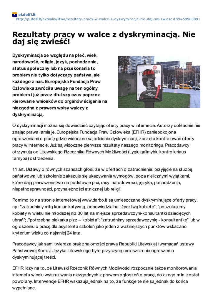 pl.delfi.lt http://pl.delfi.lt/aktualia/litwa/rezultaty-pracy-w-walce-z-dyskryminacja-nie-daj-sie-zwiesc.d?id=59983091 Rezultaty pracy w walce z dyskryminacją. Nie daj się zwieść! Dyskryminacja ze względu na płeć, wiek, narodowość, religię, język, pochodzenie, st at us społeczny lub na przekonania t o problem nie t ylko dot yczący państ wa, ale każdego z nas. Europejska Fundacja Praw Człowieka zwróciła uwagę na t en ogólny problem i już przez dłuższy czas poprzez kierowanie wniosków do organów ścigania na niezgodne z prawem wpisy walczy z dyskryminacją. O dyskryminacji można się dowiedzieć czytając oferty pracy w internecie. Autorzy dokładnie nie znając prawa łamią je. Europejska Fundacja Praw Człowieka (EFHR) zaniepokojona ogłoszeniami o pracę gdzie widoczne są odcienie dyskryminacji, zaczęła kontrolować oferty pracy w internecie. Już są widoczne pierwsze rezultaty naszego monitoringu. Pracodawcy otrzymują od Litewskiego Rzecznika Równych Możliwości (Lygių galimybių kontrolieriaus tarnyba) ostrzeżenia. 11 art. Ustawy o równych szansach głosi, że w ofertach o zatrudnienie, przyjęcie na służbę państwową lub szkolenie zakazuje się ukazywania wymogów, poza nielicznymi wyjątkami, które dają pierwszeństwo na podstawie płci, rasy, narodowości, języka, pochodzenia, niepełnosprawności, przynależności etnicznej lub religii. Pomimo to na stronie internetowej www.darbo.lt są umieszczane dyskryminujące oferty pracy, np.: "zatrudnimy miłą komunikatywną, odpowiedzialną i życzliwą kobietę”; "poszukujemy kobiety w wieku nie młodszej niż 30 lat na miejsce sprzedawczyni-konsultantki dziecięcych ubrań”; ,"potrzebna piekarka pizz – kobieta“; "zatrudnimy sprzedawczynię - konsultantkę” lub w ogłoszeniu o pracę dla asystenta szkoleń jako jeden z ważniejszych punktów wskazano kryterium wieku co najmniej 24 lata. Pracodawcy jak sami twierdzą brak znajomości prawa Republiki Litewskiej i wymagań ustawy Państwowej Komisji Języka Litewskiego było przyczyną umieszczenia ogłoszeń o dyskryminującej treści. EFHR liczy na to, że Litewski Rzecznik Równych Możliwości rozpocznie także monitorowania internetu w celu wyszukiwania niezgodnych z prawem ogłoszeń o pracę, do czego m.in. został powołany. Interwencje EFHR wskazują jednak na to, że funkcje te nie są jednak do końca wypełniane. Aby pomóc przedsiębiorcom EFHR przygotowała odpowiednią ulotkę, która w praktyczny sposób tłumaczy jak zgodnie z prawem przygotować ogłoszenie o pracę. Fundacja zachęca do zgłaszania informacji o anonsach o pracę, które mogą naruszać prawo. Dziękujemy wszystkim tym, którzy już przesłali do nas sygnały o tego typu anonsach. Zachęcamy do współpracy. Wszelkie informacje opublikowane na DELFI zabrania się publikować na innych portalach internetowych, w mediach papierowych lub w inny sposób rozpowszechniać bez zgody DELFI. Jeśli zgoda DELFI zostanie uzyskana, trzeba obowiązkowo podać DELFI jako źródło.