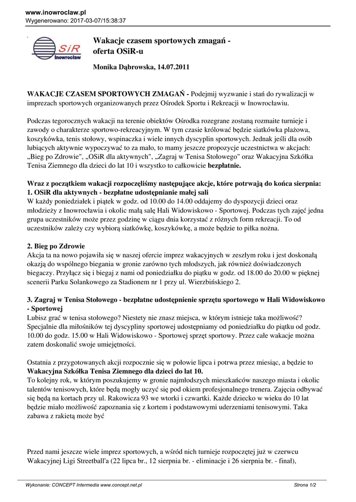 www.inowroclaw.pl Wygenerowano: 2017-03-07/15:38:37 Wakacje czasem sportowych zmagań oferta OSiR-u Monika Dąbrowska, 14.07.2011 WAKACJE CZASEM SPORTOWYCH ZMAGAŃ - Podejmij wyzwanie i stań do rywalizacji w imprezach sportowych organizowanych przez Ośrodek Sportu i Rekreacji w Inowrocławiu. Podczas tegorocznych wakacji na terenie obiektów Ośrodka rozegrane zostaną rozmaite turnieje i zawody o charakterze sportowo-rekreacyjnym. W tym czasie królować będzie siatkówka plażowa, koszykówka, tenis stołowy, wspinaczka i wiele innych dyscyplin sportowych. Jednak jeśli dla osób lubiących aktywnie wypoczywać to za mało, to mamy jeszcze propozycje uczestnictwa w akcjach: „Bieg po Zdrowie", „OSiR dla aktywnych", „Zagraj w Tenisa Stołowego" oraz Wakacyjna Szkółka Tenisa Ziemnego dla dzieci do lat 10 i wszystko to całkowicie bezpłatnie. Wraz z początkiem wakacji rozpoczęliśmy następujące akcje, które potrwają do końca sierpnia: 1. OSiR dla aktywnych - bezpłatne udostępnianie małej sali W każdy poniedziałek i piątek w godz. od 10.00 do 14.00 oddajemy do dyspozycji dzieci oraz młodzieży z Inowrocławia i okolic małą salę Hali Widowiskowo - Sportowej. Podczas tych zajęć jedna grupa uczestników może przez godzinę w ciągu dnia korzystać z różnych form rekreacji. To od uczestników zależy czy wybiorą siatkówkę, koszykówkę, a może będzie to piłka nożna. 2. Bieg po Zdrowie Akcja ta na nowo pojawiła się w naszej ofercie imprez wakacyjnych w zeszłym roku i jest doskonałą okazją do wspólnego biegania w gronie zarówno tych młodszych, jak również doświadczonych biegaczy. Przyłącz się i biegaj z nami od poniedziałku do piątku w godz. od 18.00 do 20.00 w pięknej scenerii Parku Solankowego za Stadionem nr 1 przy ul. Wierzbińskiego 2. 3. Zagraj w Tenisa Stołowego - bezpłatne udostępnienie sprzętu sportowego w Hali Widowiskowo - Sportowej Lubisz grać w tenisa stołowego? Niestety nie znasz miejsca, w którym istnieje taka możliwość? Specjalnie dla miłośników tej dyscypliny sportowej udostępniamy od poniedziałku do piątku od godz. 10.00 do godz. 15.00 w Hali Widowiskowo - Sportowej sprzęt sportowy. Przez całe wakacje można zatem doskonalić swoje umiejętności. Ostatnia z przygotowanych akcji rozpocznie się w połowie lipca i potrwa przez miesiąc, a będzie to Wakacyjna Szkółka Tenisa Ziemnego dla dzieci do lat 10. To kolejny rok, w którym poszukujemy w gronie najmłodszych mieszkańców naszego miasta i okolic talentów tenisowych, które będą mogły uczyć się pod okiem profesjonalnego trenera. Zajęcia odbywać się będą na kortach przy ul. Rakowicza 93 we wtorki i czwartki. Każde dziecko w wieku do 10 lat będzie miało możliwość zapoznania się z kortem i podstawowymi uderzeniami tenisowymi. Taka zabawa z rakietą może być Przed nami jeszcze wiele imprez sportowych, a wśród nich turnieje rozpoczętej już w czerwcu Wakacyjnej Ligi Streetball'a (22 lipca br., 12 sierpnia br. - eliminacje i 26 sierpnia br. - finał), Wykonanie: CONCEPT Intermedia www.concept.net.pl Strona 1/2 www.inowroclaw.pl Wygenerowano: 2017-03-07/15:38:37 Wakacyjne Turnieje Siatkówki Plażowej - 16 i 30 lipca br., Turniej gier świetlicowych - 19 lipca br. oraz Zawody wspinaczkowe w dniu 27 lipca br., które zakończą cykl imprez w ramach wakacji z OSiR w miesiącu lipcu. Chcesz poznać szczegóły, odwiedź stronę internetową www.osir.inowroclaw.info.pl lub zadzwoń tel. 52 35 55 355. Zapisz się już dziś w Sekcji Marketingu i Organizacji Imprez Ośrodka Sportu i Rekreacji w Inowrocławiu, Hala Widowiskowo - Sportowa przy al. Niepodległości 4, pokój 221, II piętro lub telefonicznie. Wykonanie: CONCEPT Intermedia www.concept.net.pl Strona 2/2