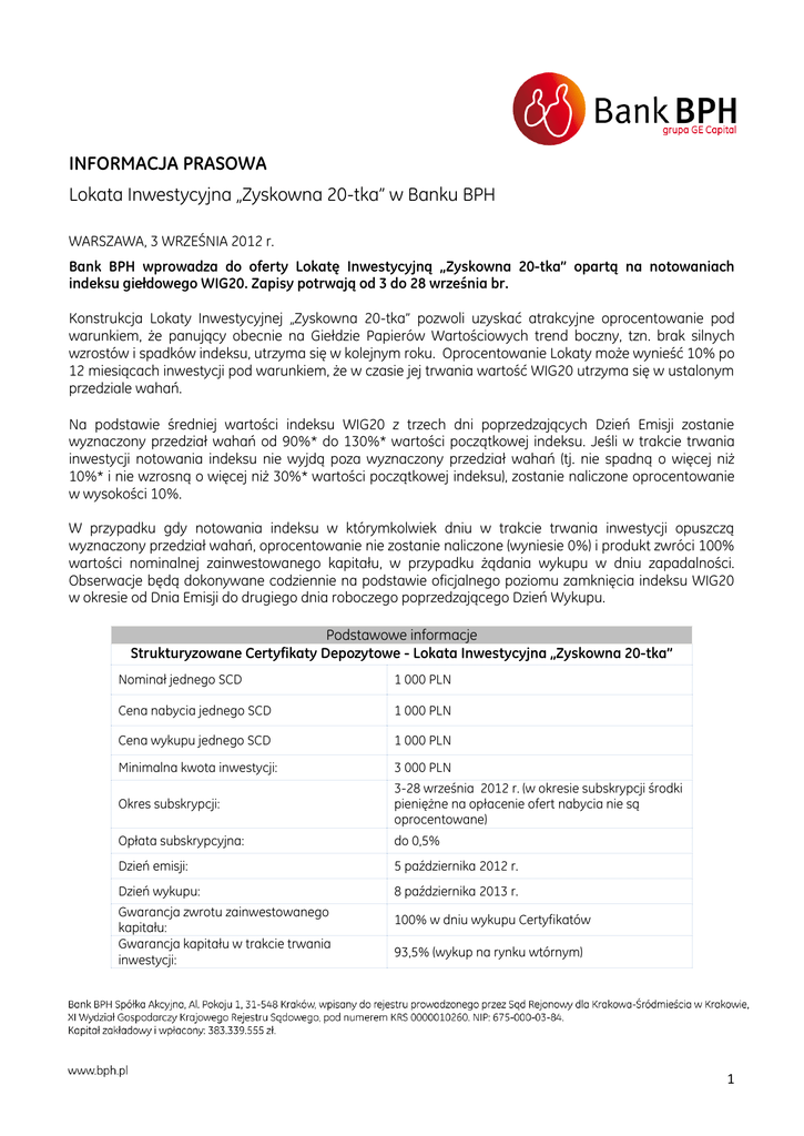 INFORMACJA PRASOWA Lokata Inwestycyjna „Zyskowna 20-tka” w Banku BPH WARSZAWA, 3 WRZEŚNIA 2012 r. Bank BPH wprowadza do oferty Lokatę Inwestycyjną „Zyskowna 20-tka” opartą na notowaniach indeksu giełdowego WIG20. Zapisy potrwają od 3 do 28 września br. Konstrukcja Lokaty Inwestycyjnej „Zyskowna 20-tka” pozwoli uzyskać atrakcyjne oprocentowanie pod warunkiem, że panujący obecnie na Giełdzie Papierów Wartościowych trend boczny, tzn. brak silnych wzrostów i spadków indeksu, utrzyma się w kolejnym roku. Oprocentowanie Lokaty może wynieść 10% po 12 miesiącach inwestycji pod warunkiem, że w czasie jej trwania wartość WIG20 utrzyma się w ustalonym przedziale wahań. Na podstawie średniej wartości indeksu WIG20 z trzech dni poprzedzających Dzień Emisji zostanie wyznaczony przedział wahań od 90%* do 130%* wartości początkowej indeksu. Jeśli w trakcie trwania inwestycji notowania indeksu nie wyjdą poza wyznaczony przedział wahań (tj. nie spadną o więcej niż 10%* i nie wzrosną o więcej niż 30%* wartości początkowej indeksu), zostanie naliczone oprocentowanie w wysokości 10%. W przypadku gdy notowania indeksu w którymkolwiek dniu w trakcie trwania inwestycji opuszczą wyznaczony przedział wahań, oprocentowanie nie zostanie naliczone (wyniesie 0%) i produkt zwróci 100% wartości nominalnej zainwestowanego kapitału, w przypadku żądania wykupu w dniu zapadalności. Obserwacje będą dokonywane codziennie na podstawie oficjalnego poziomu zamknięcia indeksu WIG20 w okresie od Dnia Emisji do drugiego dnia roboczego poprzedzającego Dzień Wykupu. Podstawowe informacje Strukturyzowane Certyfikaty Depozytowe - Lokata Inwestycyjna „Zyskowna 20-tka” Pakiet Premium Profit Banku BPH Nominał jednego SCD 1 000 PLN Cena nabycia jednego SCD 1 000 PLN Cena wykupu jednego SCD 1 000 PLN Minimalna kwota inwestycji: 3 000 PLN Okres subskrypcji: 3-28 września 2012 r. (w okresie subskrypcji środki pieniężne na opłacenie ofert nabycia nie są oprocentowane) Opłata subskrypcyjna: do 0,5% Dzień emisji: 5 października 2012 r. Dzień wykupu: 8 października 2013 r. Gwarancja zwrotu zainwestowanego kapitału: Gwarancja kapitału w trakcie trwania inwestycji: 100% w dniu wykupu Certyfikatów 93,5% (wykup na rynku wtórnym) 1 Odsetki z Lokaty Inwestycyjnej „ Zyskowna 20-tka” podlegają standardowemu opodatkowaniu od zysków kapitałowych. Środki ulokowane na Lokacie Inwestycyjnej „ Zyskowna 20-tka” są objęte 100% ochroną BFG do kwoty 100 tys. EUR. Dla zdeponowanych w okresie subskrypcji środków nie są naliczane odsetki. Inwestowanie w strukturyzowane certyfikaty depozytowe niesie ze sobą ryzyko inwestycyjne i możliwość utraty części zainwestowanego kapitału w przypadku rezygnacji Klienta z produktu, przed terminem jego zapadalności. W takim wypadku kapitał jest chroniony na poziomie 93,5 % wartości nominalnej. Więcej informacji na temat produktu oraz związanych z nim ryzyk można znaleźć w Ogólnych Warunkach Emisji na stronie: www.inwestycje.bph.pl. Zapisy będą przyjmowane we wszystkich oddziałach Banku BPH na terenie całego kraju. Warunkiem subskrypcji jest posiadanie lub otwarcie bezpłatnego konta oszczędnościowego bądź konta osobistego w Banku BPH. Dodatkowych informacji na temat subskrypcji udzielają Doradcy Klienta. Więcej informacji na stronie www.inwestycje.bph.pl oraz infolinii 0 801 406 406 lub 0 58 300 70 69. * Emitent może w dniu emisji rozszerzyć przedział wahań do maksymalnie od 85% do 135% wartości początkowej indeksu. *** Bank BPH oferuje swoje produkty i usługi Klientom indywidualnym, małym i średnim przedsiębiorstwom oraz Klientom korporacyjnym. Bogata oferta Banku zawiera m.in.: kredyty, w tym gotówkowe i hipoteczne, konta osobiste, rachunki oszczędnościowe i lokaty oraz karty kredytowe. Bank BPH prowadzi również działalność w zakresie zintegrowanych usług maklerskich, bankowości skarbowej oraz zarządzania aktywami poprzez spółkę zależną BPH TFI. Klienci Banku mogą korzystać z sieci blisko 300 oddziałów własnych, a także placówek partnerskich i agencji uniwersalnych, jak również z nowoczesnej bankowości internetowej oraz telefonicznej. Bank BPH jest obecny na polskim rynku od ponad 20 lat. Jest spółką publiczną notowaną na Giełdzie Papierów Wartościowych w Warszawie i wchodzi w skład Indeksu Respect. Siedzibą prawną Banku BPH jest Kraków, biuro centrali znajduje się w Warszawie, a główne centra operacyjne w Gdańsku i Krakowie. Bank BPH wchodzi w skład grupy kapitałowej GE, jednej z największych korporacji na świecie. Katarzyna Ewert, Specjalista ds. Public Relations Departament Public Relations Bank BPH e-mail: [email protected] Telefon: +48 22 531 86 28 2