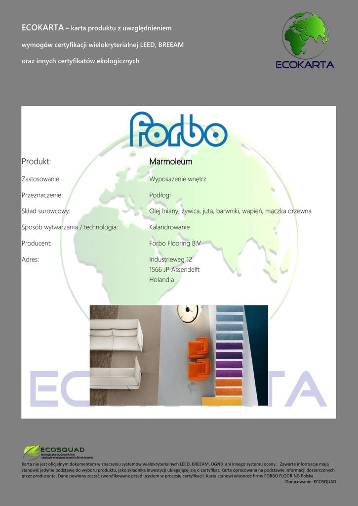 ECOKARTA – karta produktu z uwzględnieniem wymogów certyfikacji wielokryterialnej LEED, BREEAM oraz innych certyfikatów ekologicznych Produkt: Marmoleum Zastosowanie: Wyposażenie wnętrz Przeznaczenie: Podłogi Skład surowcowy: Olej lniany, żywica, juta, barwniki, wapień, mączka drzewna Sposób wytwarzania / technologia: Kalandrowanie Producent: Forbo Flooring B.V Adres: Industrieweg 12 1566 JP Assendelft Holandia Karta nie jest oficjalnym dokumentem w znaczeniu systemów wielokryterialnych LEED, BREEAM, DGNB ani innego systemu oceny. Zawarte informacje mają stanowić jedynie podstawę do wyboru produktu, jako składnika inwestycji ubiegającej się o certyfikat. Karta opracowana na podstawie informacji dostarczonych przez producenta. Dane powinny zostać zweryfikowane przed użyciem w procesie certyfikacji. Karta stanowi własność firmy FORBO FLOORING Polska. Opracowanie: ECOSQUAD ECOKARTA – karta produktu z uwzględnieniem wymogów certyfikacji wielokryterialnej LEED, BREEAM oraz innych certyfikatów ekologicznych Marmoleum to najbardziej ekologiczna wykładzina na świecie wytwarzana w 97% z surowców naturalnych, z których 72% jest odnawialne (proces trwa około 10 lat). Sercem Marmoleum jest len, z nasion którego powstaje olej lniany – kluczowy surowiec linoleum. Marmoleum zawiera 43% recyklatów, co redukuje potrzebę pozyskiwania surowców naturalnych. Marmoleum nie posiada żadnych dodatków poprawiających wygląd, podwyższających profil ekologiczny czy ulepszających elastyczność i stabilność wymiarową. Atutem Marmoleum jest naturalna bakteriostatyczność, łatwość pielęgnacji i trwałość. Marmoleum posiada 30 razy niższą zawartość Lotnych Związków Organicznych, niż ta wymagana przez normę europejską oraz o 50 % niższą emisję CO2 w porównaniu do innych wykładzin elastycznych. To jedyna elastyczna wykładzina na rynku, która uzyskała aprobatę Allergy UK. Forbo oferuje największe wzornictwo na rynku – ponad 300 kolorów w 12 różnych strukturach – co sprawia, że jest to materiał podłogowy do każdego pomieszczenia. Marmoleum cenione jest od lat w służbie zdrowia, placówkach edukacyjnych, salach sportowych, ale również w placówkach handlowych i biurach. Karta nie jest oficjalnym dokumentem w znaczeniu systemów wielokryterialnych LEED, BREEAM, DGNB ani innego systemu oceny. Zawarte informacje mają stanowić jedynie podstawę do wyboru produktu, jako składnika inwestycji ubiegającej się o certyfikat. Karta opracowana na podstawie informacji dostarczonych przez producenta. Dane powinny zostać zweryfikowane przed użyciem w procesie certyfikacji. Karta stanowi własność firmy FORBO FLOORING Polska. Opracowanie: ECOSQUAD ECOKARTA – karta produktu z uwzględnieniem wymogów certyfikacji wielokryterialnej LEED, BREEAM oraz innych certyfikatów ekologicznych Zawartość materiałów Materiał pochodzący z recyklingu został określony zgodnie z pochodzących z recyklingu definicją normy ISO 14021. Zawartość materiałów pochodzących z recyklingu podana jest w %. Zgodnie z wymogami LEED NC oraz LEED CS możliwe jest uzyskanie 1 lub 2 punktów w kredycie MR4 jeżeli zawartość produktów pochodzących z recyklingu post-konsumenckiego oraz pre-konsumenckiego wynosi odpowiednio 10% lub 20% całkowitego kosztu materiałów użytych w projekcie. Zawartość w produkcie 43% Zawartość materiałów Procentowa zawartość materiału nadającego się do recyklingu możliwych do recyklingu w gotowym produkcie. Produkt może być poddany recyklingowi w całości lub po uprzednim przygotowaniu. Zawartość w produkcie: 72% Zużycie energii pierwotnej Produkt jest wytwarzany przy użyciu 100% energii ze źródeł i energii odnawialnej: odnawialnych. Karta nie jest oficjalnym dokumentem w znaczeniu systemów wielokryterialnych LEED, BREEAM, DGNB ani innego systemu oceny. Zawarte informacje mają stanowić jedynie podstawę do wyboru produktu, jako składnika inwestycji ubiegającej się o certyfikat. Karta opracowana na podstawie informacji dostarczonych przez producenta. Dane powinny zostać zweryfikowane przed użyciem w procesie certyfikacji. Karta stanowi własność firmy FORBO FLOORING Polska. Opracowanie: ECOSQUAD ECOKARTA – karta produktu z uwzględnieniem wymogów certyfikacji wielokryterialnej LEED, BREEAM oraz innych certyfikatów ekologicznych Miejsce wytwarzania: Assendelft, Holandia Pochodzenie materiałów składowych: Len, olej lniany – USA, Kanada, Europa Pozostałe komponenty – USA, Kanada, Europa Zgodnie z wymaganiami certyfikacji wielokryterialnej LEED punkty za użycie produktów regionalnych można uzyskać w przypadku, gdy co najmniej 10% całkowitego kosztu materiałów użytych w projekcie stanowią materiały regionalne, czyli pozyskane, wytwarzane lub odzyskane w promieniu 500 mil ( ok. 804 km) od miejsca budowy. Możliwe jest uzyskanie odpowiednio: 1 pkt – 10% oraz 2 pkt – 20%. W LEED v4 punkty mogą być pomnożone x2 jeżeli materiały regionalne są pozyskiwane, wytwarzane lub odzyskane w promieniu 100 mil ( 160 km ). Karta nie jest oficjalnym dokumentem w znaczeniu systemów wielokryterialnych LEED, BREEAM, DGNB ani innego systemu oceny. Zawarte informacje mają stanowić jedynie podstawę do wyboru produktu, jako składnika inwestycji ubiegającej się o certyfikat. Karta opracowana na podstawie informacji dostarczonych przez producenta. Dane powinny zostać zweryfikowane przed użyciem w procesie certyfikacji. Karta stanowi własność firmy FORBO FLOORING Polska. Opracowanie: ECOSQUAD ECOKARTA – karta produktu z uwzględnieniem wymogów certyfikacji wielokryterialnej LEED, BREEAM oraz innych certyfikatów ekologicznych Wpływ na jakość powietrza Pomimo, iż sam produkt pozostaje bez wpływu na jakość we wnętrzach: powietrza we wnętrzach, kleje i substancje użyte do montażu mogą zawierać substancje wpływające na jakość powietrza. Dotyczy to zwłaszcza klejów i usz