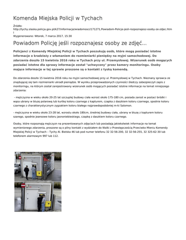 Komenda Miejska Policji w Tychach Źródło: http://tychy.slaska.policja.gov.pl/k27/informacje/wiadomosci/171271,Powiadom-Policje-jesli-rozpoznajesz-osoby-ze-zdjec.htm l Wygenerowano: Wtorek, 7 marca 2017, 15:30 Powiadom Policję jeśli rozpoznajesz osoby ze zdjęć... Policjanci z Komendy Miejskiej Policji w Tychach poszukują osób, które mogą posiadać istotne informacje o kradzieży z włamaniem do rozmieniarki pieniędzy na myjni samochodowej. Do zdarzenia doszło 15 kwietnia 2016 roku w Tychach przy ul. Przemysłowej. Wizerunek osób mogących posiadać istotne dla sprawy informacje został "uchwycony" przez kamery monitoringu. Osoby mające informacje w tej sprawie proszone są o kontakt z tyską komendą. Do zdarzenia doszło 15 kwietnia 2016 roku na myjni samochodowej przy ul. Przemysłowej w Tychach. Nieznany sprawca ze znajdującej się tam rozmieniarki ukradł pieniądze. W wyniku przeprowadzonych czynności śledczy zabezpieczyli zapis z monitoringu, na którym został zarejestrowany wizerunek osób mogących posiadać istotne informacje na temat niniejszego zdarzenia: - mężczyzna w wieku około 20-25 lat szczuplej budowy ciała wzrost około 175-180 cm, posiada zarost w postaci bródki i wąsa ubrany w bluzę polarową lub kurtkę koloru czarnego z kapturem, czapka z daszkiem koloru czarnego, spodnie koloru czarnego z charakterystycznym zygzakiem koloru białego najprawdopodobniej m-ki Salomon. - mężczyzna w wieku około 23-28 lat, wzrostu około 180cm, średniej budowy ciała, ubrany w bluzę z kapturem koloru szarego, spodnie jeansowe koloru jasnoniebieskiego, czapkę z daszkiem koloru czarnego. Osoby, które rozpoznają mężczyzn na prezentowanych zdjęciach lub posiadają jakiekolwiek informacje na temat wymienionego zdarzenia, proszone są o pilny kontakt z wydziałem do Walki z Przestępczością Przeciwko Mieniu Komendy Miejskiej Policji w Tychach – Tychy Al. Bielska 46 lub pod numer telefonu 32 32-56-200, 32 32-56-255, 32 325-62-30 lub telefonem alarmowym 997 lub 112. Ocena: 4.4/5 (11) Tweetnij